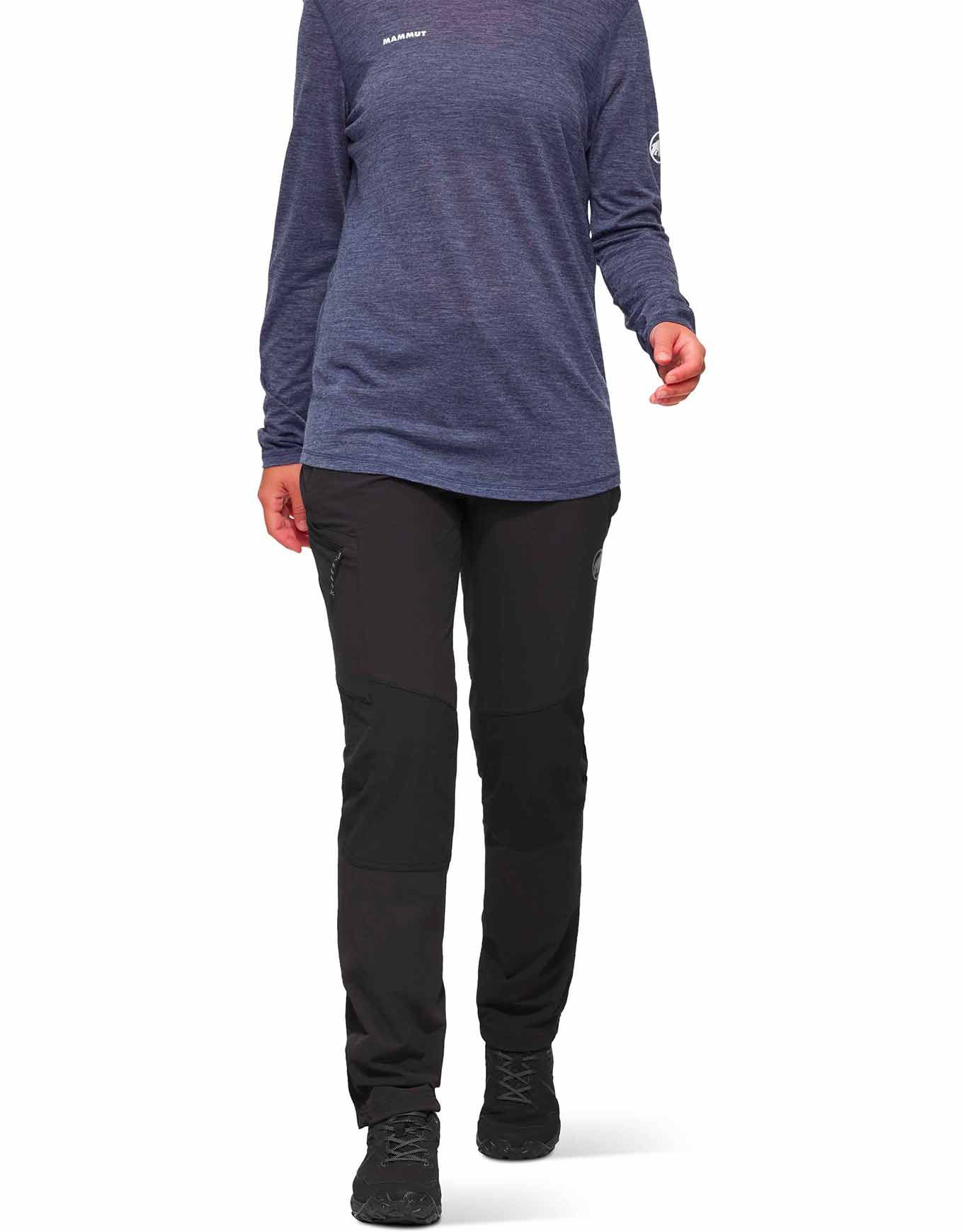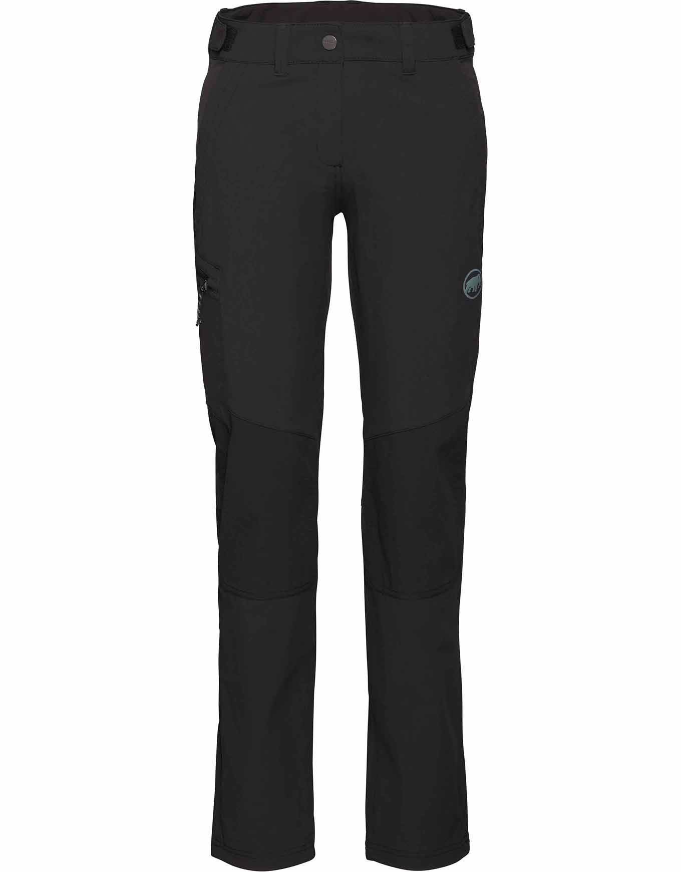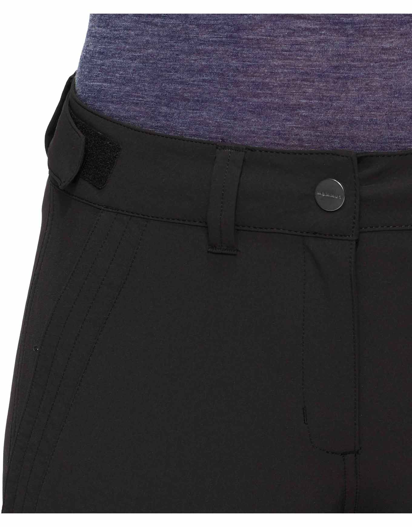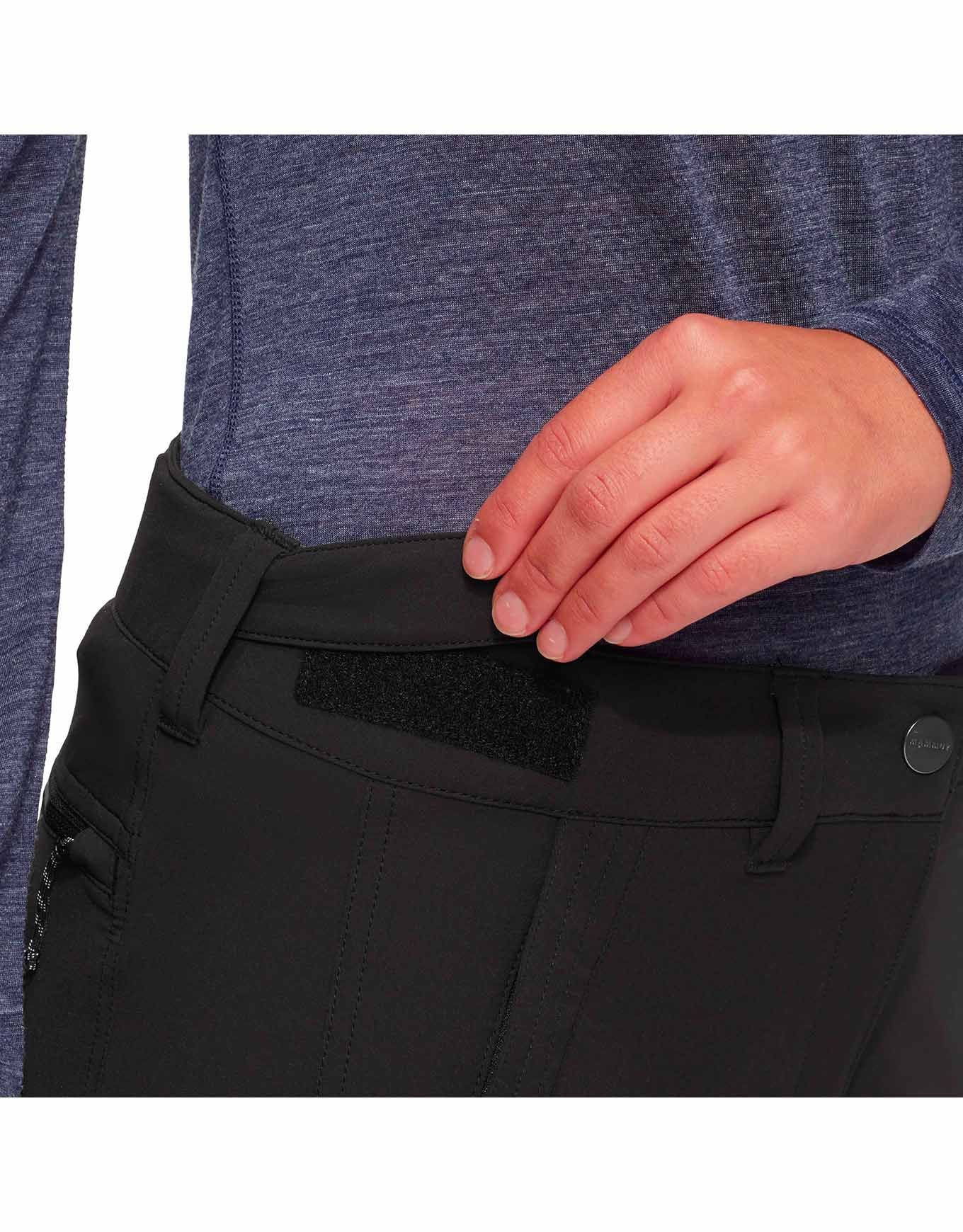 Mammut Runbold Guide SO Pants Black : pantalon de randonnée femme en softshell élastique, renforts ripstop aux genoux, 4 poches zippées et ceinture ajustable extérieure pour liberté de mouvement et protection.