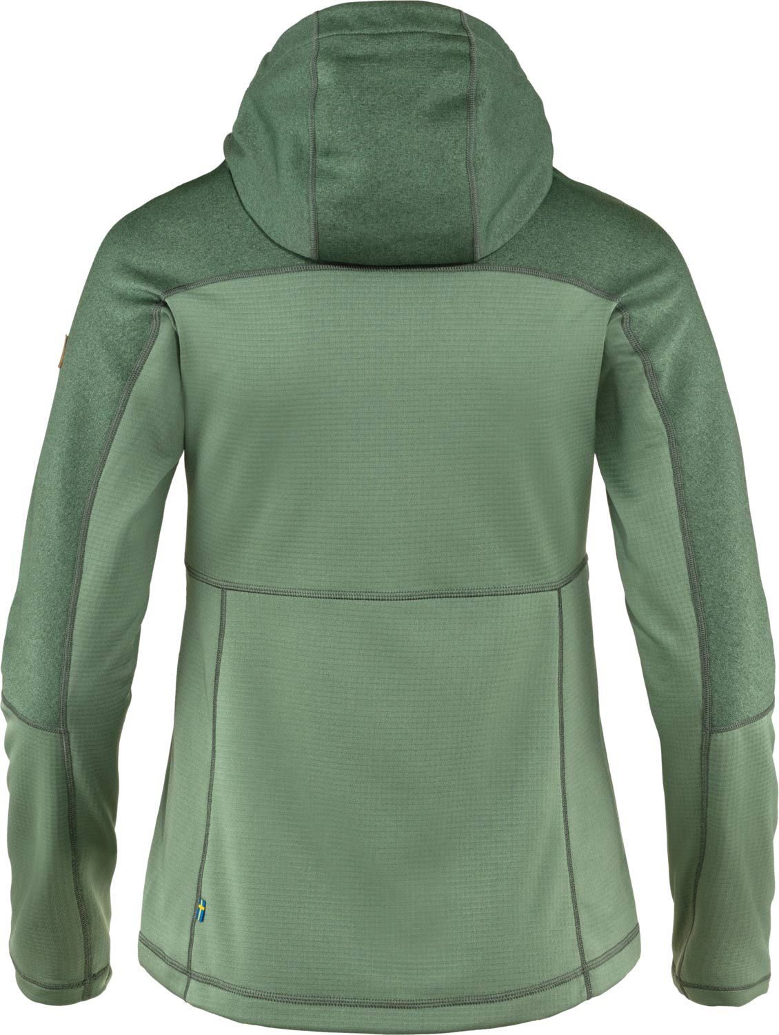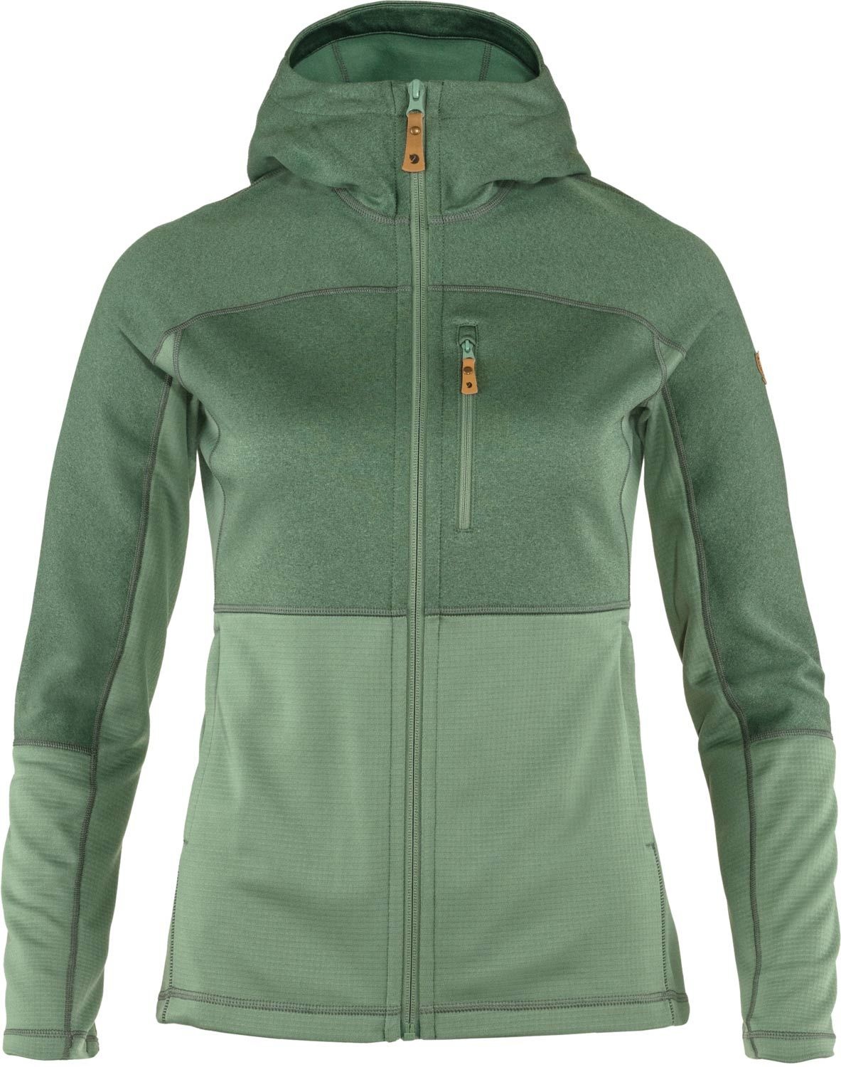La polaire Fjällräven Abisko Trail Fleece Patina Green pour femme allie chaleur légère et séchage rapide grâce à ses deux tissus souples, se glisse facilement sous une veste et se ferme intégralement par zip avec poche poitrine sécurisée.