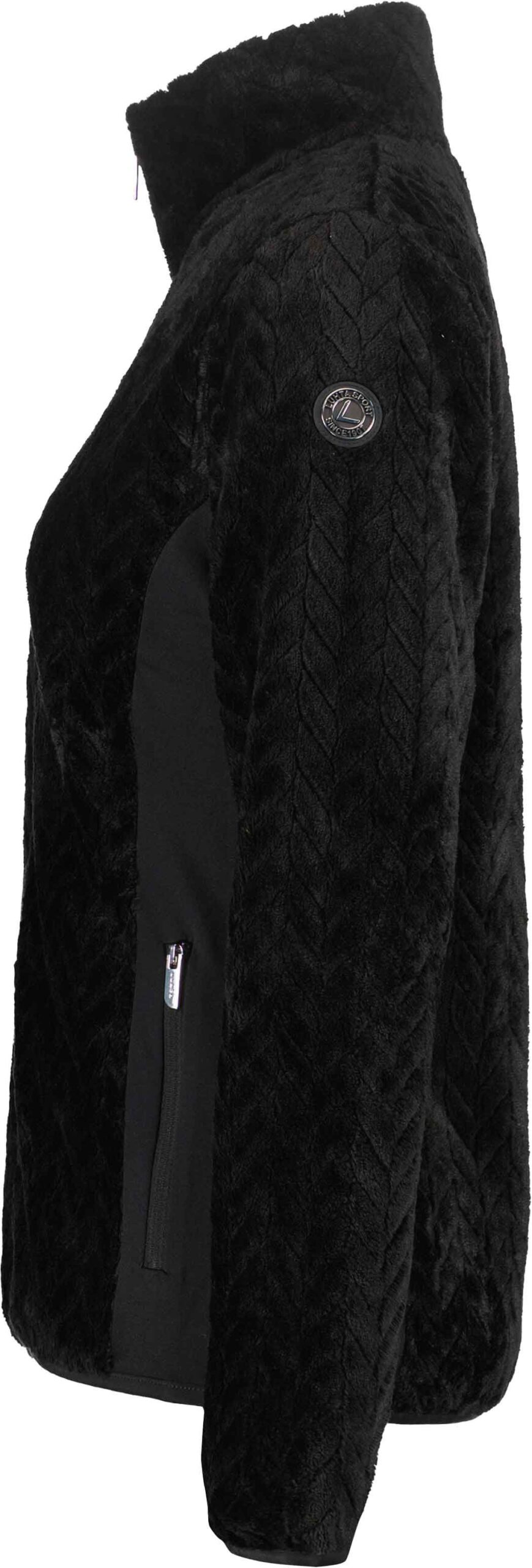 Polka Ikaala Luhta femme : polaire stretch à fausse fourrure chevron, col montant, biais élastiqué et poches zippées pour chaleur urbaine.