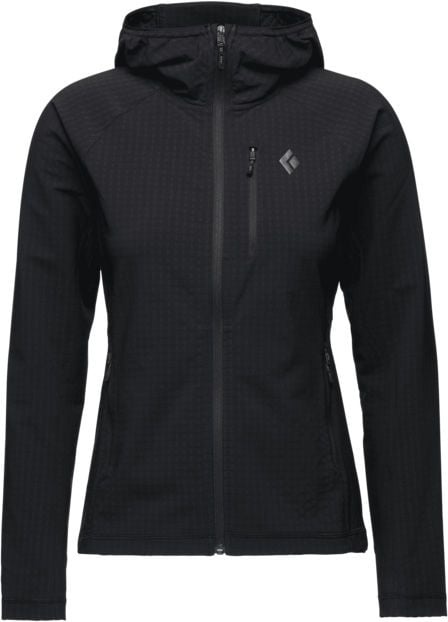 Black Diamond Storm Full Zip Hoody Black : couche intermédiaire femme coupe-vent stretch avec traitement DWR, dos quadrillé chaud et respirant, se range dans sa poche avec passant mousqueton.