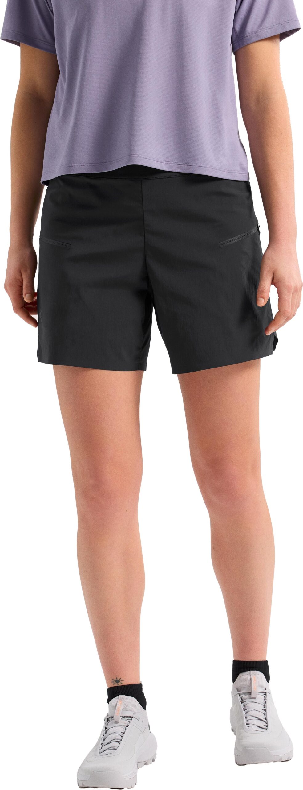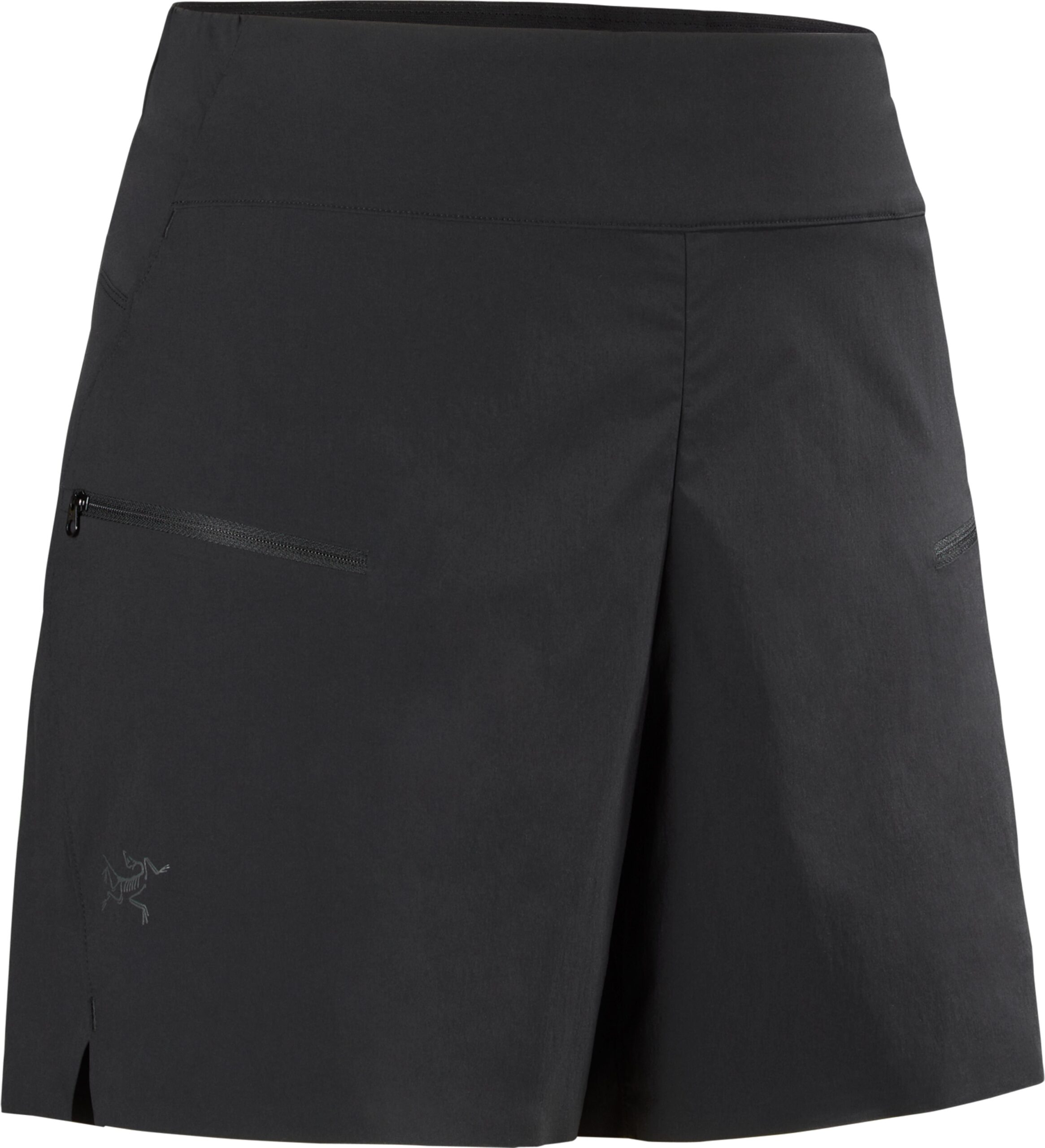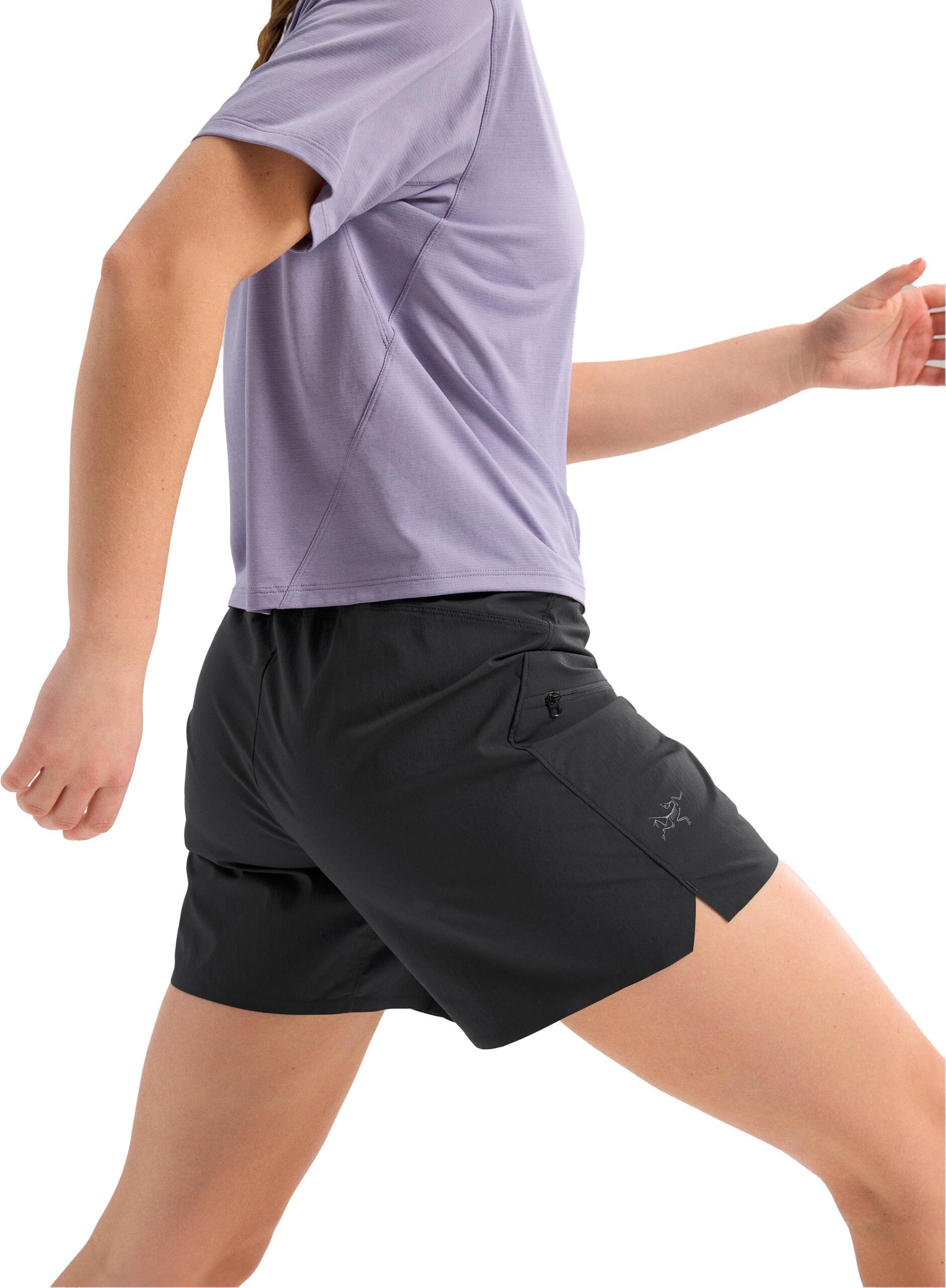 Short Arc’teryx Aestas Short Black femme en tissu Teslin™ léger, respirant et déperlant pour la course en montagne, avec taille ajustée et poches zippées cuisses.