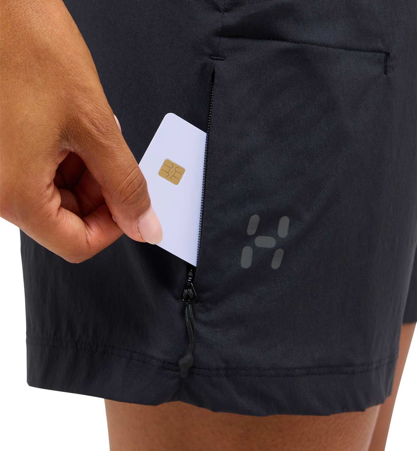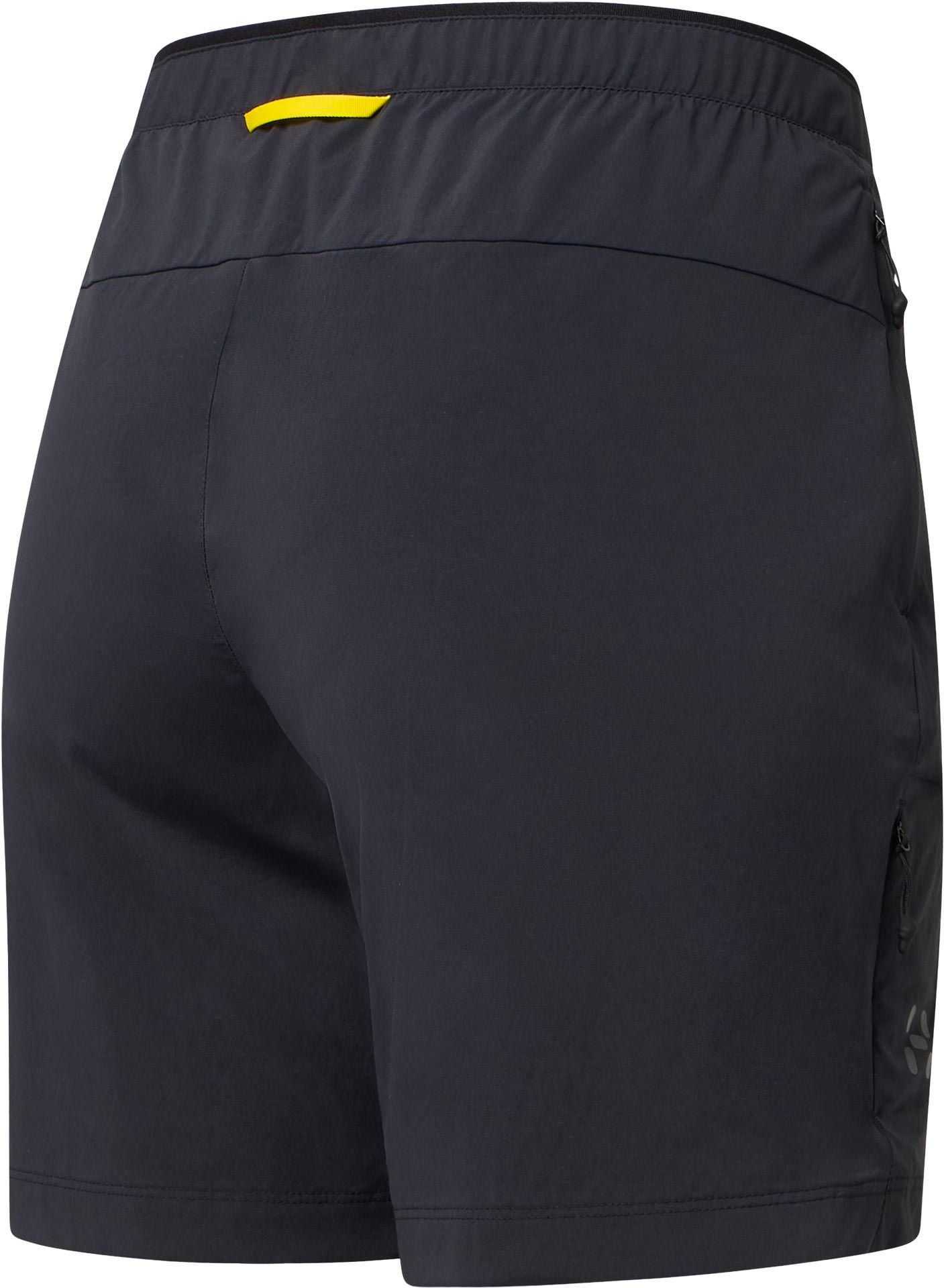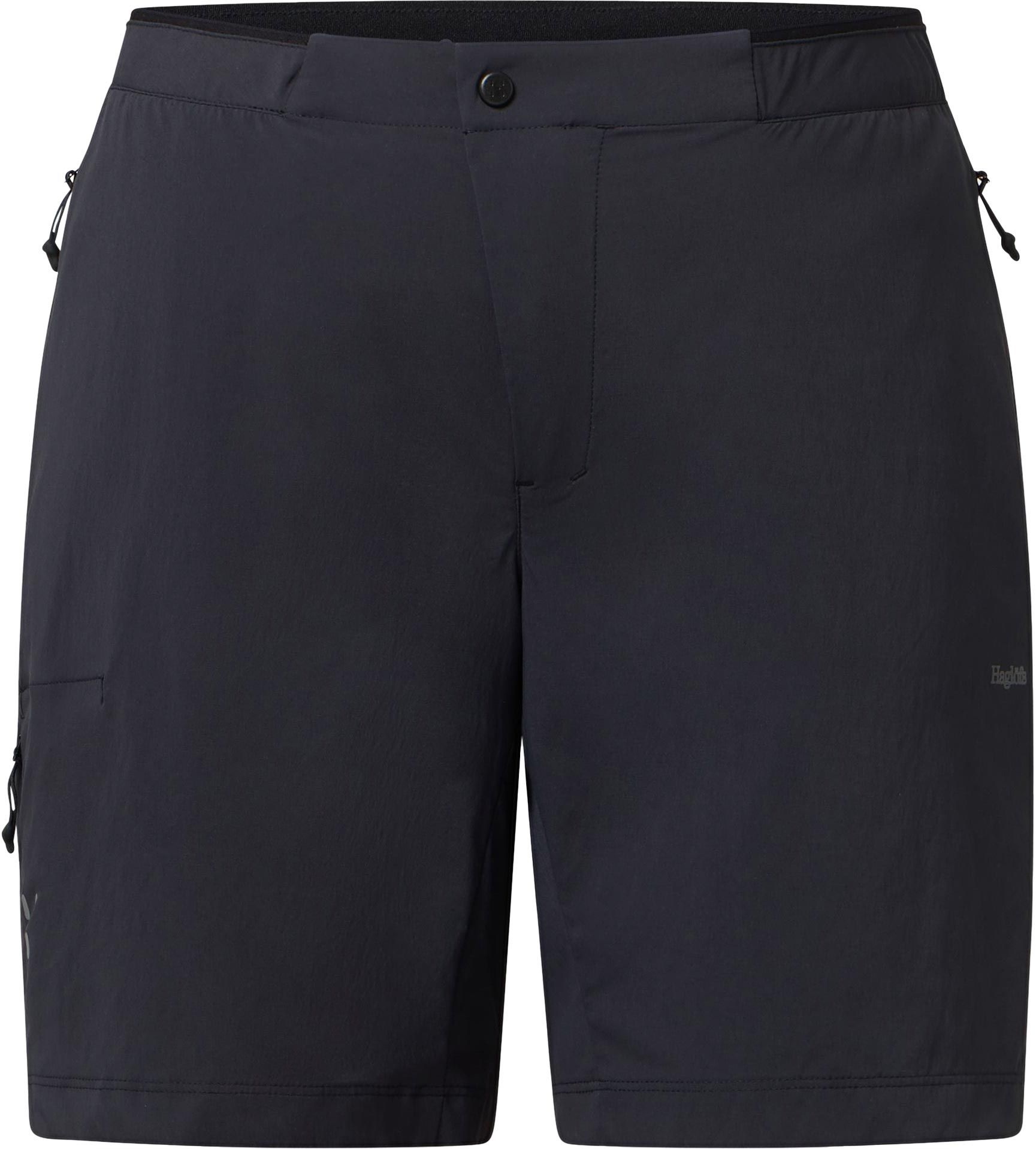 Short Haglöfs L.I.M Fuse II True Black pour femme, léger et extensible, conçu pour la randonnée par temps chaud. Respirant, il offre liberté de mouvement, ajustement sûr par ceinture élastique et trois poches zippées. Détails réfléchissants et tissu bluesign®.