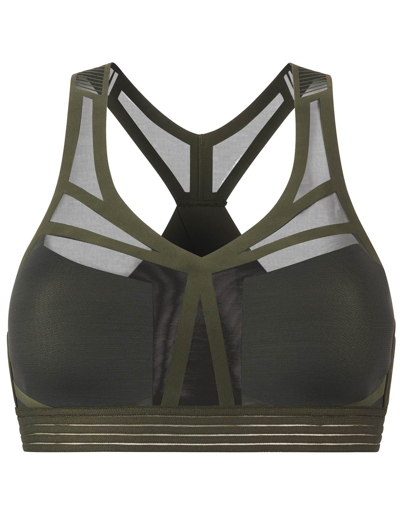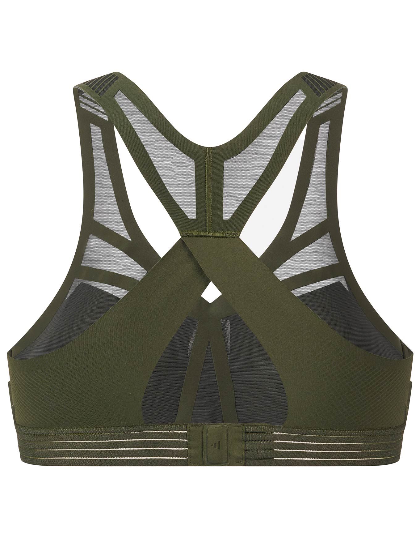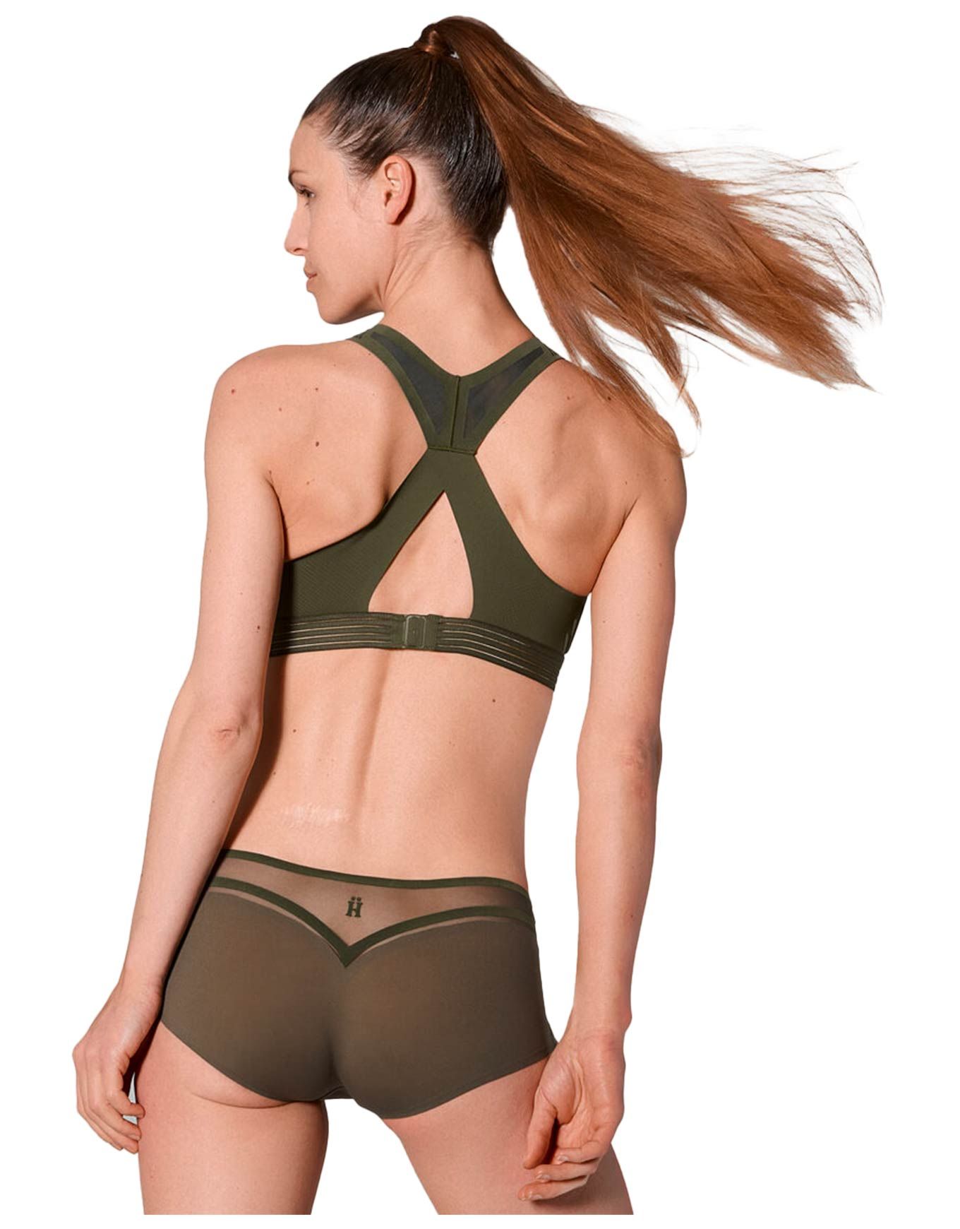 Brassière de sport Hästko Bra n°38 kaki sans armature, maintien moyen à fort, dos croisé thermosoudé, matière séchage rapide et bande micro-aérée pour respirabilité maximale.