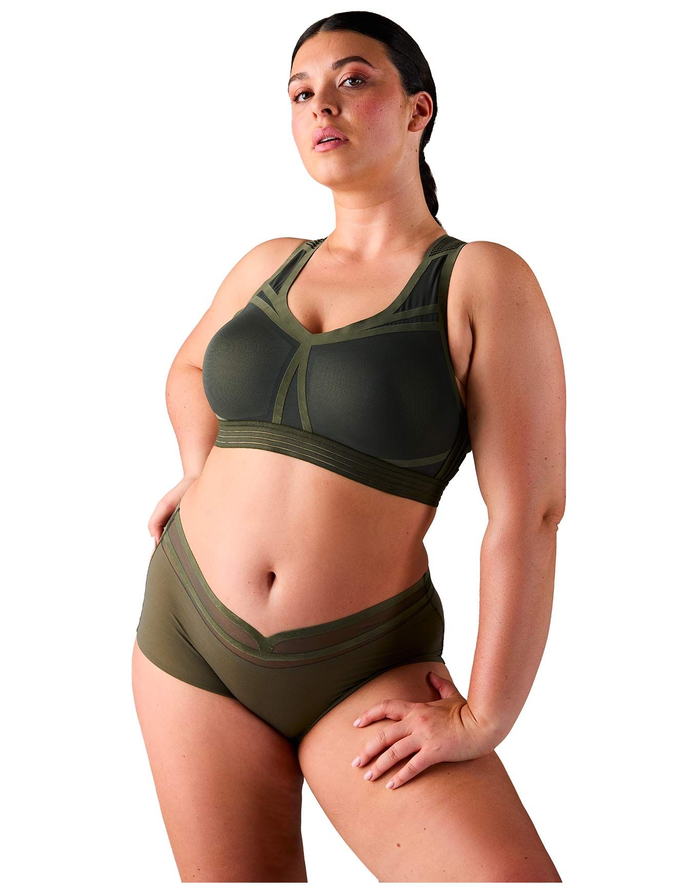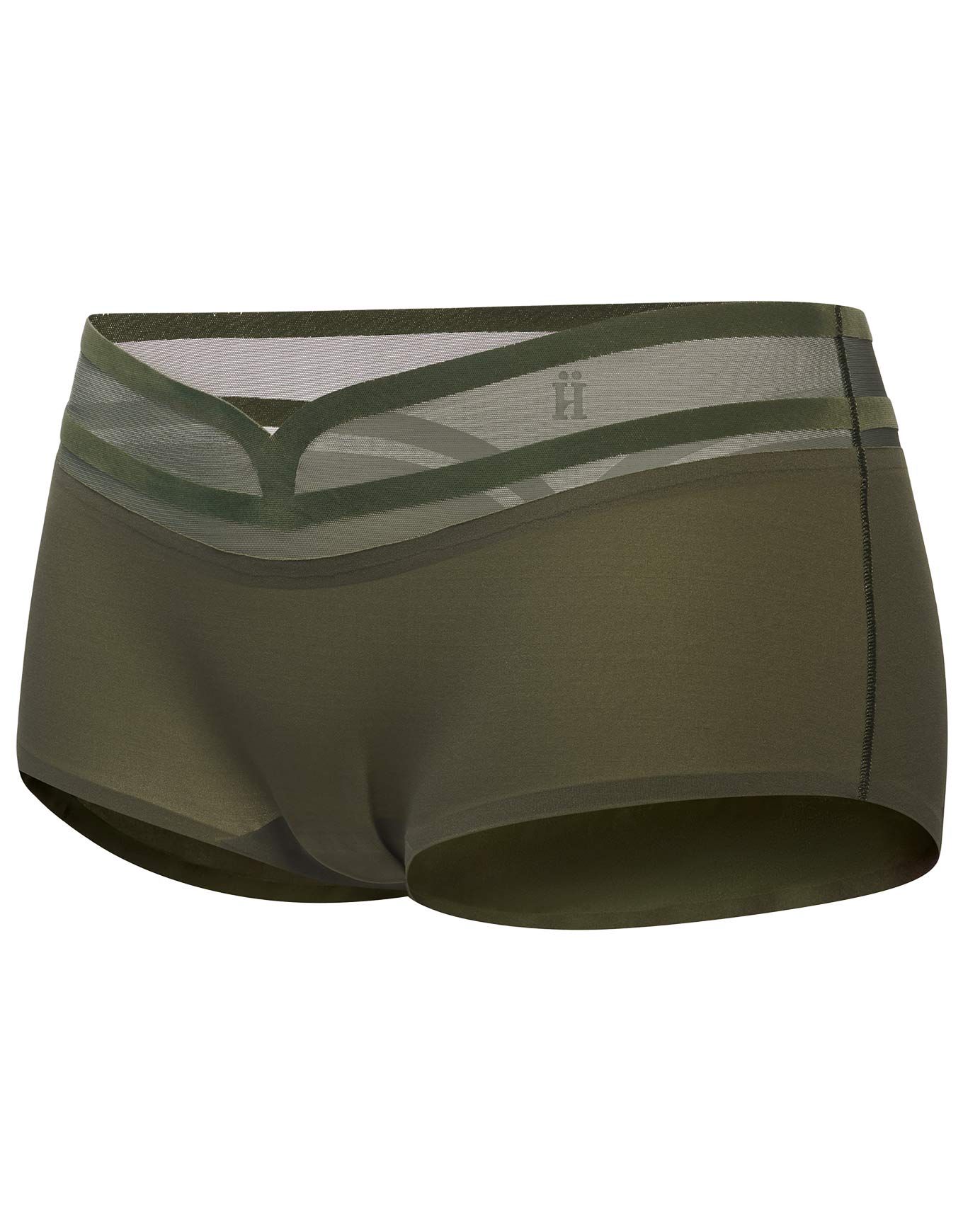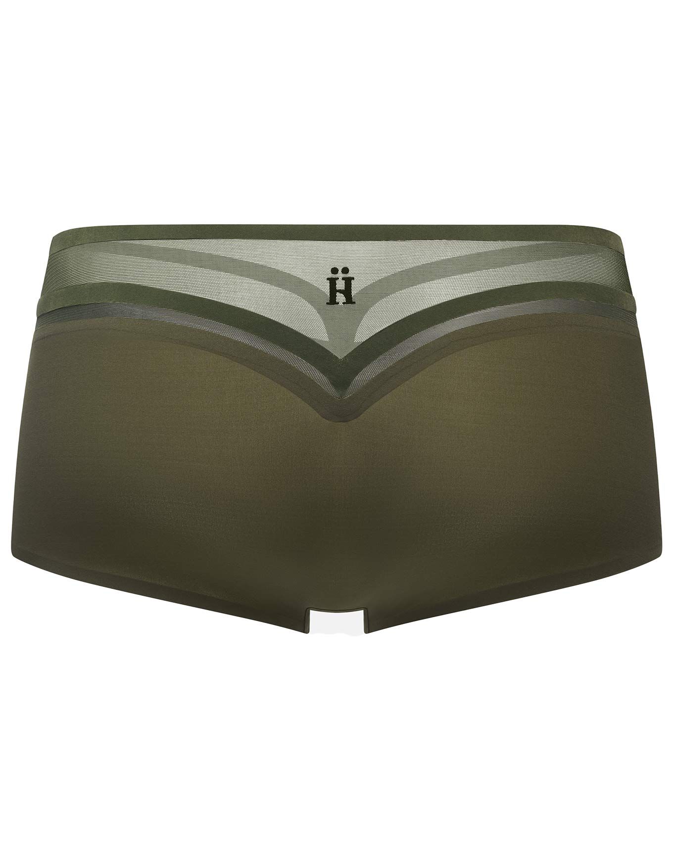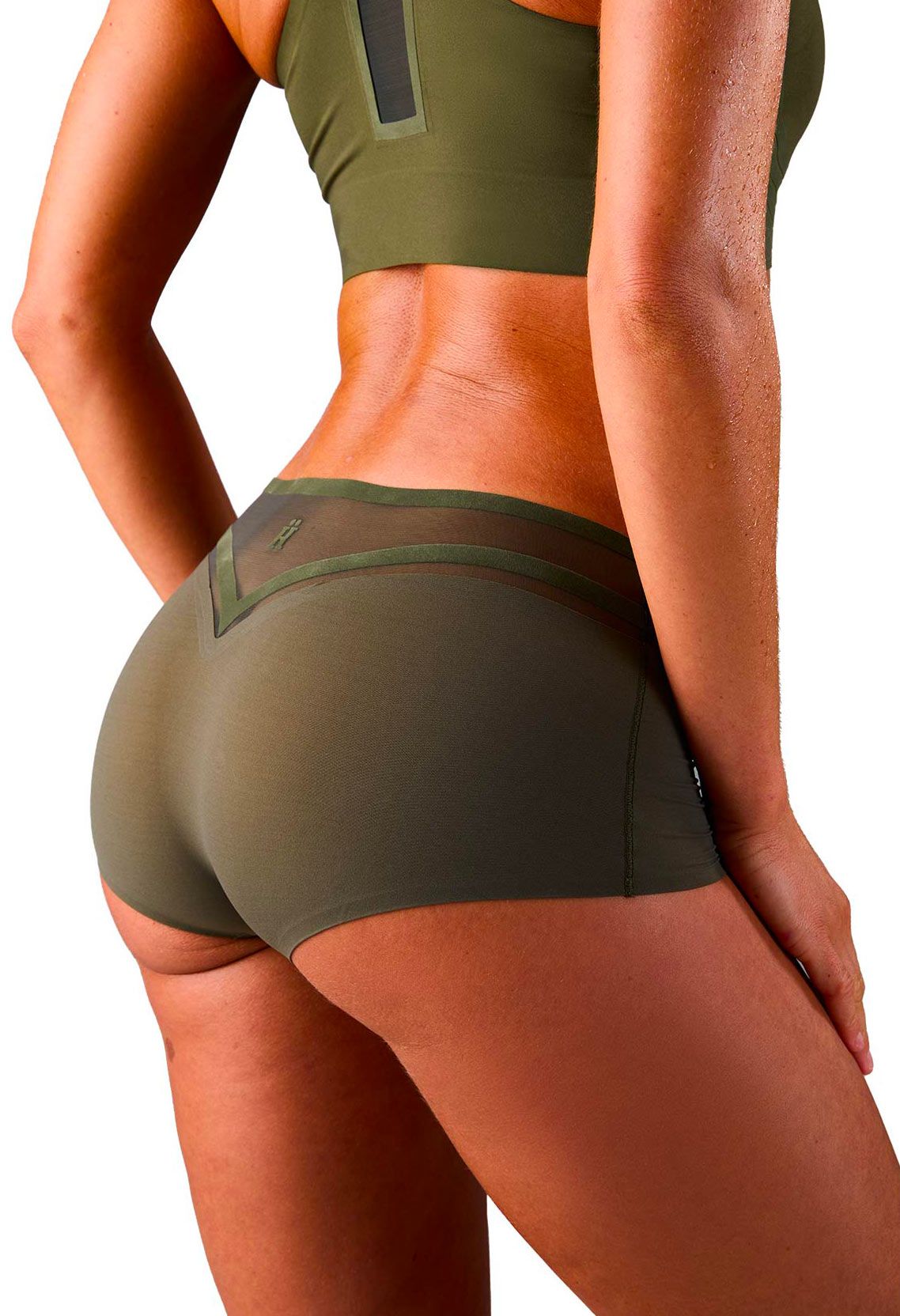 Shorty n°19 Kaki Hästko, sous-vêtement de sport féminin 100 % sans coutures, sculpte la silhouette sans comprimer grâce à sa forme englobante et à ses bords soudés. Matière respirante à séchage rapide, effet seconde peau et discrétion maximale pour vos entraînements.