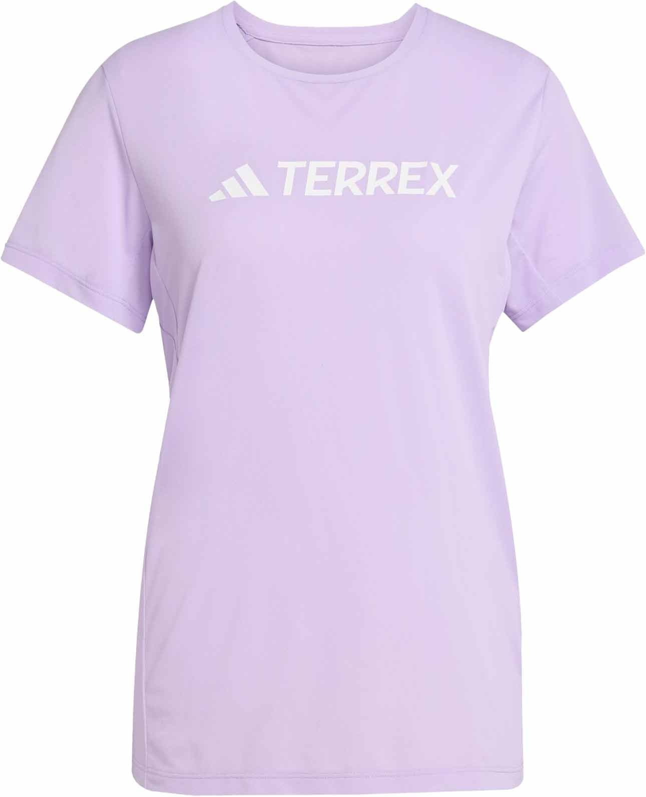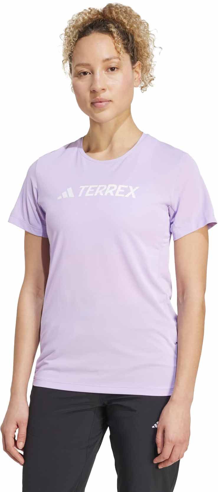 Adidas Terrex Multi Logo Tech Tee Powder Plum pour femme : t-shirt de running léger en tissu CLIMACOOL pour une évacuation rapide de la transpiration et une liberté de mouvement optimale lors des entraînements quotidiens.