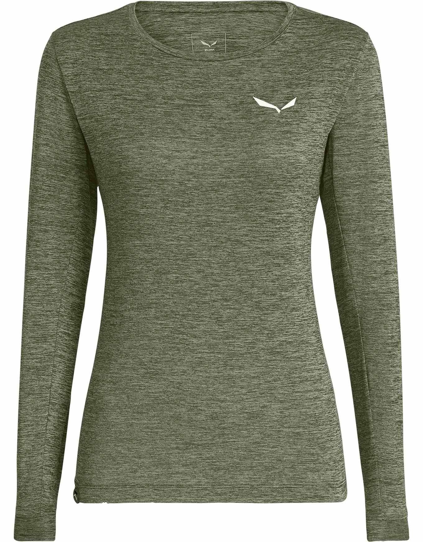 Le t-shirt manches longues Salewa Puez Melange Dry pour femme, en polyester extensible DRY’TON, évacue l’humidité et sèche rapidement lors des randonnées et trekkings en montagne.