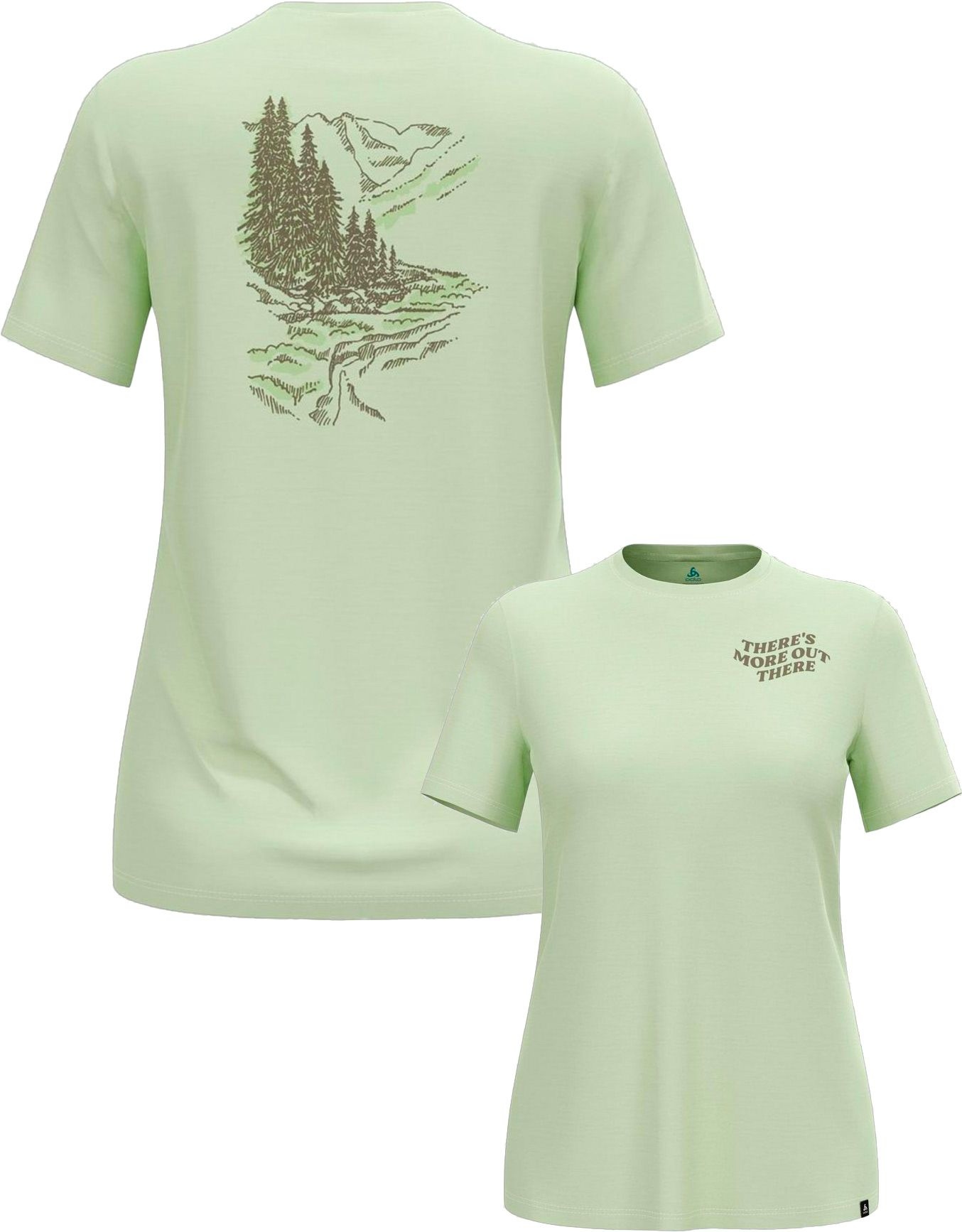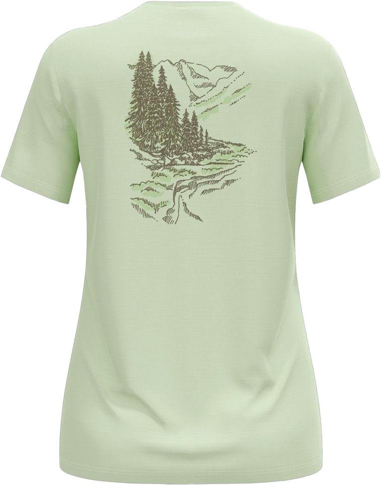 T-shirt Odlo There’s More Merino 160 Crew Neck S/S Ambrosia femme en laine mérinos sans mulesing, antiodeurs naturels, slogan poitrine et motif vallée dos.