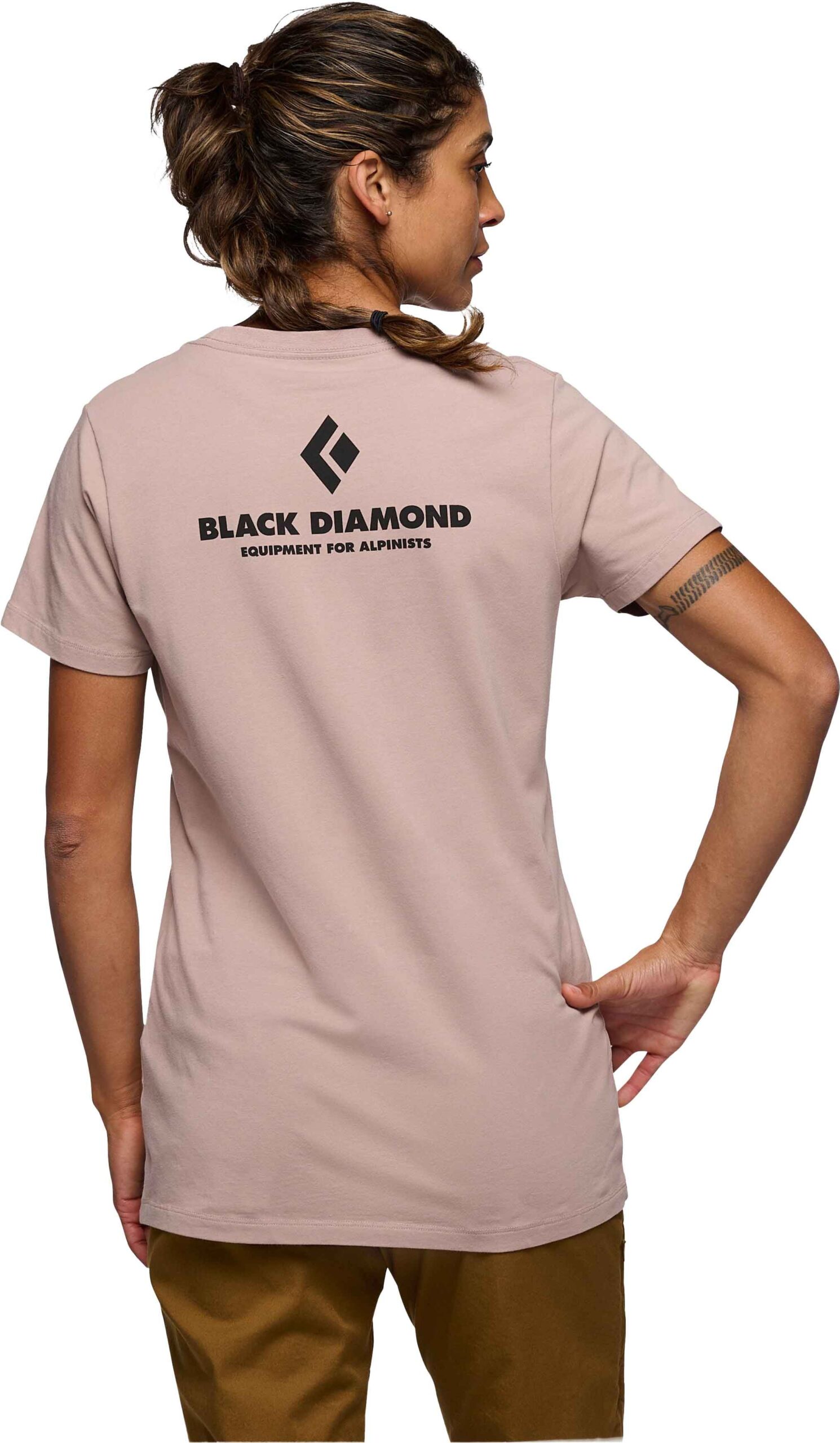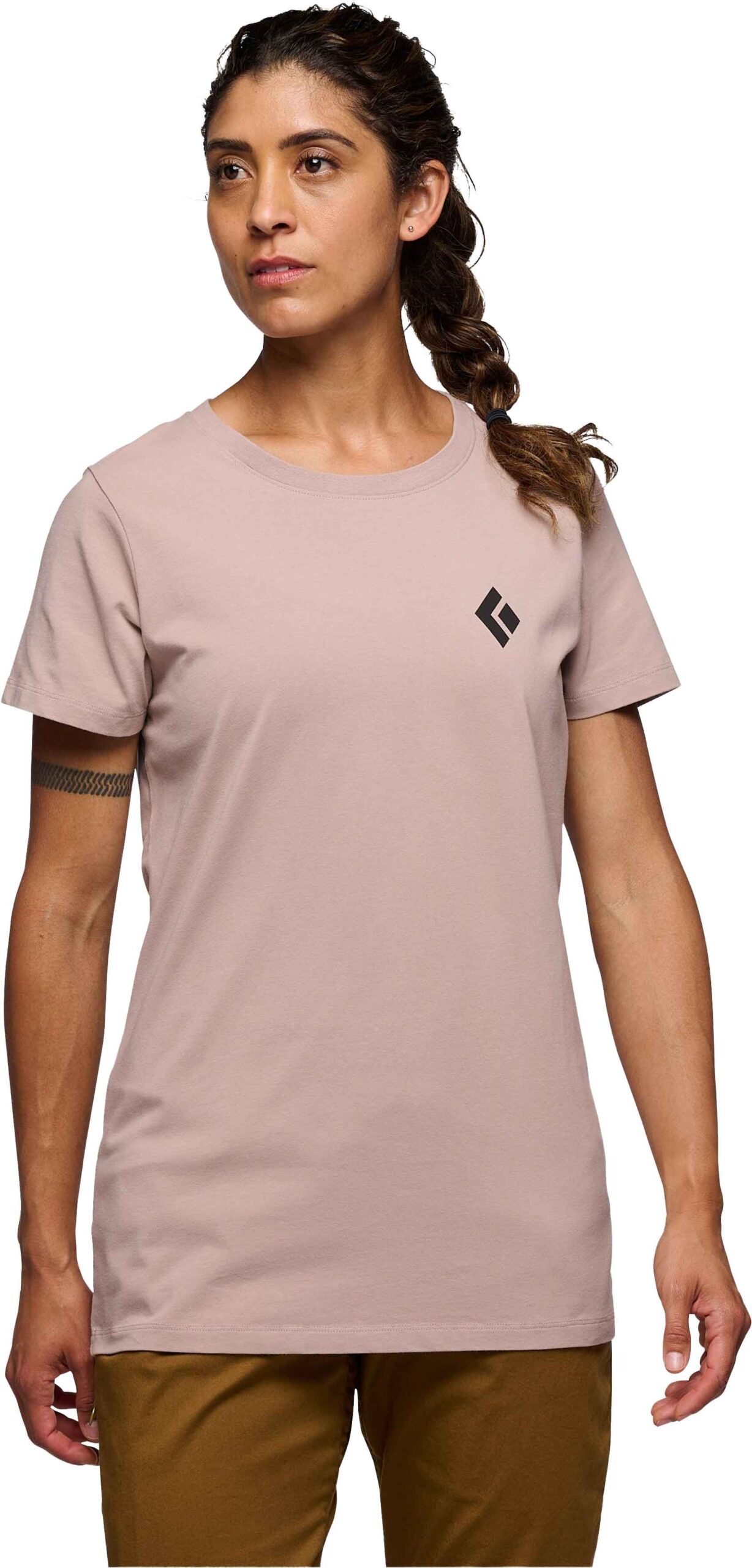 Le t-shirt Black Diamond Equipment For Alpinist SS Tee Pale Mauve femme offre confort et liberté de mouvement en jersey extensible, avec un logo affirmant votre passion de l’escalade.