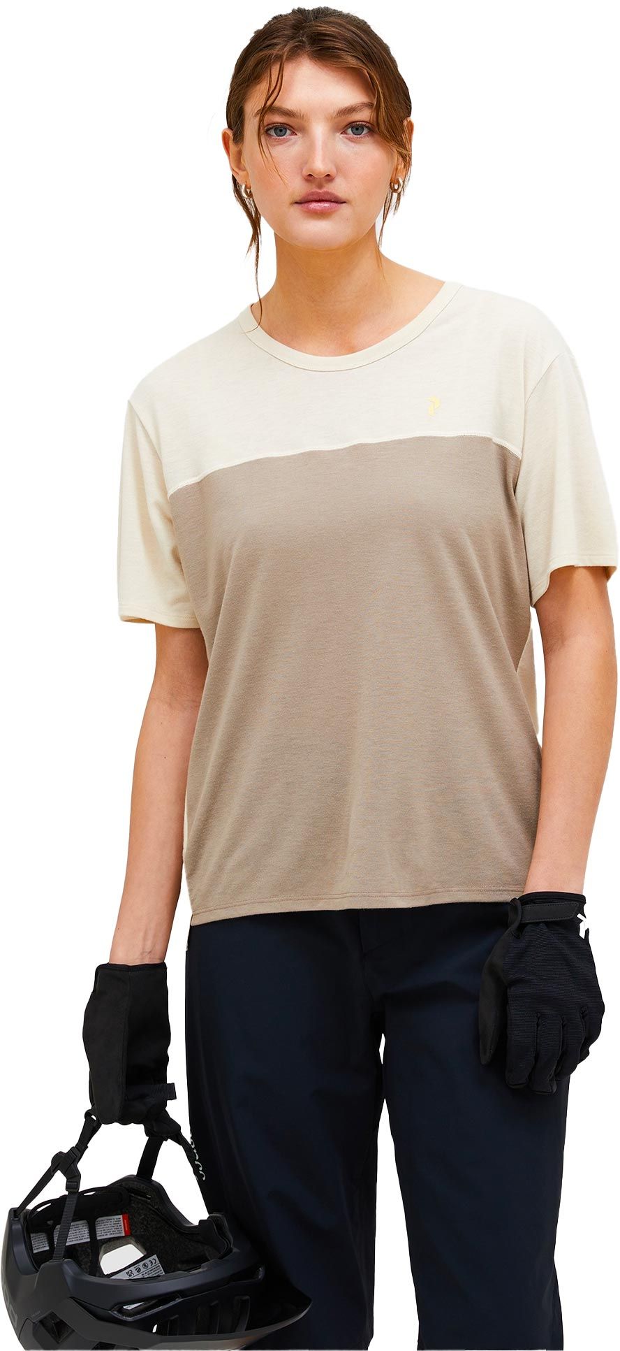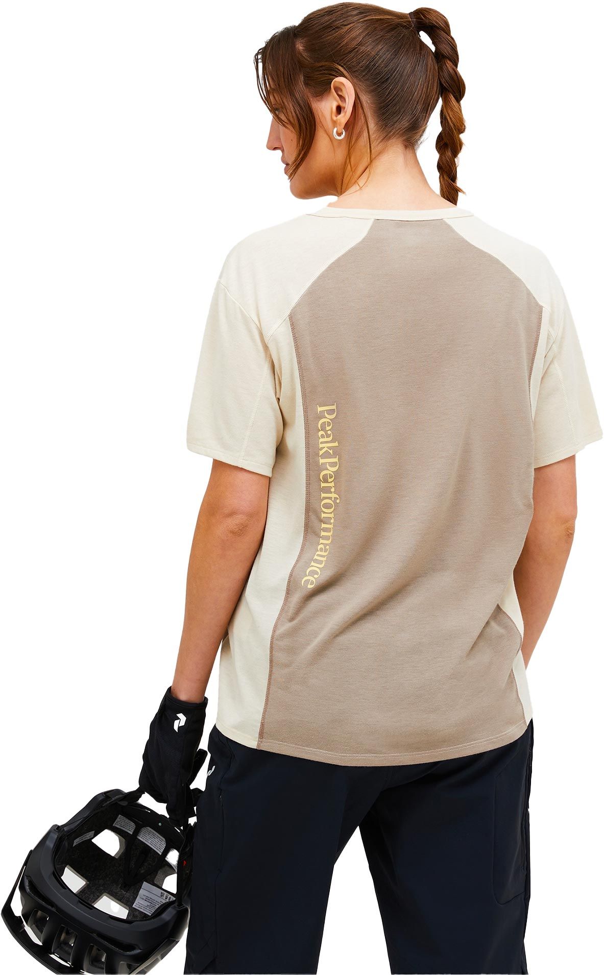 T-shirt Peak Performance Trail Wool Blend SS Sand Fog Avid Beige pour femme, conçu pour le VTT et l’outdoor. Mélange laine/polyester doux, respirant et confortable en effort. Poche discrète pour snack.