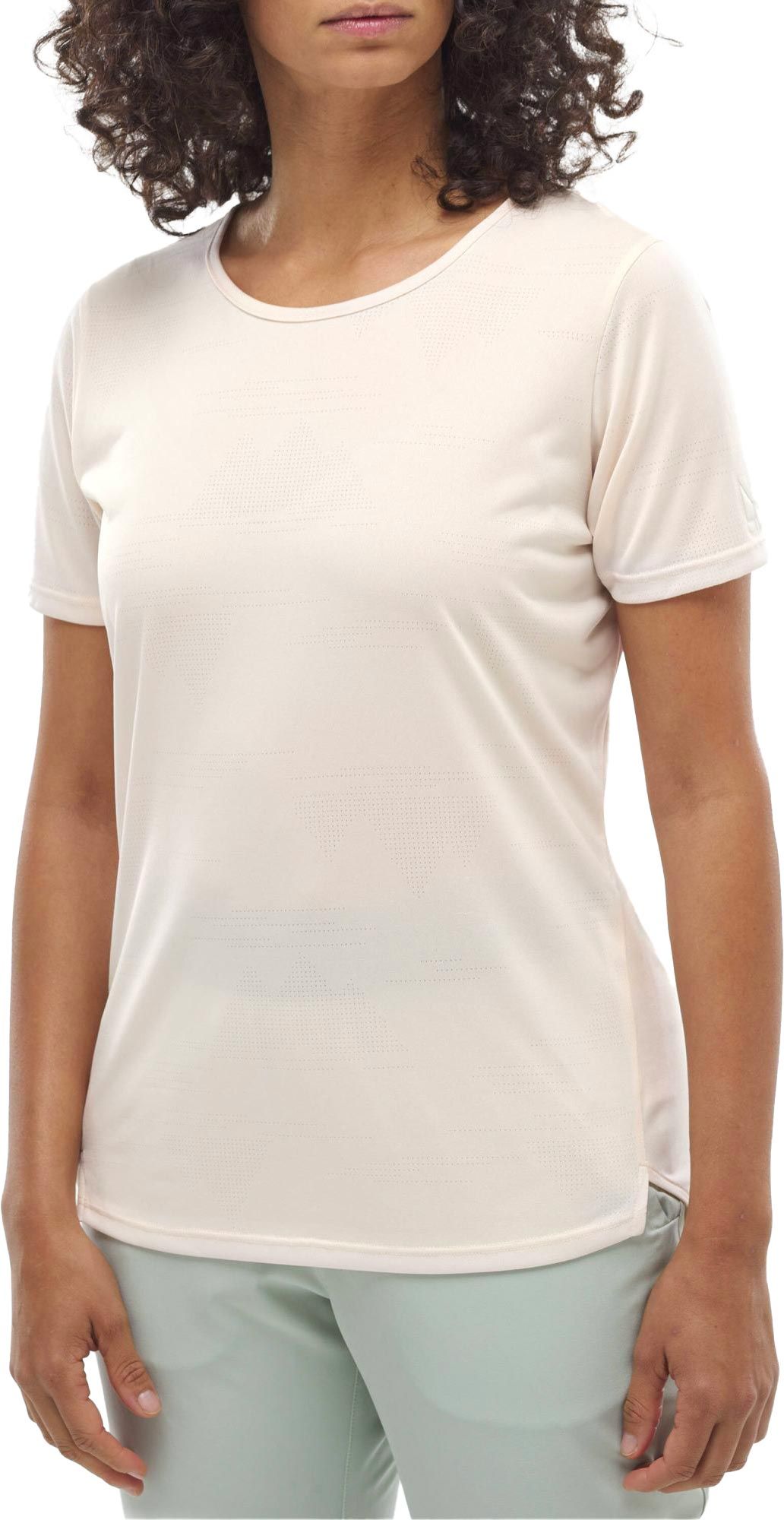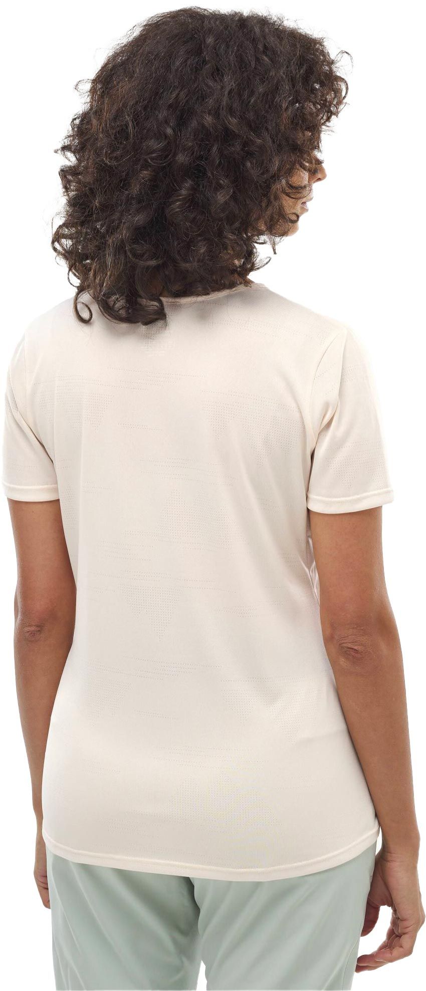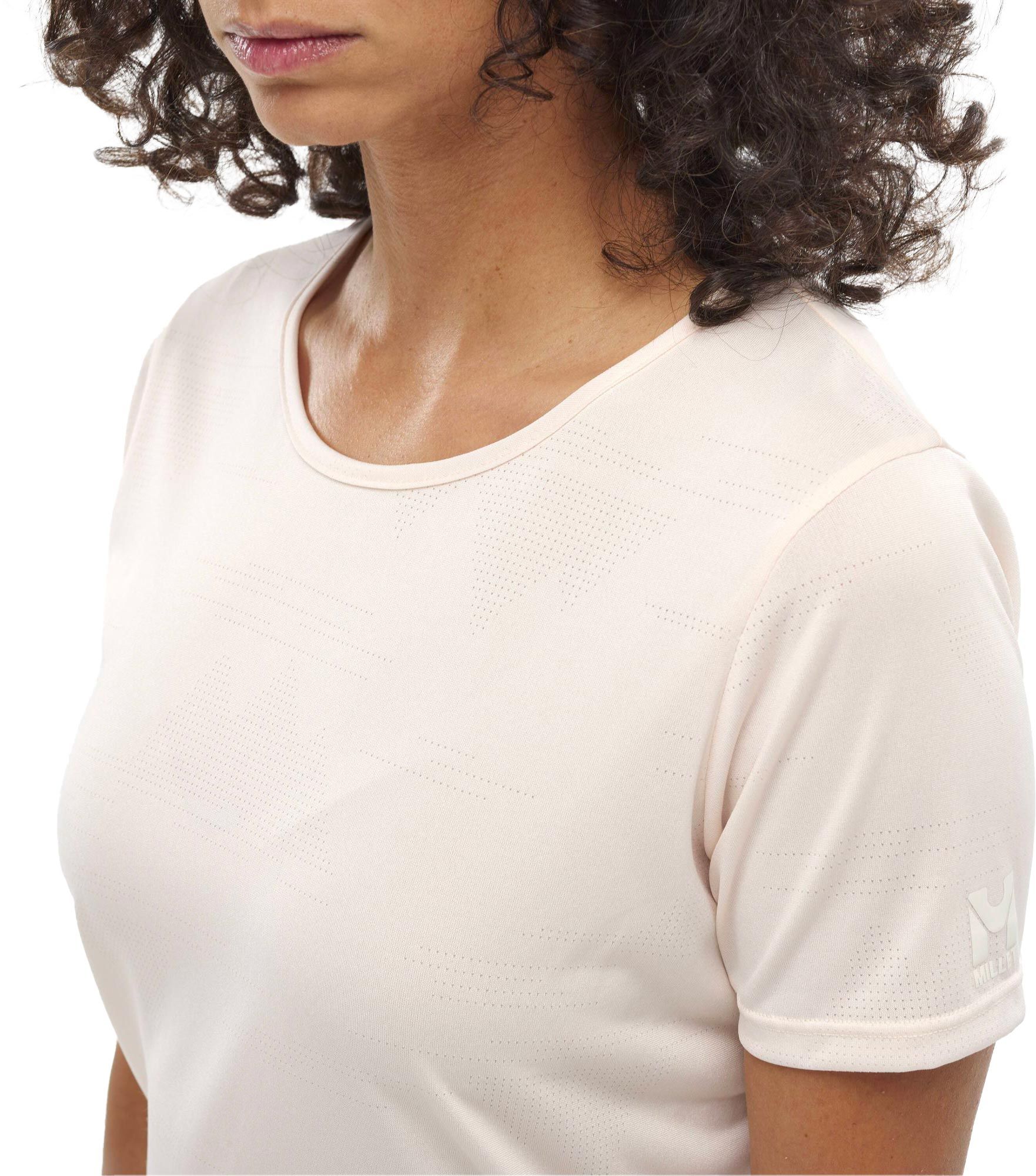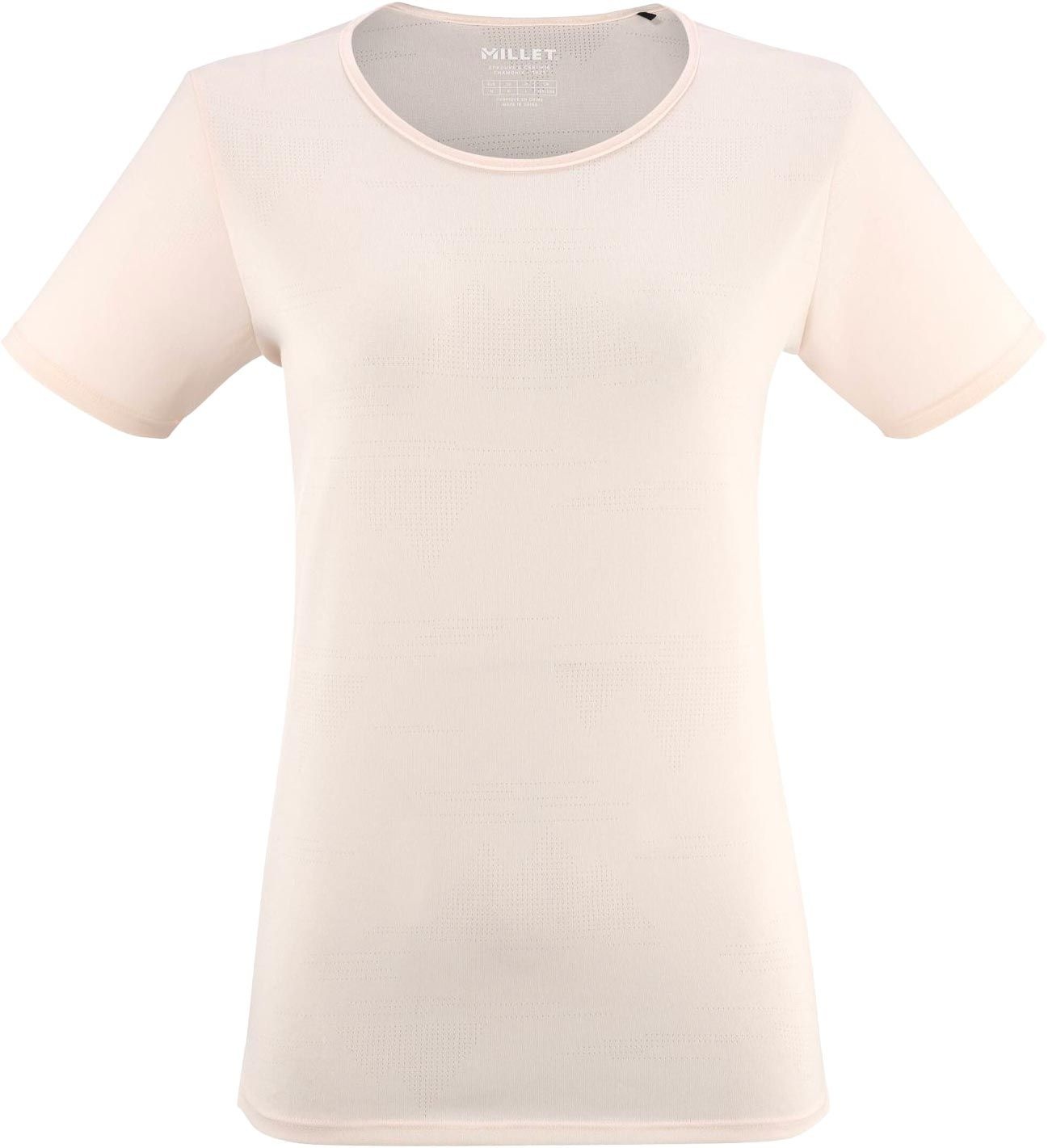 Le t-shirt Millet Wanaka Light TS SS Vanilla Cream pour femme, en polyester stretch Drynamic™, évacue l’humidité en randonnée et affiche des motifs montagne jacquard tout le long.