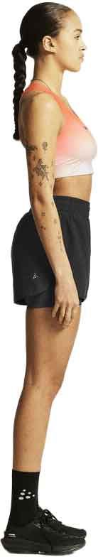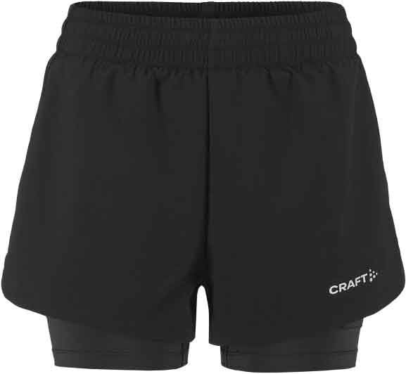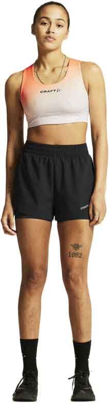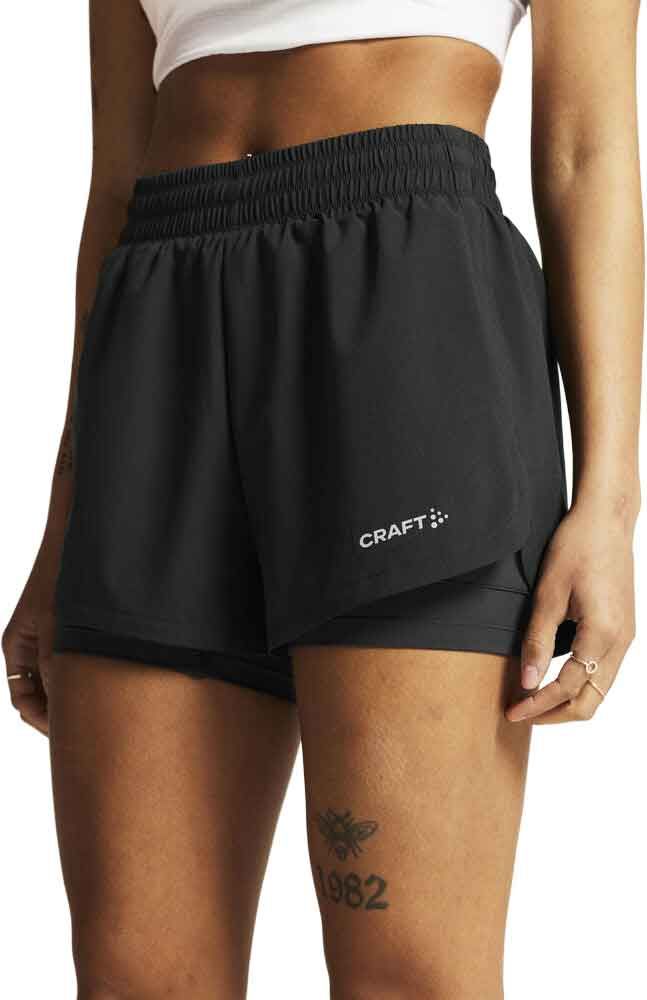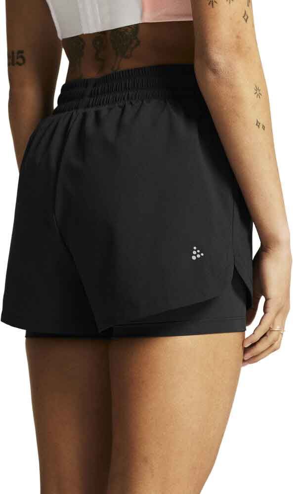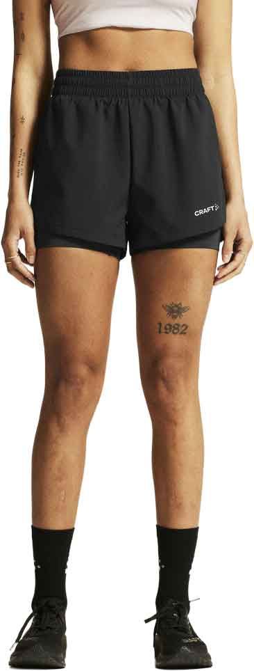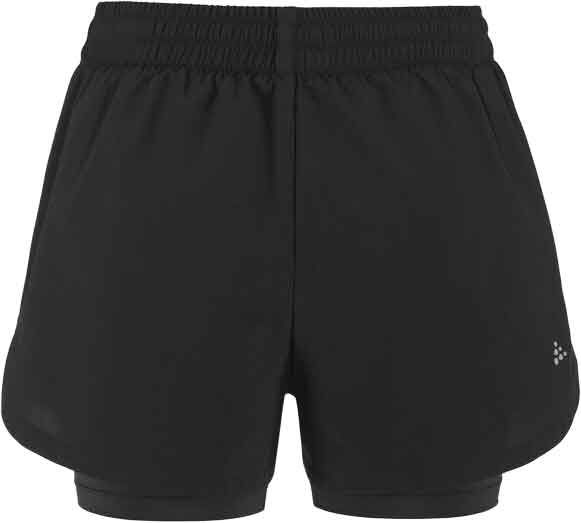 Short de running femme Craft ADV Essence 2-in-1 2 Black : short extérieur léger en polyester recyclé et cuissard intérieur polyamide-élasthanne pour soutien, évacuation de l’humidité et liberté de mouvement.