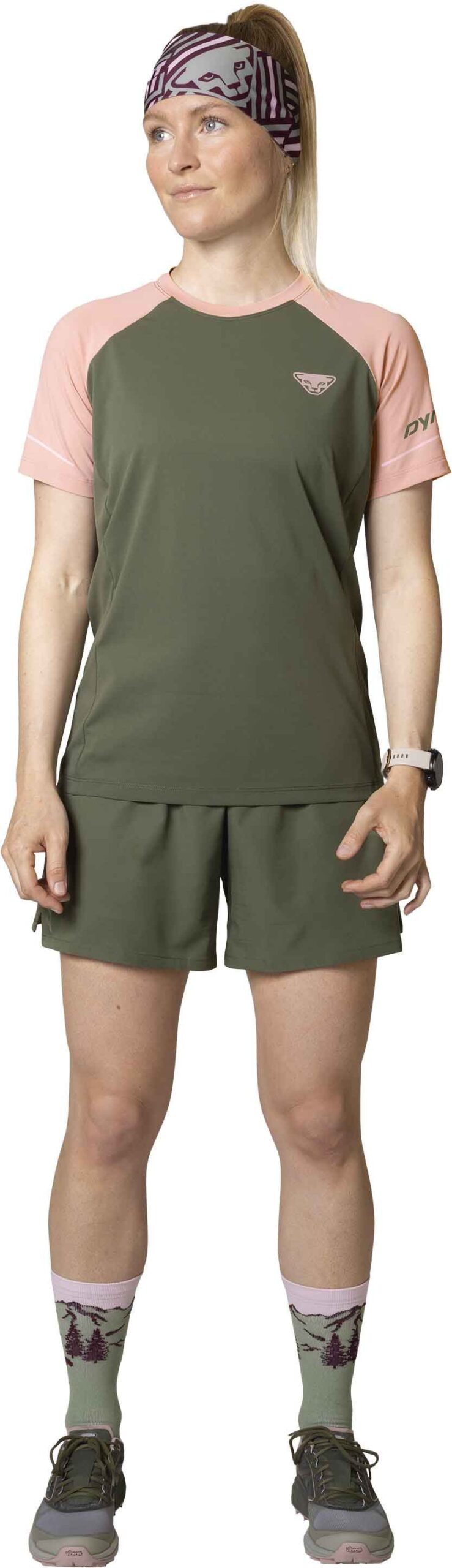 Dynafit Alpine Pro 2in1 Shorts Thyme : short femme trail running avec cuissard intégré, tissu léger respirant, ceinture réglable et bandes réfléchissantes pour le maintien et la visibilité.