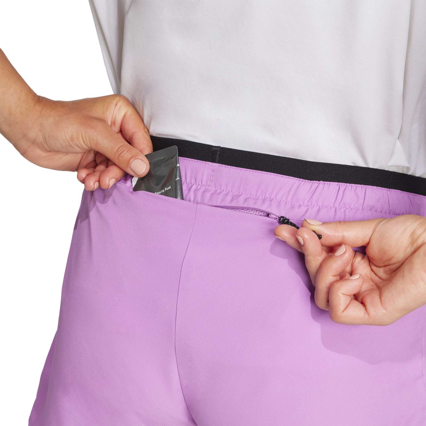 Short de trail running Adidas Terrex Multi Light Shorts 5″ Preloved Purple femme, taille élastiquée ajustable, fentes latérales pour liberté de mouvement, poches latérales et poche arrière zippée pour sécuriser téléphone et clés.