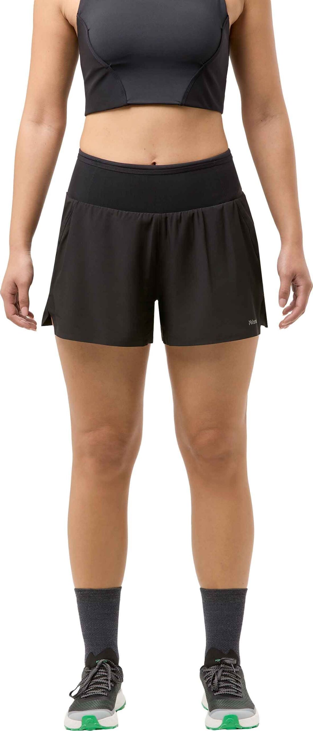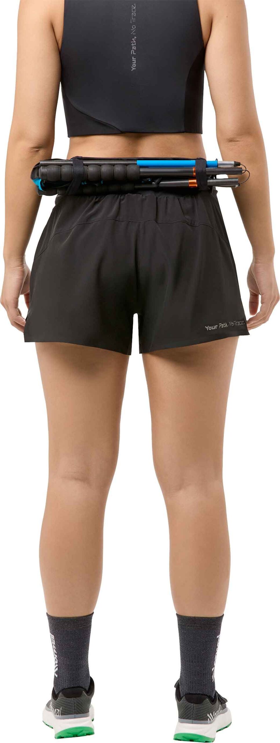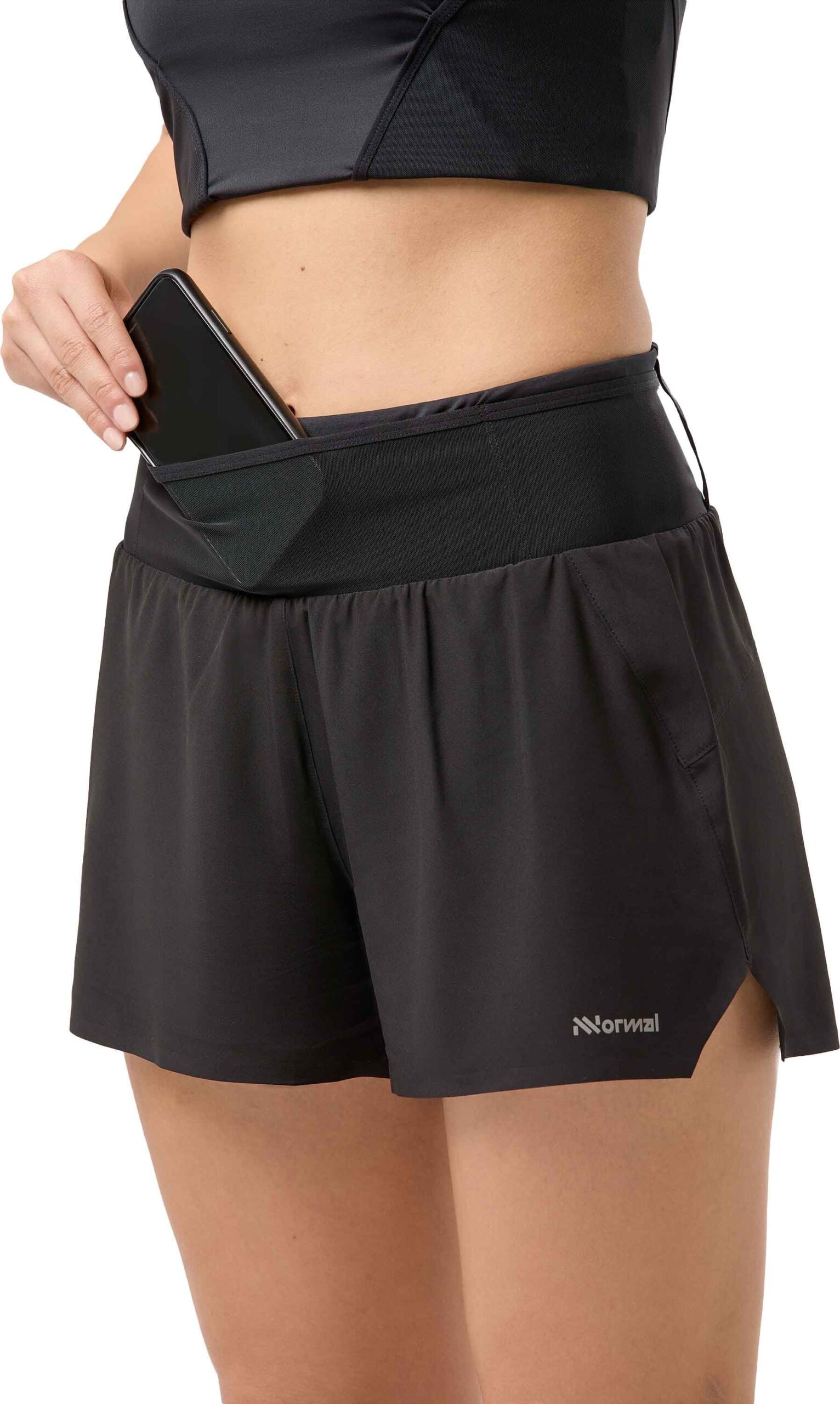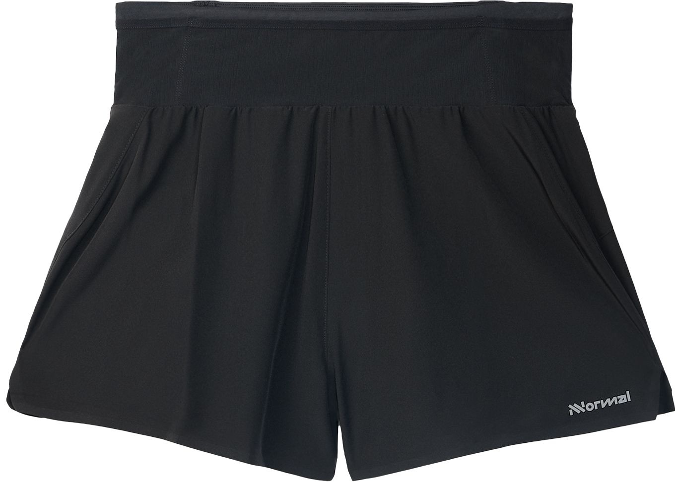 Short de trail running femme NNormal Race Shorts W Black, taille haute ajustée pour maintien et liberté de mouvement, avec poche avant et passants bâtons arrière.