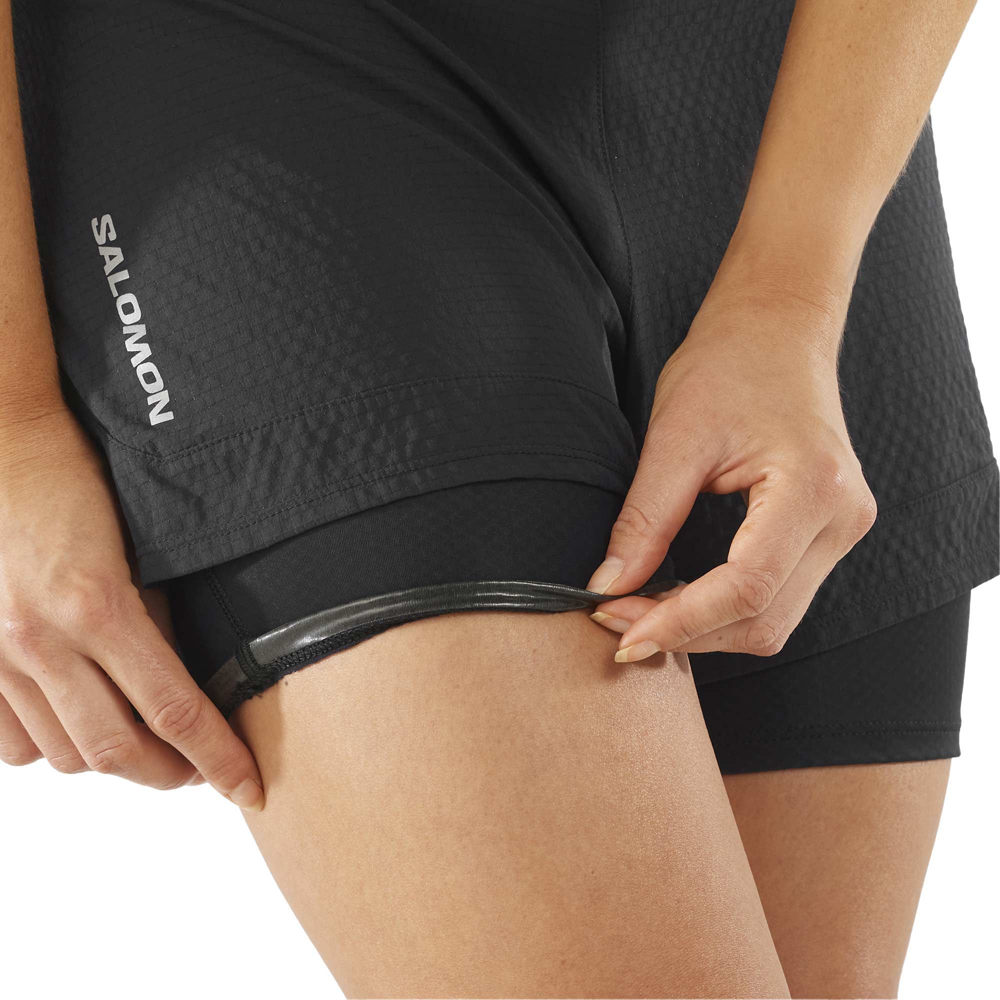 Short Salomon Sense Aero 2In1 Deep Black pour femme, conçu pour running et trail. Short stretch 4 directions Aerotech léger avec boxer intégré, taille plate et bandes silicone pour maintien optimal, réduction des frottements.
