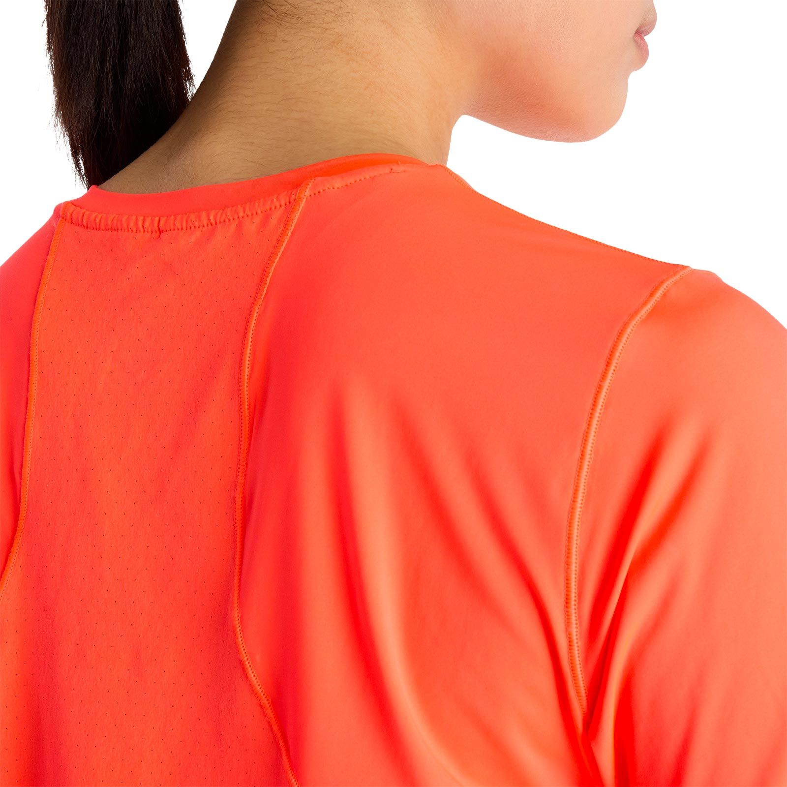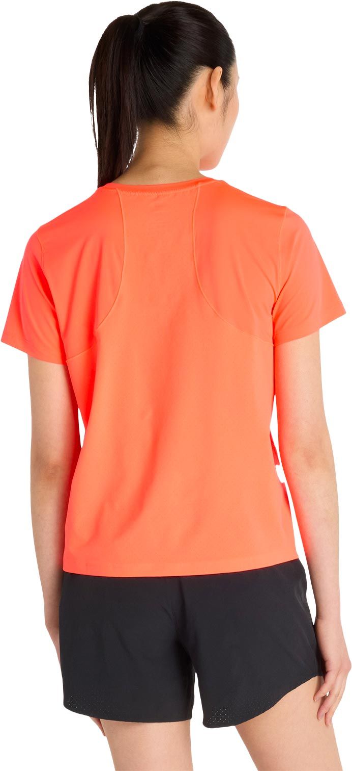 T-shirt New Balance Race Day Urgent Red femme : polyester recyclé stretch, dos perforé, respirabilité et séchage rapide pour le trail running.