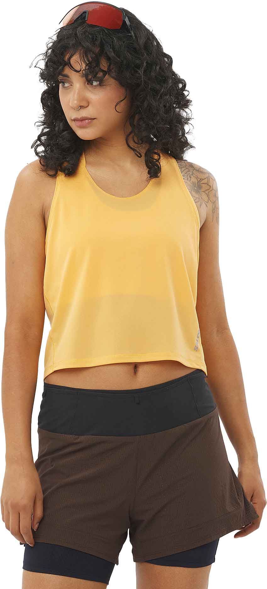 Débardeur court Salomon Sense Aero Short Tank femme en Knit-Flow 100 g/m², ultraléger, anti-odeurs Ionic+® et thermorégulateur 37.5® pour la course à pied.