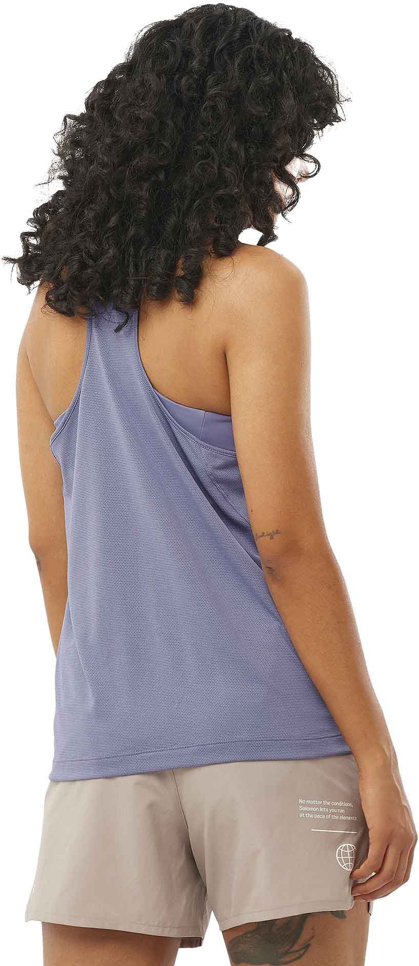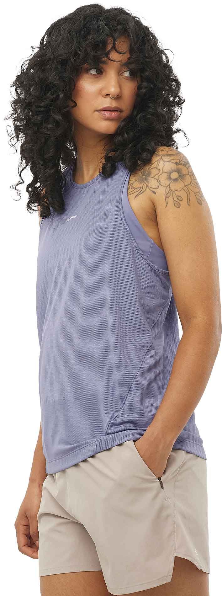 Le tank de running Shakeout Core Tank Blue Granite Salomon femme, en tissu Core_Flow ultra-doux, évacue la transpiration et sèche vite pour un confort total sur route ou sentier.