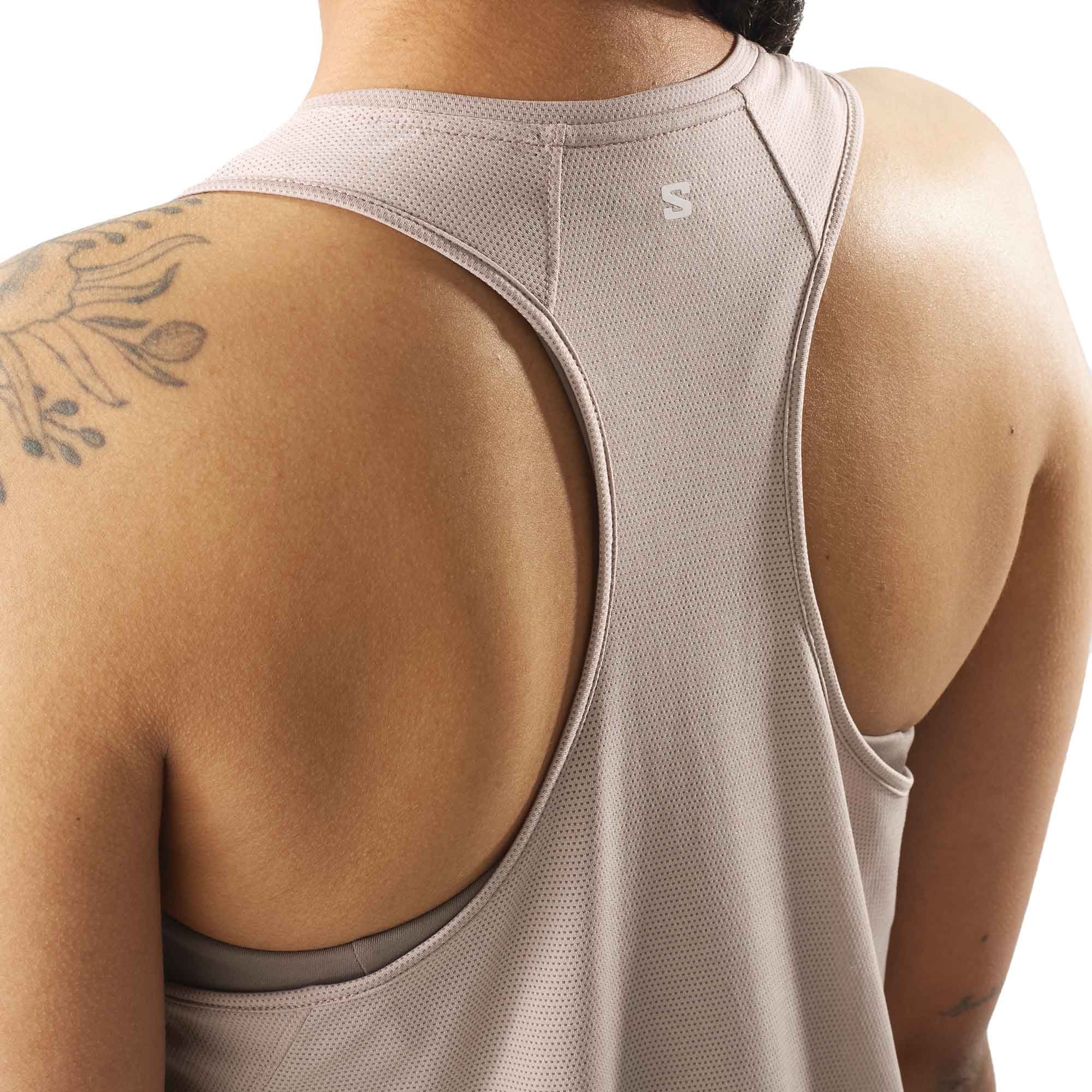 Salomon Shakeout Core Tank femme est un débardeur de running route et sentier en tissu Core_Flow ultra-doux, séchage rapide et coutures plates pour liberté de mouvement maximale.
