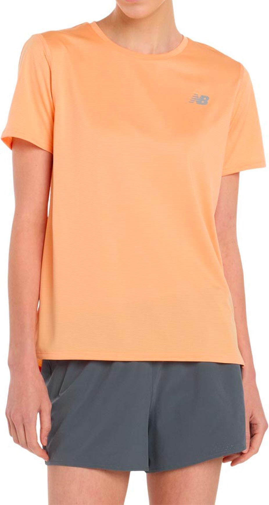 T-shirt à manches courtes New Balance Sports Essentials Dried Orange femme, à séchage rapide pour évacuer la transpiration et garder le corps au sec. Fentes latérales pour la liberté de mouvement, logo NB discret.