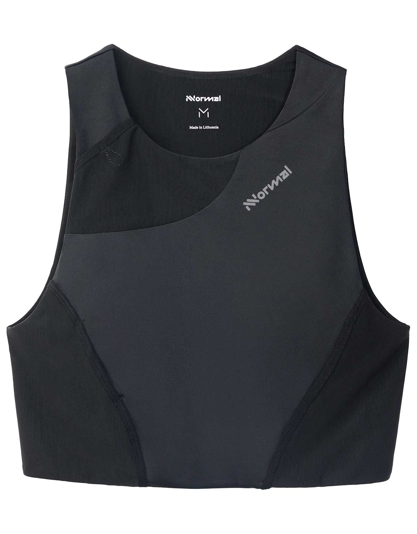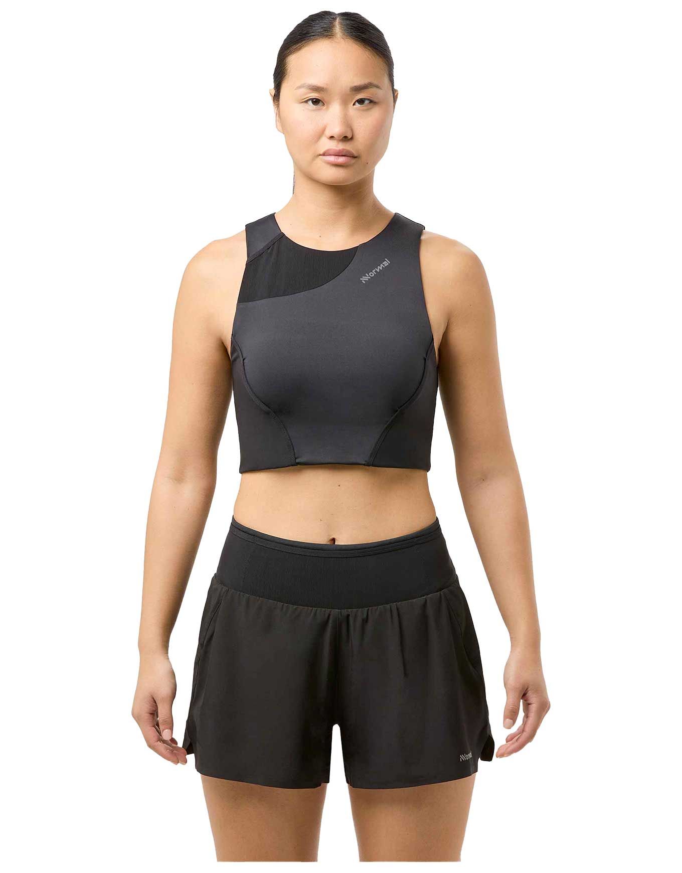 Brassière de sport NNormal Trail Cropped Top W Black, coupe longue féminine en polyester recyclé, offre soutien élastique et trois poches pratiques pour yoga, running ou escalade.