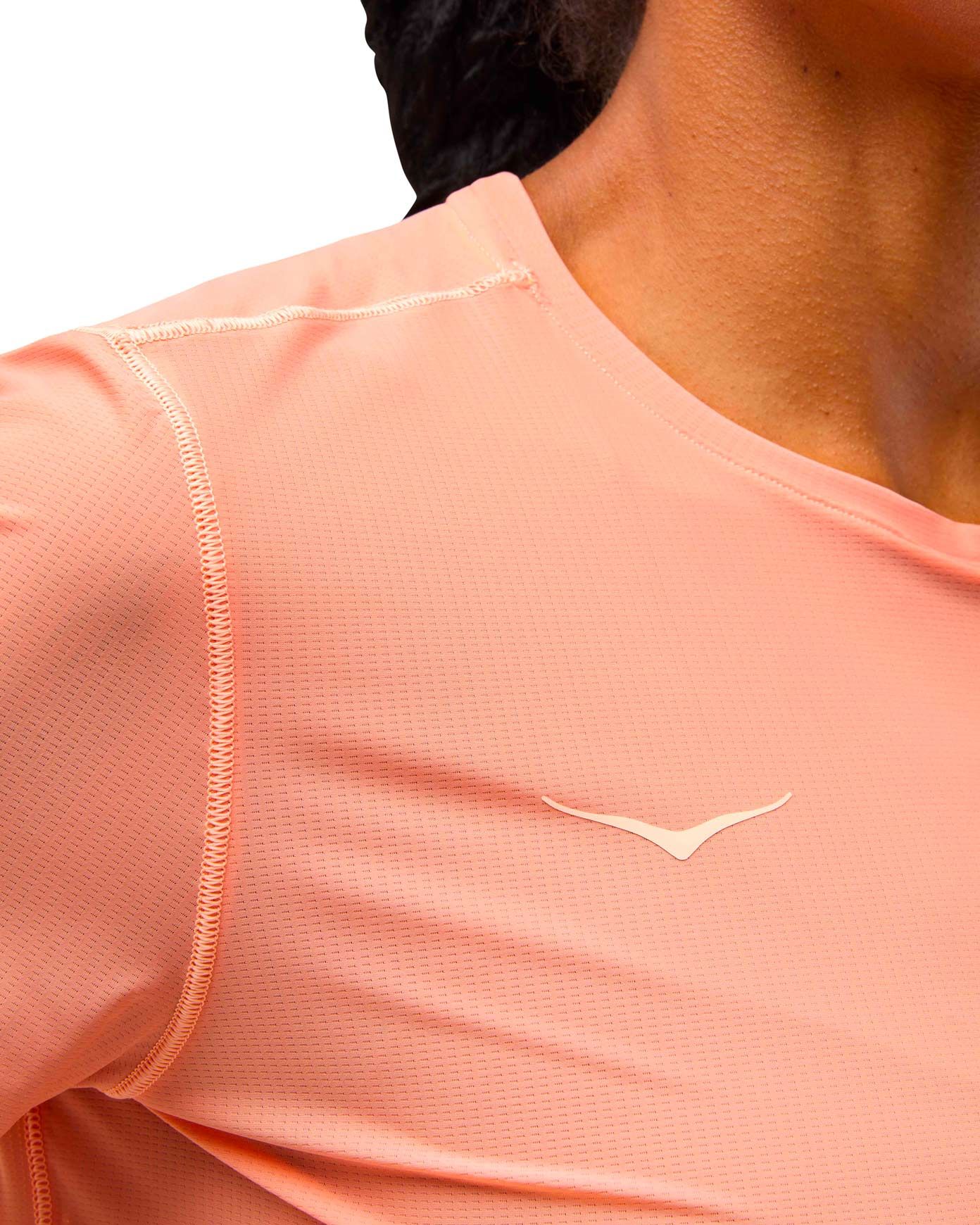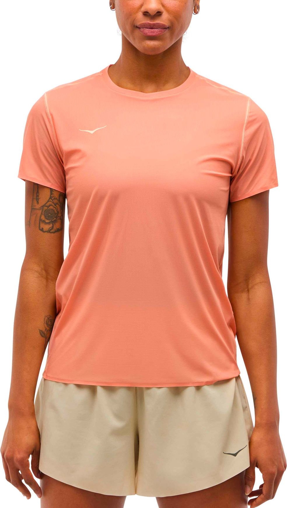 T-shirt trail/running femme Hoka Airolite Run Short Sleeve Dry Clay : léger, ultra-respirant, séchage rapide et antibactérien pour rester au frais. Extensible et FPS 40+, il protège des UV tout en liberté de mouvement.