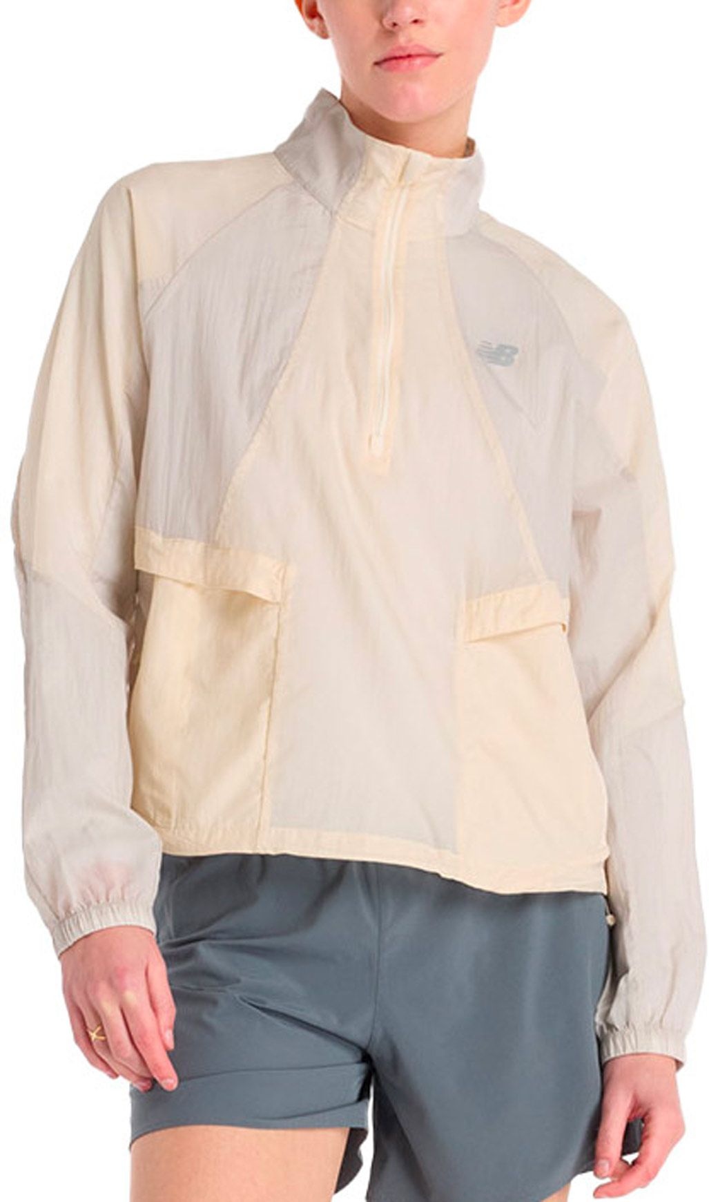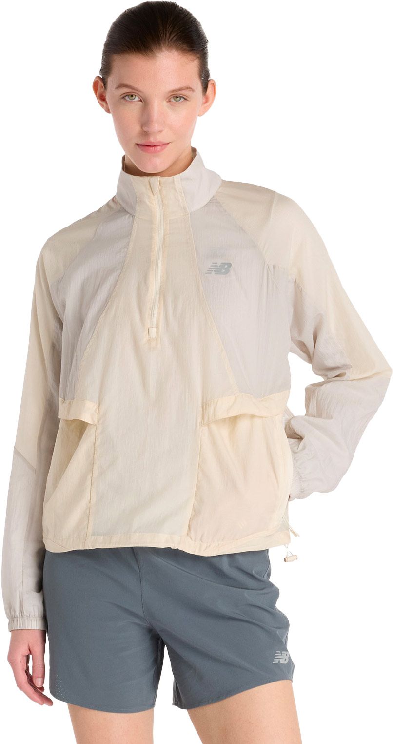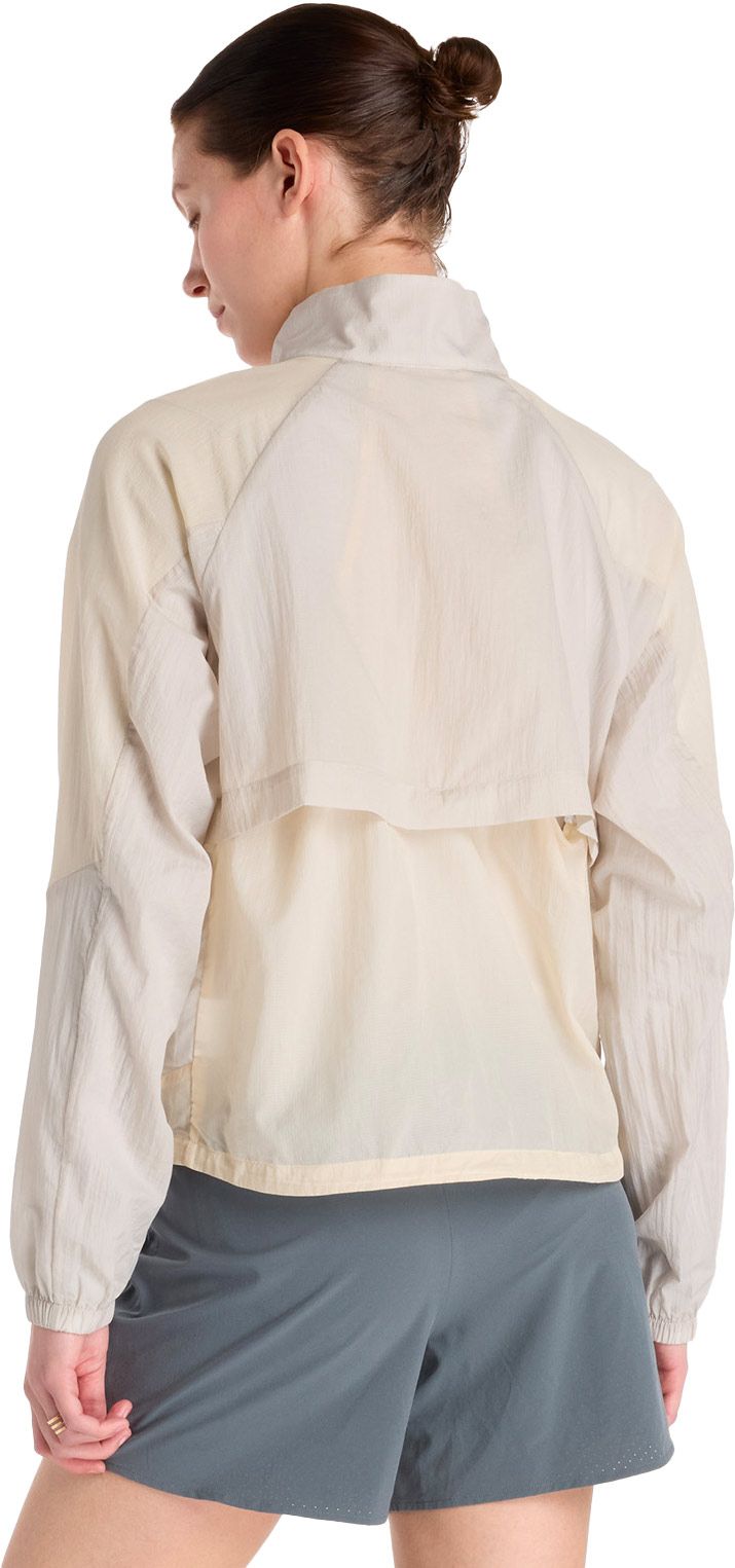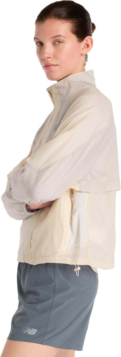 Veste de trail running New Balance Better Run Water Resistant Linen femme, en ripstop ultraléger avec membrane déperlante, empiècement arrière ventilé, col montant, poignets et ourlet élastiqués, poches zippées et filet.