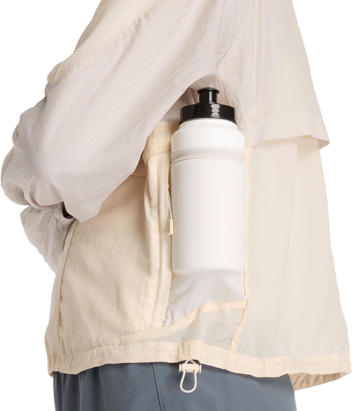 Une protection renforcée contre les intempéries est assurée par le col montant. Le maintien est garanti par des poignets élastiqués qui réduisent également les infiltrations d’air et d’eau, un principe également appliqué à l’ourlet grâce à son ajustement par cordon élastiqué. Le transport sécurisé des gels et accessoires indispensables est possible via des poches zippées complétées de poches extensibles en filet.