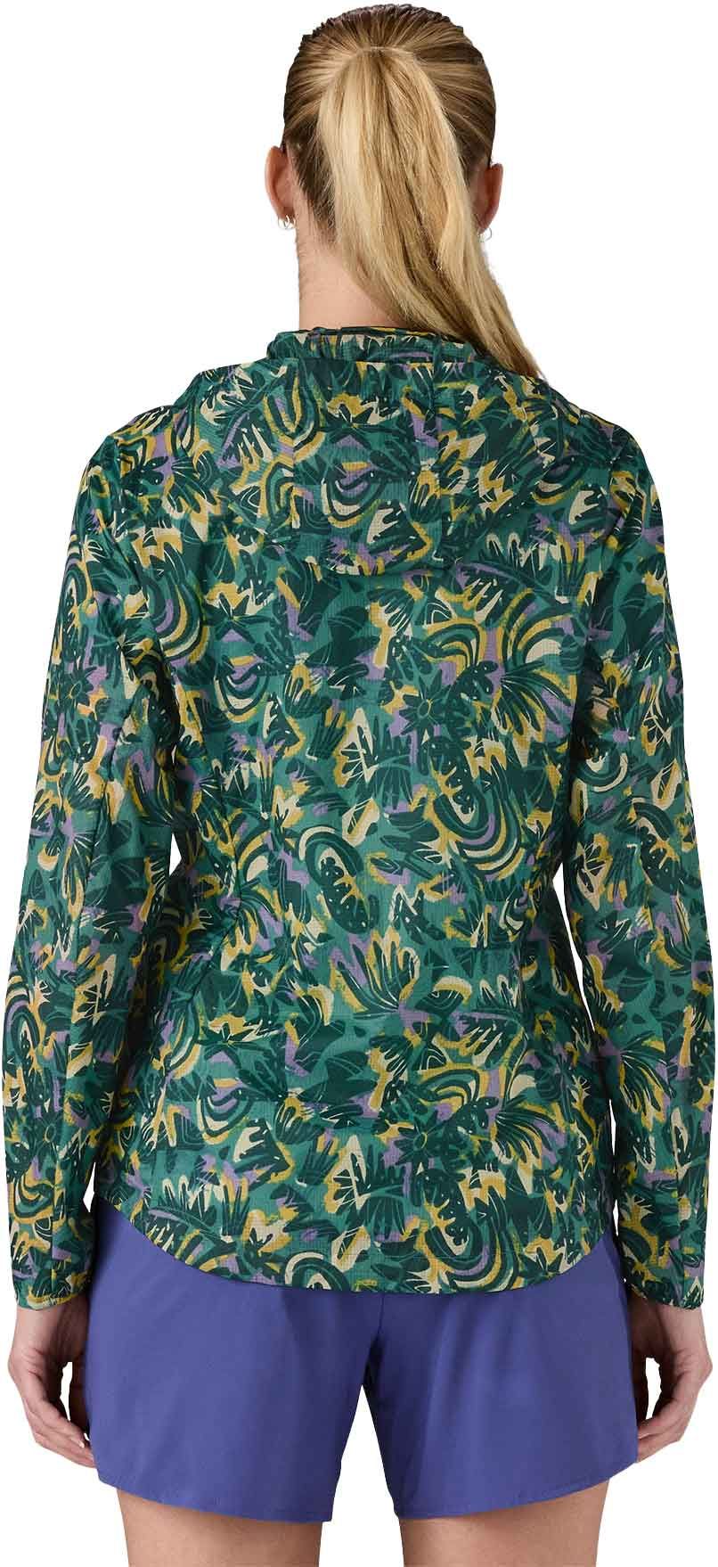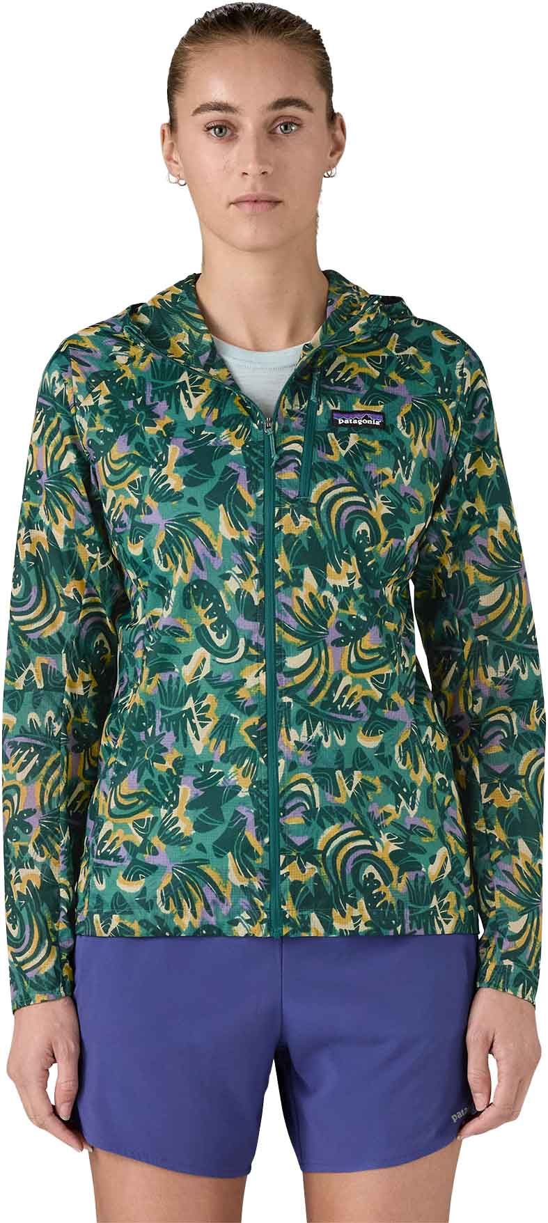 Veste Houdini Jkt Wild Botanist Wetland Blue femme Patagonia, ultralégère en nylon recyclé indéchirable, déperlante sans PFC, se plie dans sa poche poitrine; capuche réglable, poignets semi-élastiqués et taille ajustable pour protection ajustée contre l’humidité et le froid.