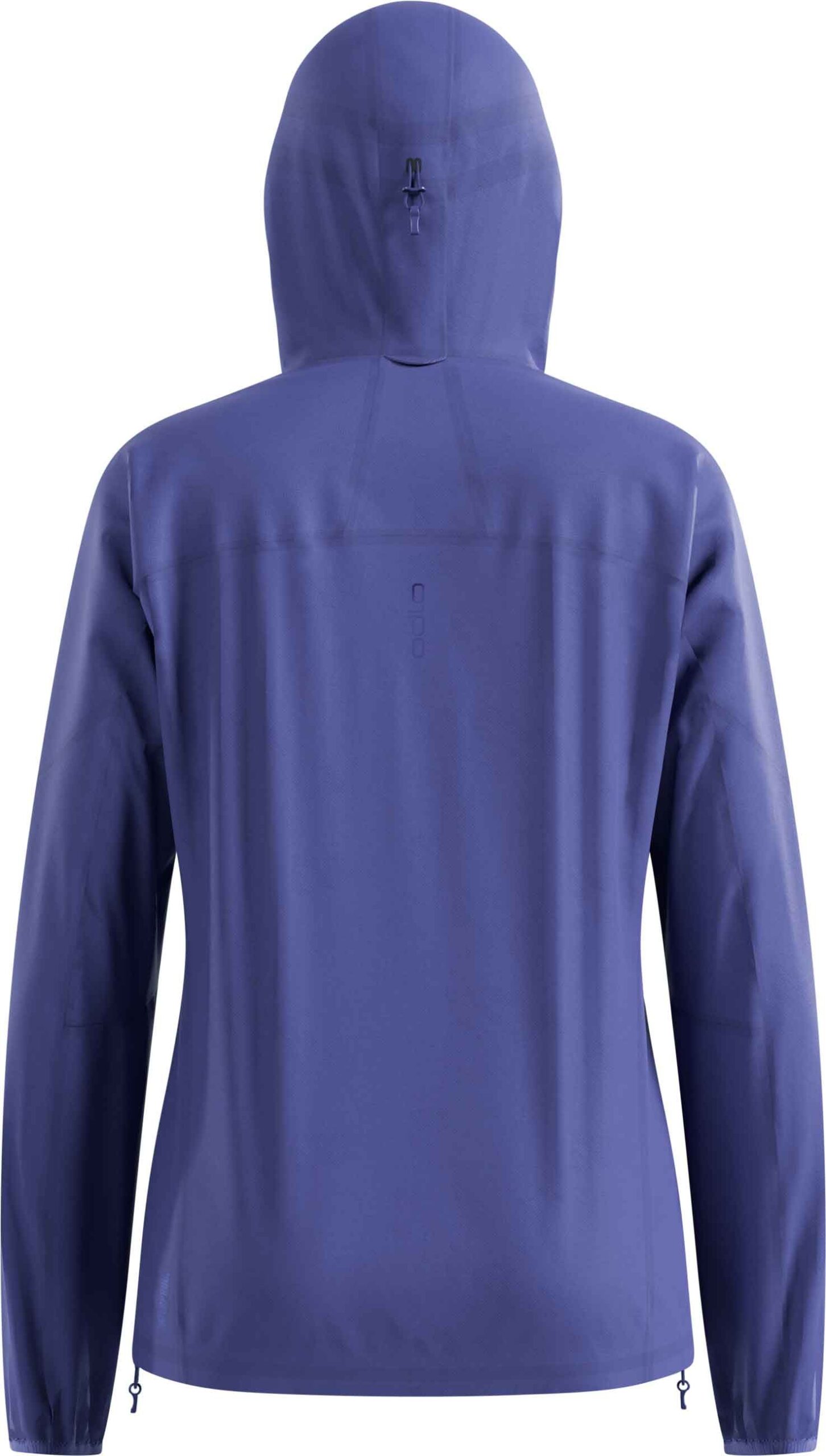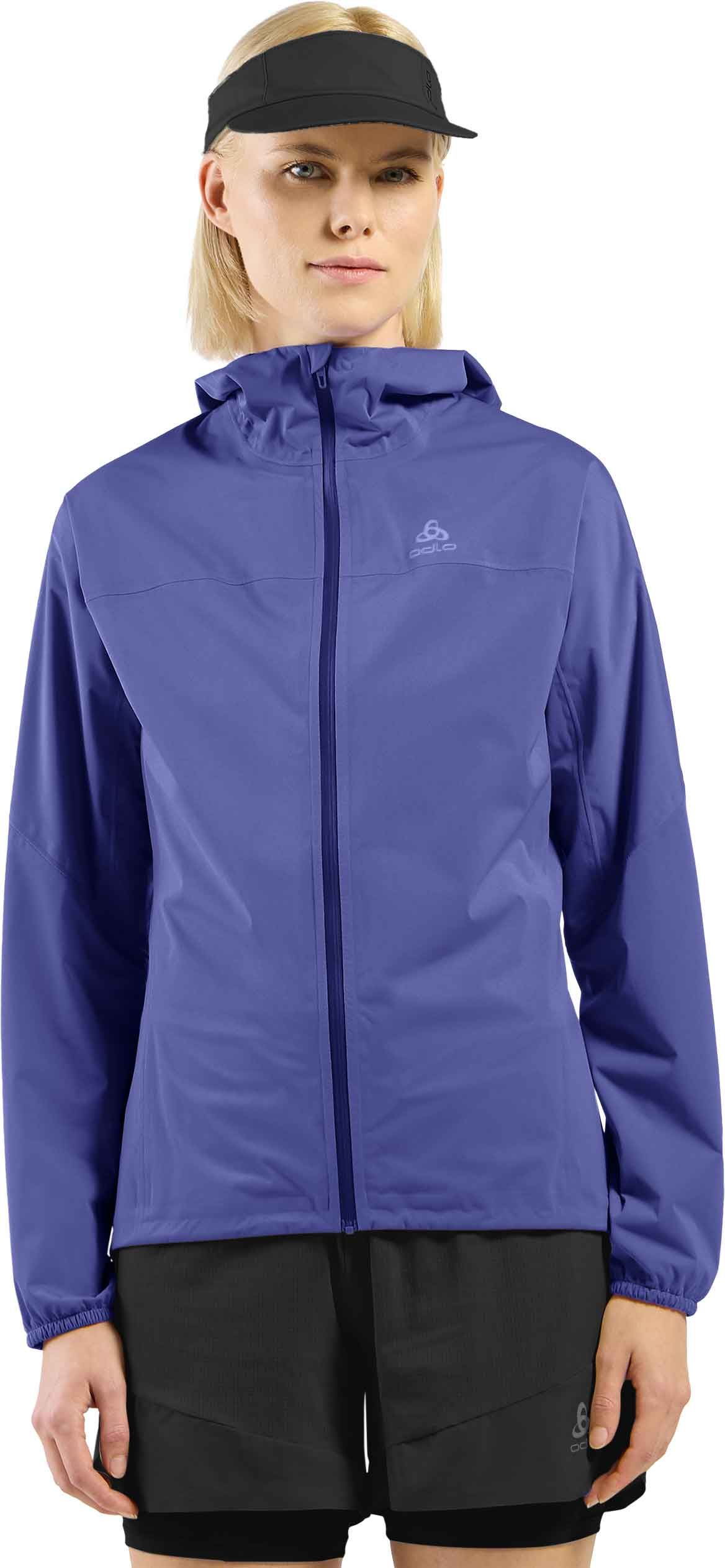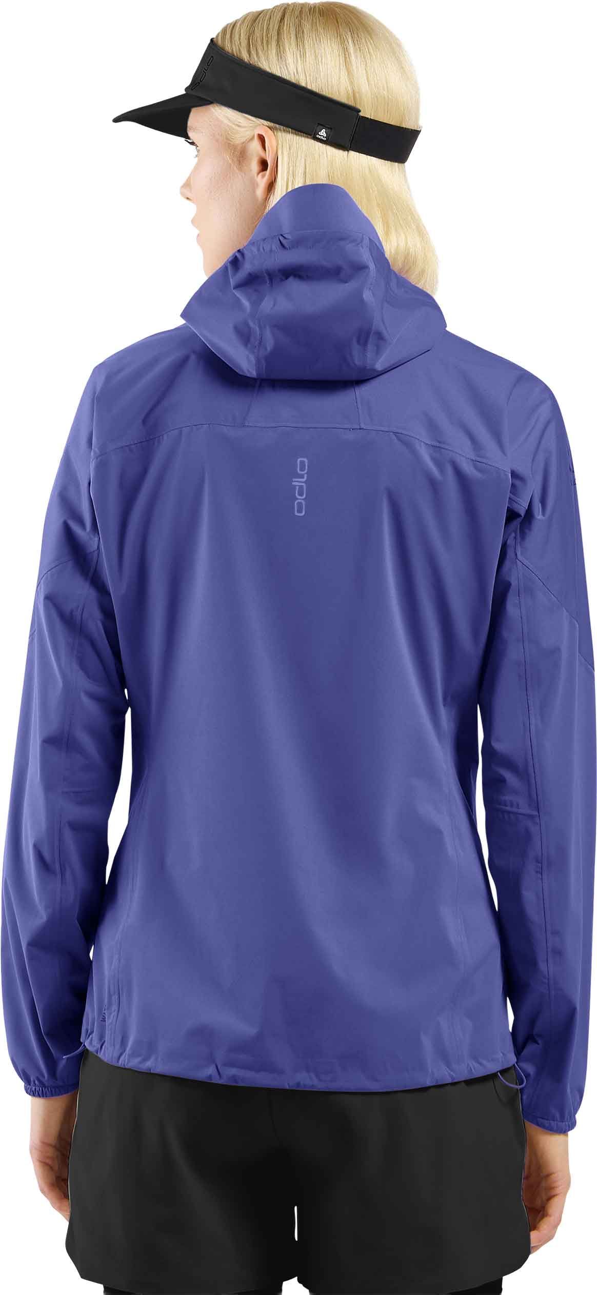 Veste running femme Odlo Zeroweight Waterproof Jacket Skipper Blue en tissu 2,5 couches recyclé, imperméable et respirante, coupe ajustée avec capuche et ourlet réglables, se range dans sa poche capuche, réfléchissante.