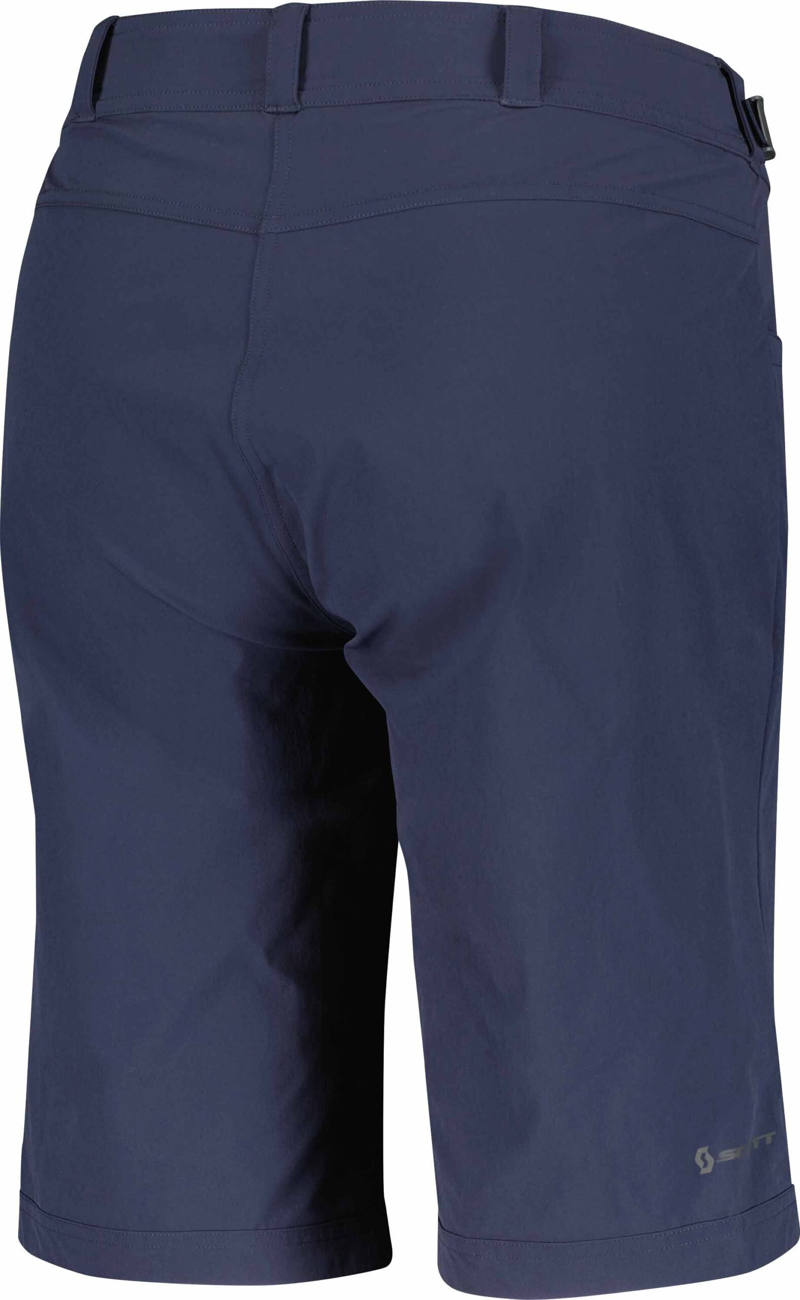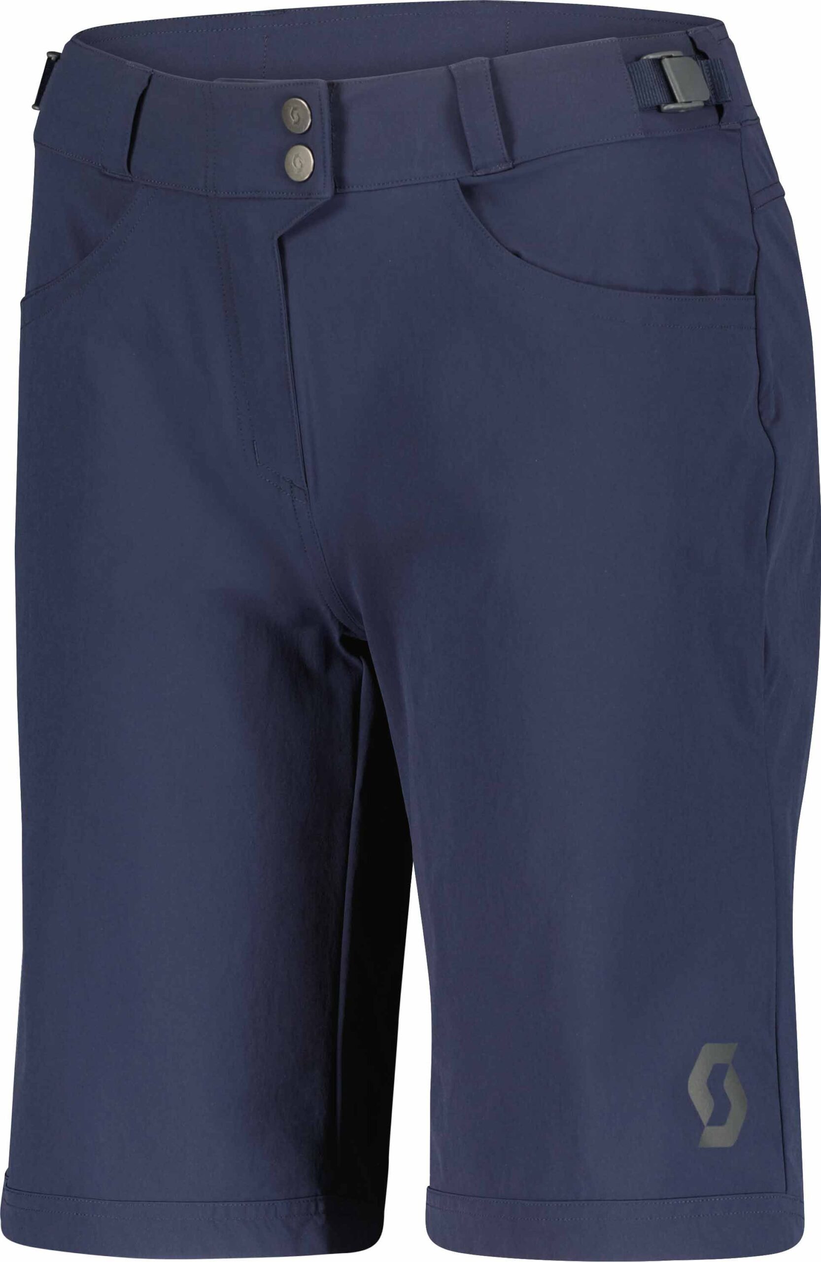 Short Scott W’s Trail Flow W/Pad Dark Blue pour femme, coupe longue stretch DUROxpand avec traitement déperlant DRYOzone DWR et short intérieur amovible à technologie + Sport Padding pour vos sorties VTT.