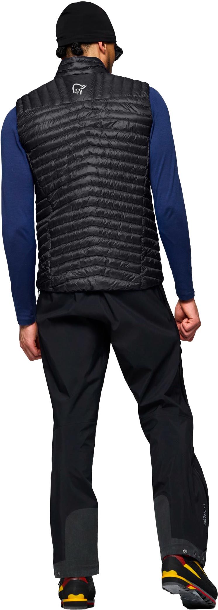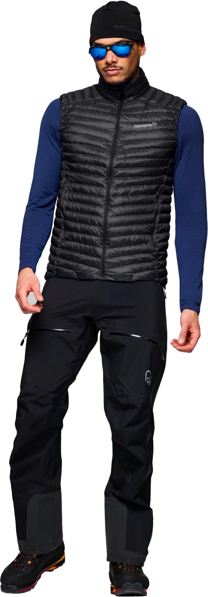 La doudoune Norrona Trollveggen Down800 Super Light Vest Caviar Black pour homme allie isolation 800 CUIN et tissu aeroDownproof pour l’alpinisme par temps froid.