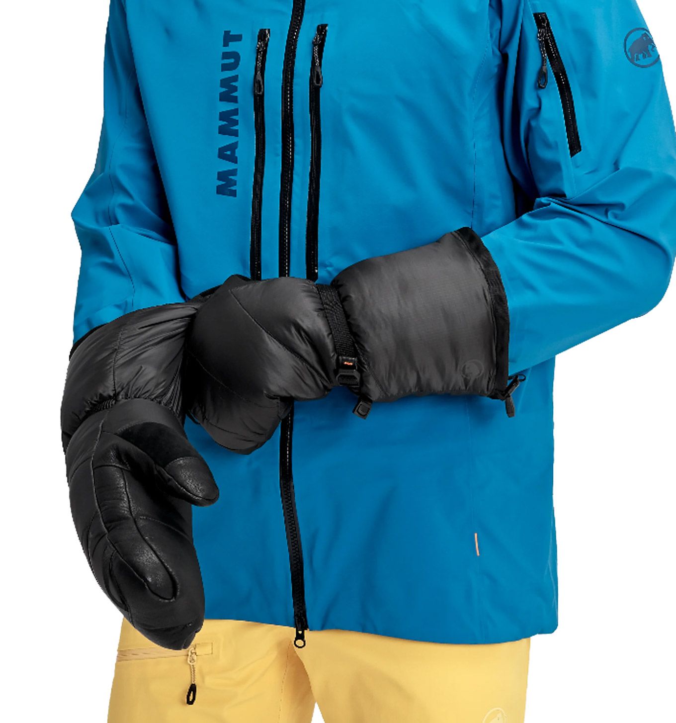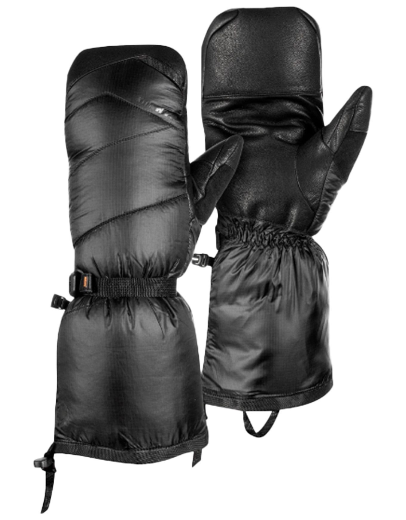 Moufles d’alpinisme Mammut Arctic Mitten Black en Pertex® Quantum coupe-vent, isolation PrimaLoft® Gold, paumes cuir, dragonnes et poignets ajustables.