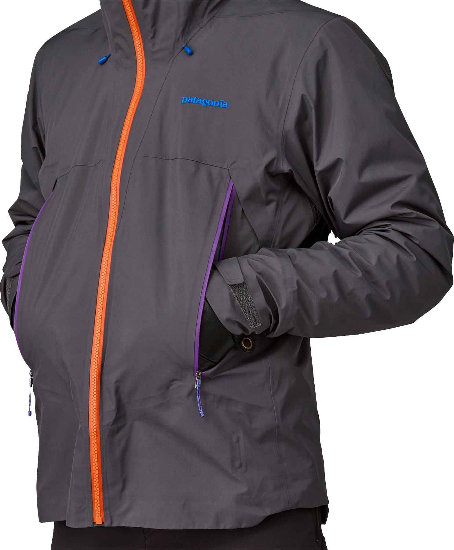 Sur le plan pratique, on note la présence d’une capuche conçue pour être portée avec un casque, de multiples poches stratégiquement positionnées permettant un accès rapide tout en étant compatibles avec un baudrier. Des ouvertures d’aération latérales sous les bras facilitent une ventilation rapide, et l’on trouve également le réflecteur RECCO® pour une sécurité supplémentaire.
