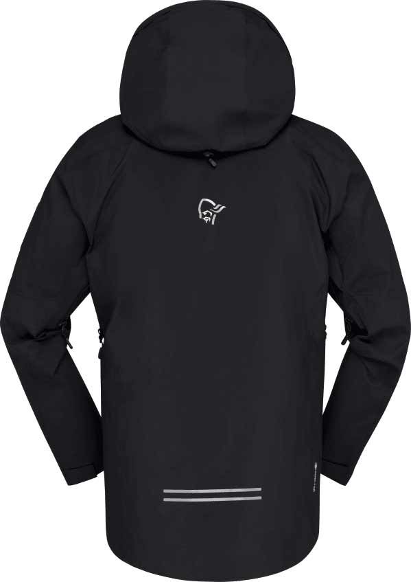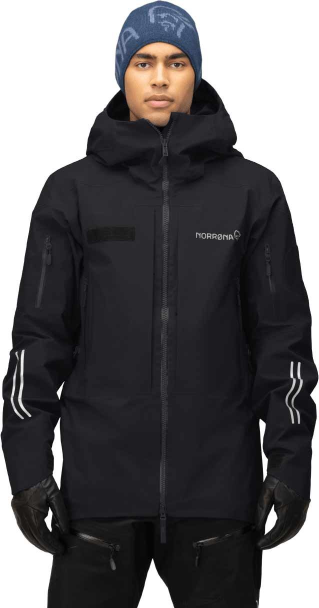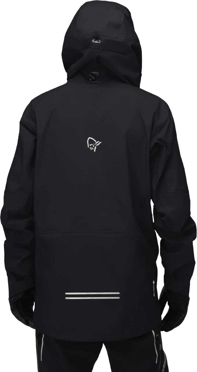 Veste technique Trollveggen Gore-Tex Pro Rescue Caviar Black homme Norrona : membrane GORE-TEX PRO en nylon recyclé, coupe-vent, imper-respirante, capuche casque, poches étanches, réglages ourlet/poignets.