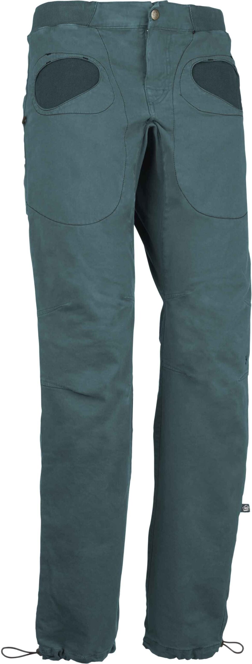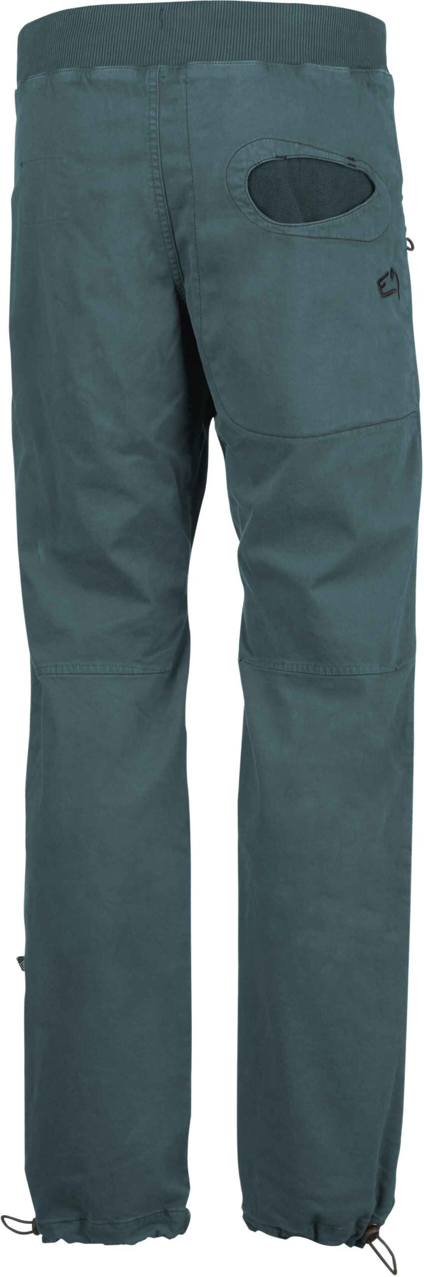 Pantalon d’escalade E9 Rondo Slim Dark Teal en satin coton bio et élasthanne, respirant, extensible, avec poches passepoilées et porte-brosses latéraux.
