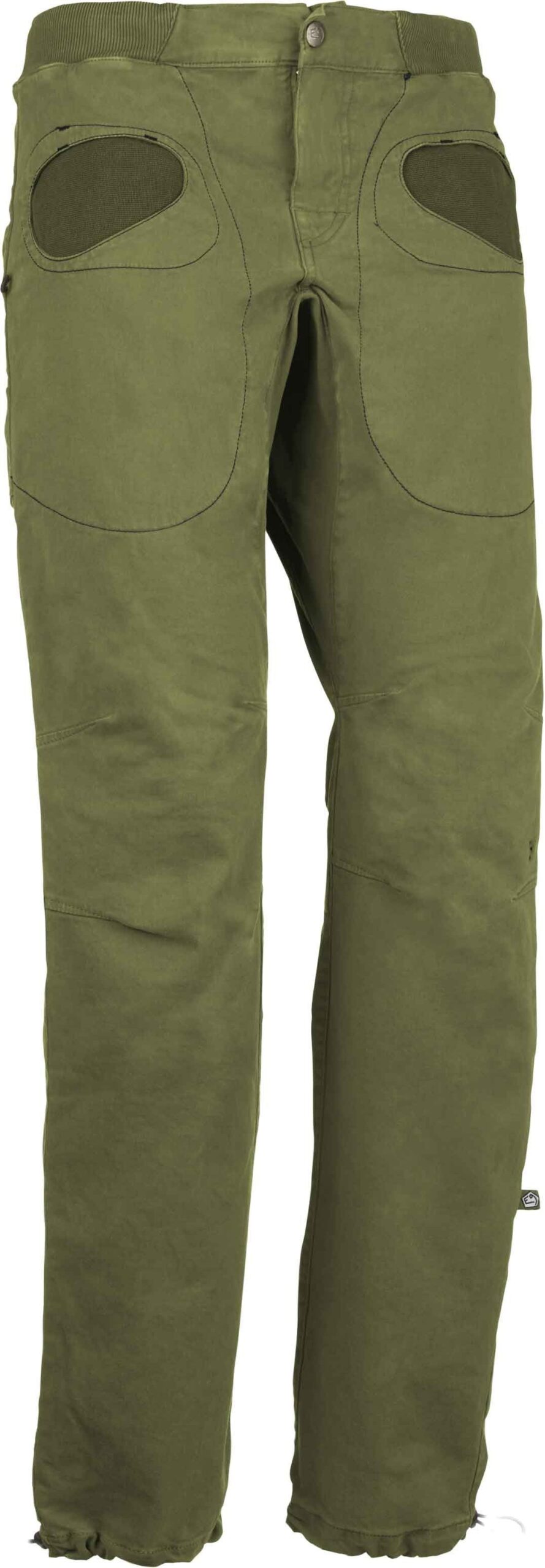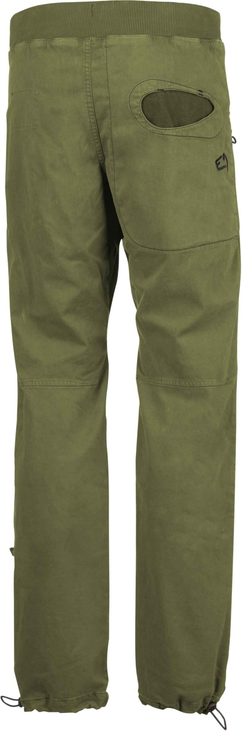 Pantalon d’escalade E9 Rondo Slim Rosemary pour homme, en satin coton bio élasthanne respirant, offre liberté de mouvement, porte-brosses latéraux et bas de jambe ajustables.