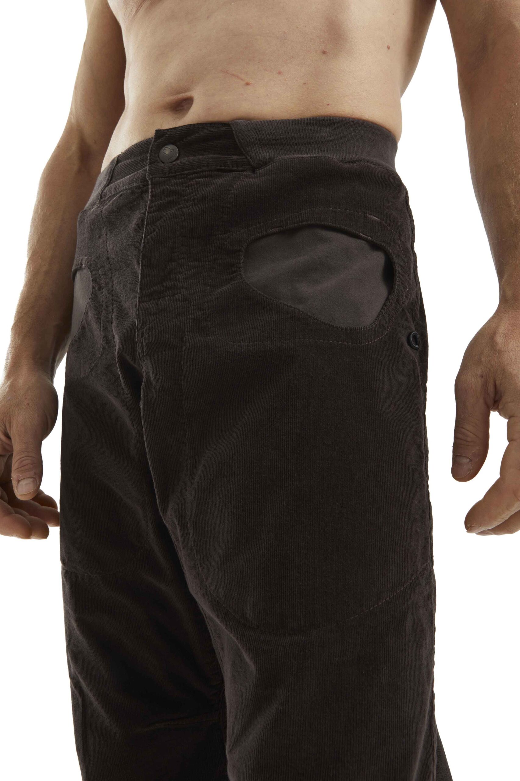 Pantalon d’escalade homme E9 Rondo VS2 Steel Blue en velours côtelé coton bio élasthanne, respirant et extensible, avec poches latérales, poche arrière, porte-brosses et bas ajustables.