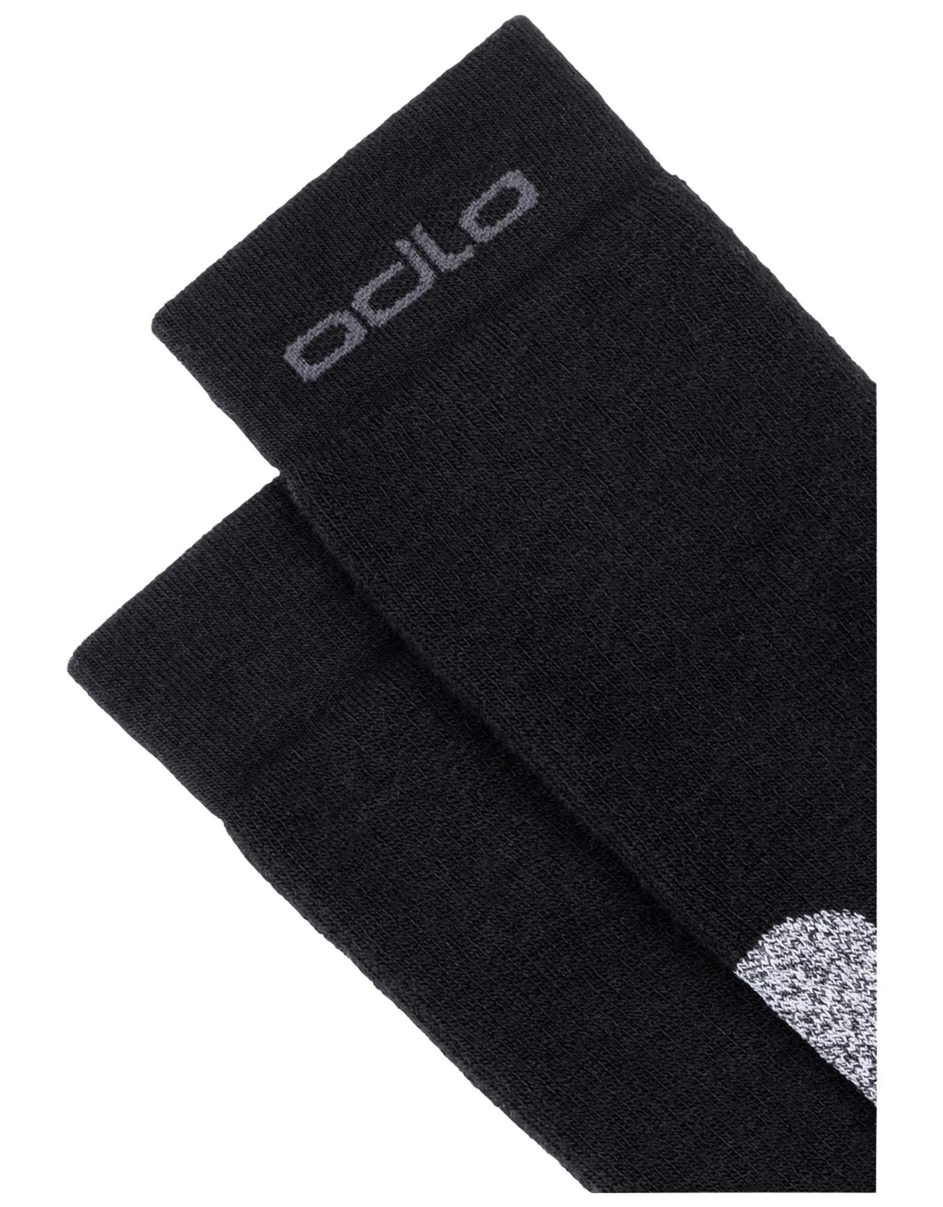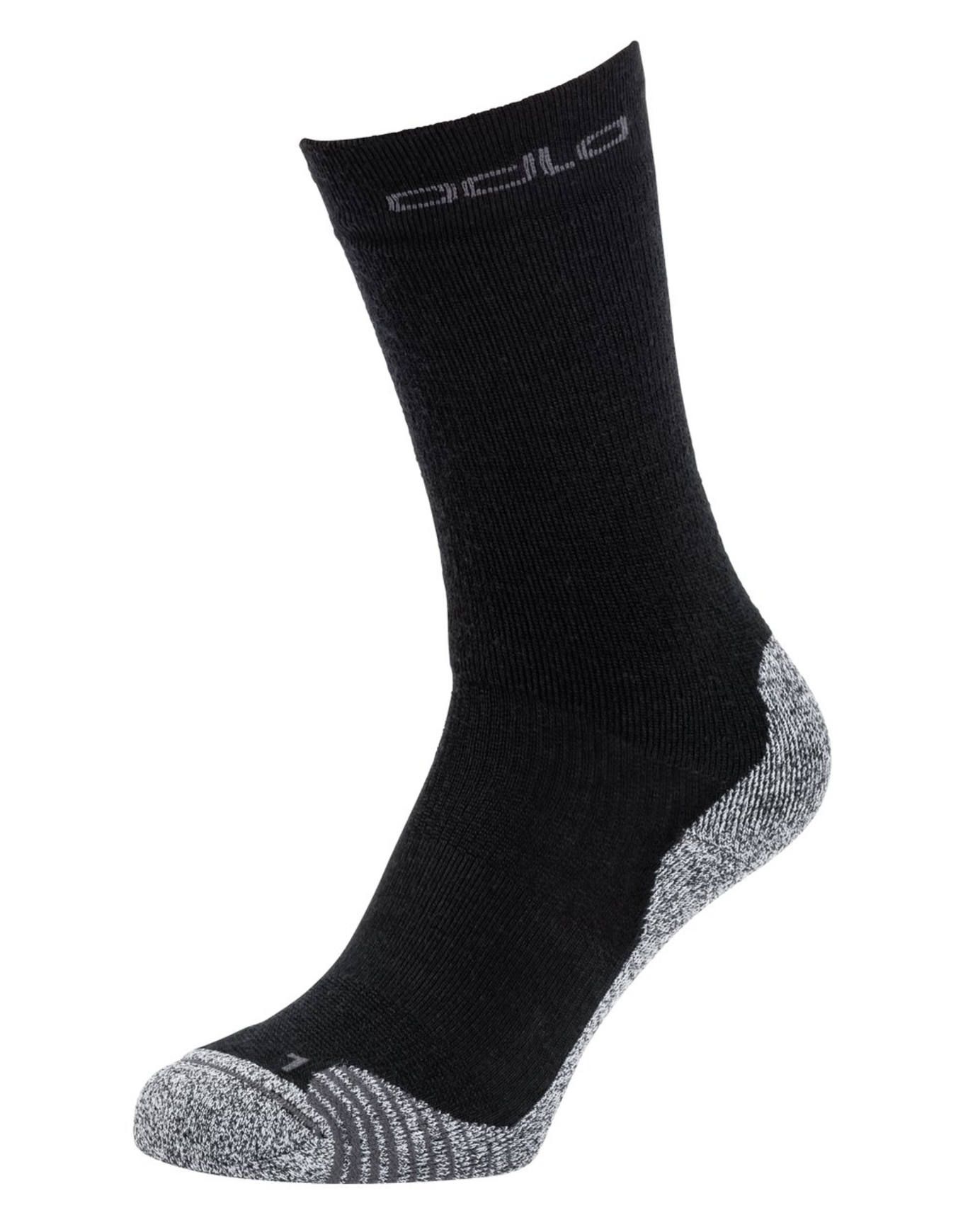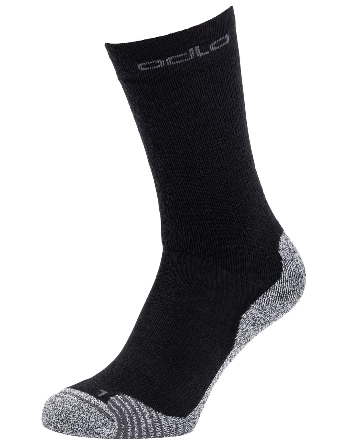 Chaussettes de randonnée Odlo Crew Active Warm Hiking Black unisexes, légères et chaudes en 42 % laine mérinos isolante et anti-odeurs, avec technologie Ceramiwarm maintenant la chaleur jusqu’à +3 °C et construction sans coutures mi-mollet pour un confort durable sur sentier.