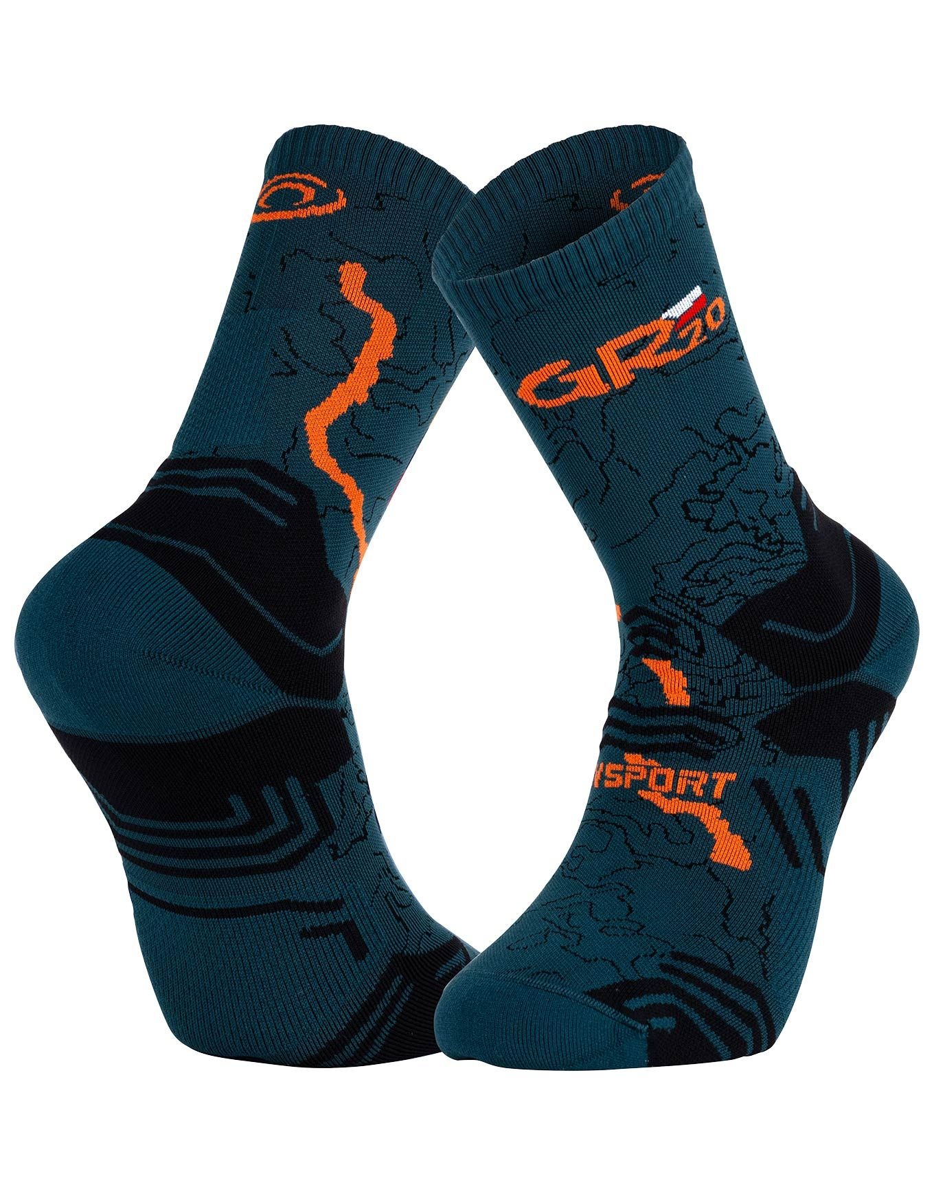 Les Trek GR Haute Polyamide GR20 Vert/Orange signées BV Sport sont des chaussettes techniques conçues pour résister, spécialement pensées pour la randonnée courte ou longue. Produites en France, elles intègrent une semelle anatomique 3D ultra-renforcée qui renforce la stabilité du pied dans la chaussure tout en amortissant les chocs au sol. Le maintien à 360° enveloppe la cheville en stabilisant le pied dans la chaussure. Des renforts ciblés épousent les zones stratégiques sujettes à échauffement ou frottement sur les sentiers escarpés : tendon d’Achille, points de laçage, talon et pointe. La maille légère évacue la transpiration durant l’effort et les bords côte larges évitent l’effet garrot tout en assurant la tenue. Coutures plates pour limiter les frottements et irritations, et forme asymétrique adaptée à l’anatomie de chaque pied. Découvrir les catégories associées Chaussettes de randonnée Vêtements outdoor homme Vêtements randonnée