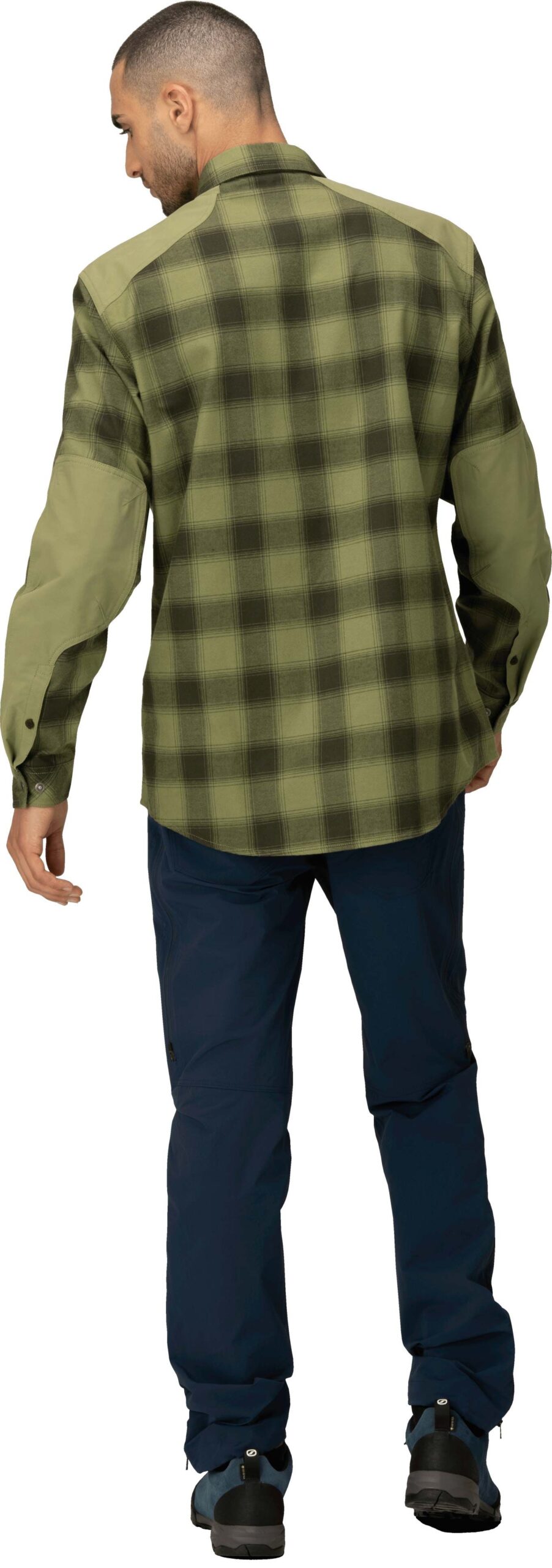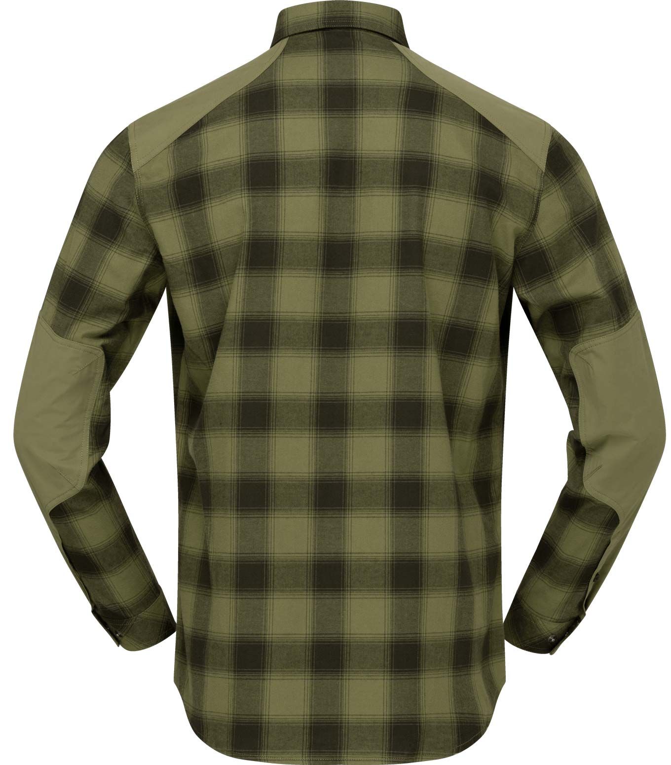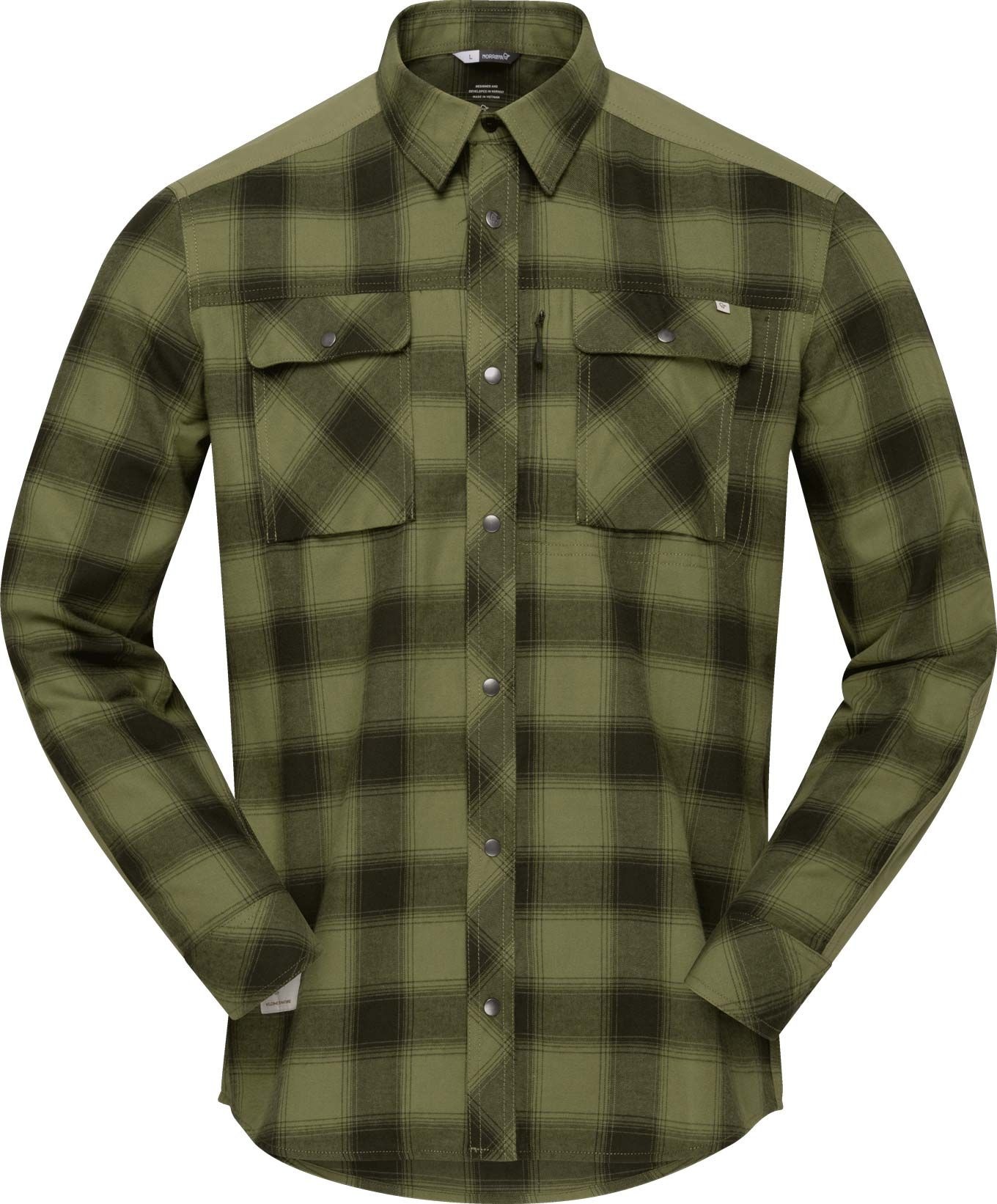 Chemise Femund Flannel Shirt Rosin de Norrona, en flanelle coton organique et laine, respirante, anti-odeurs, épaules et coudes renforcés coupe-vent, coupe classique et bras articulés pour la randonnée outdoor.