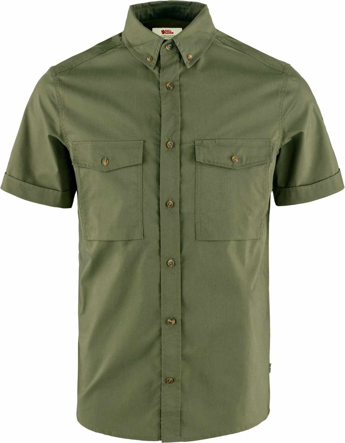 Chemise Fjällräven Övik Air Stretch SS Shirt Laurel Green homme en polyester et coton bio aéré, coupe décontractée, liberté de mouvement, col boutonné, deux poches poitrine, manches retroussables.