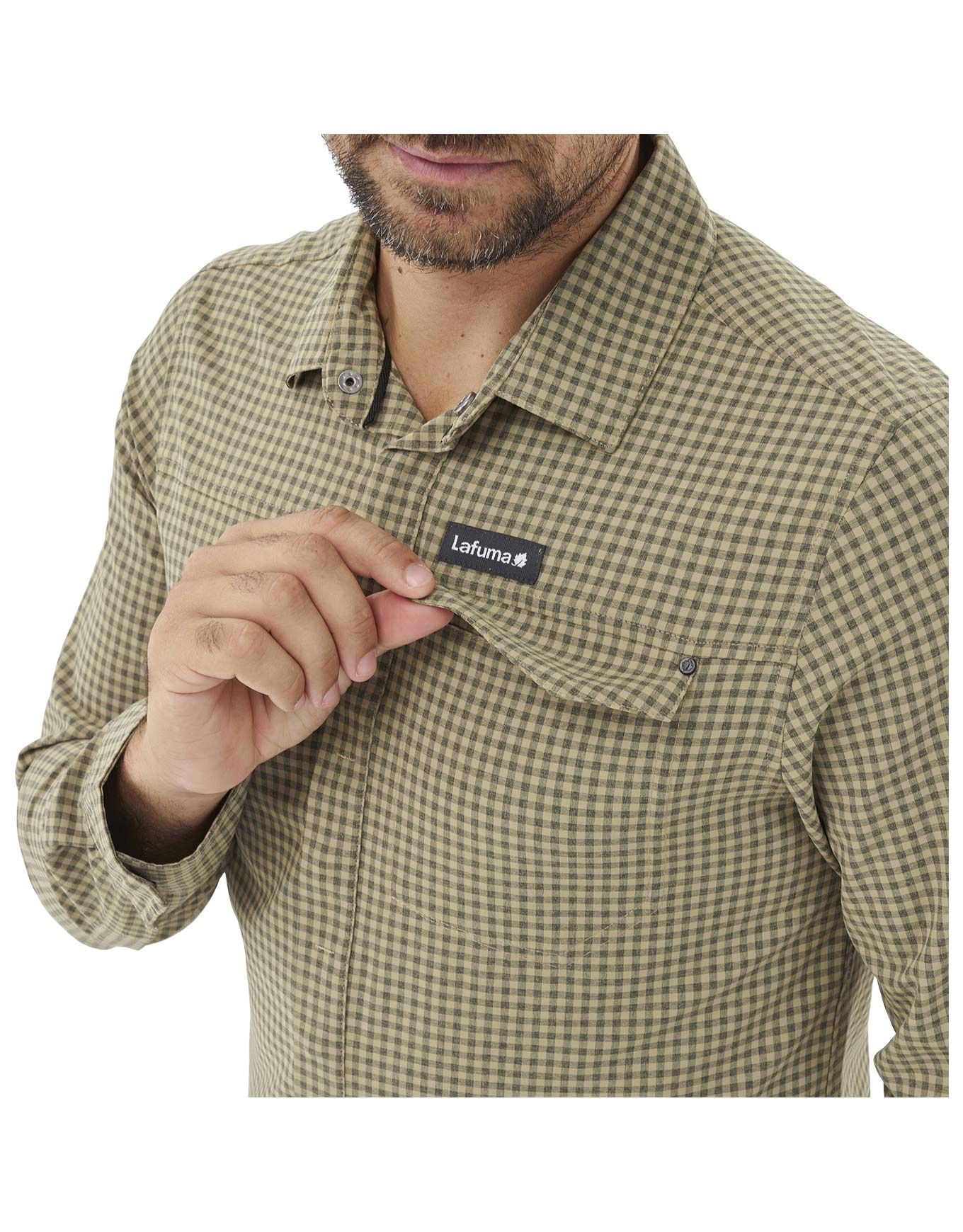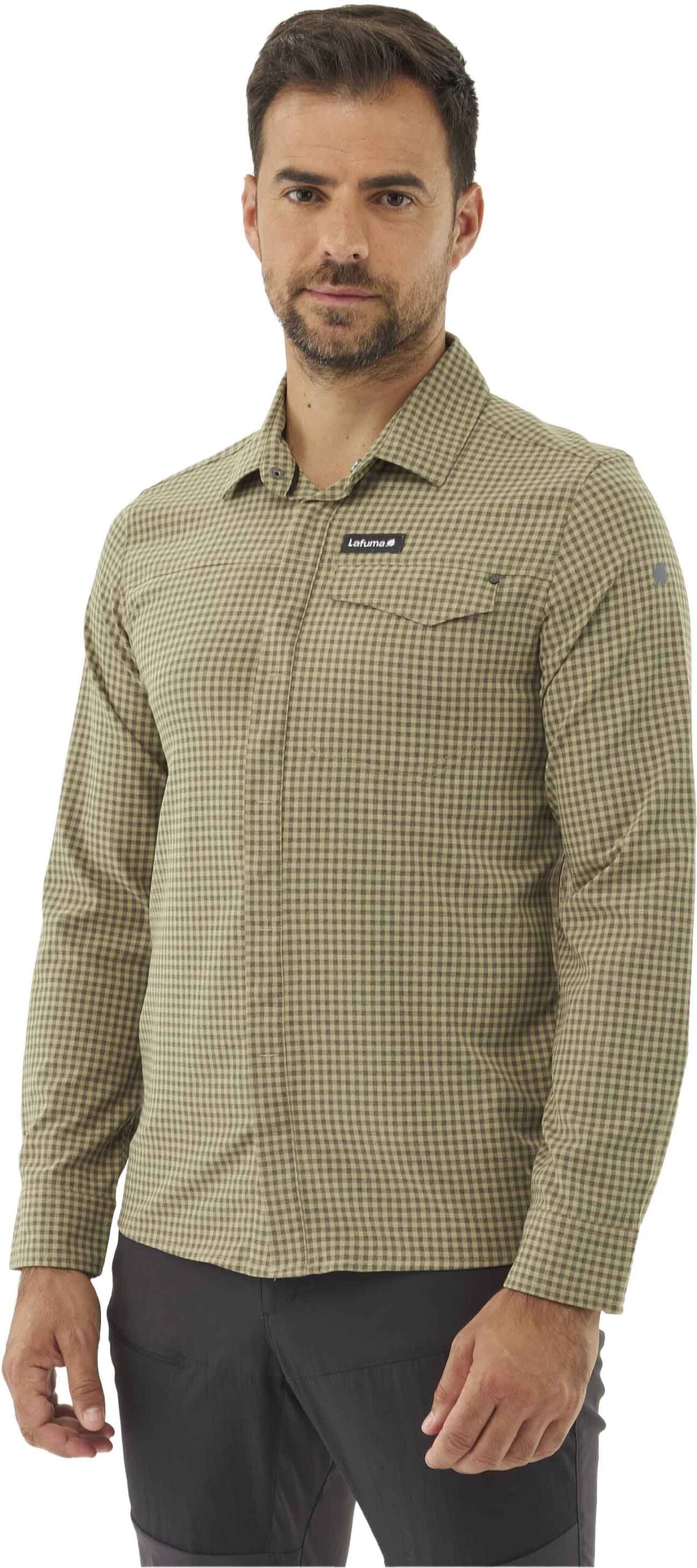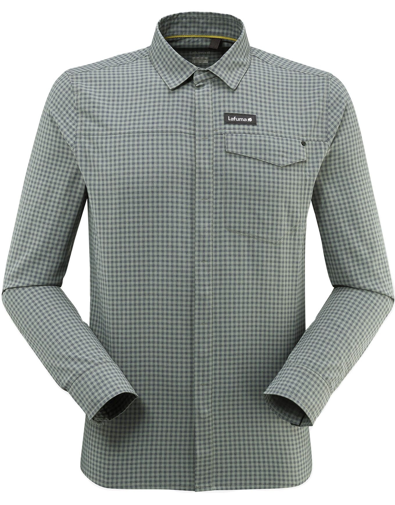 Chemise Lafuma Skim Shield LS Castor Grey à carreaux pour homme, conçue en stretch DryWay pour la randonnée : respirante, sèche vite, anti-moustiques géraniol, poche poitrine.