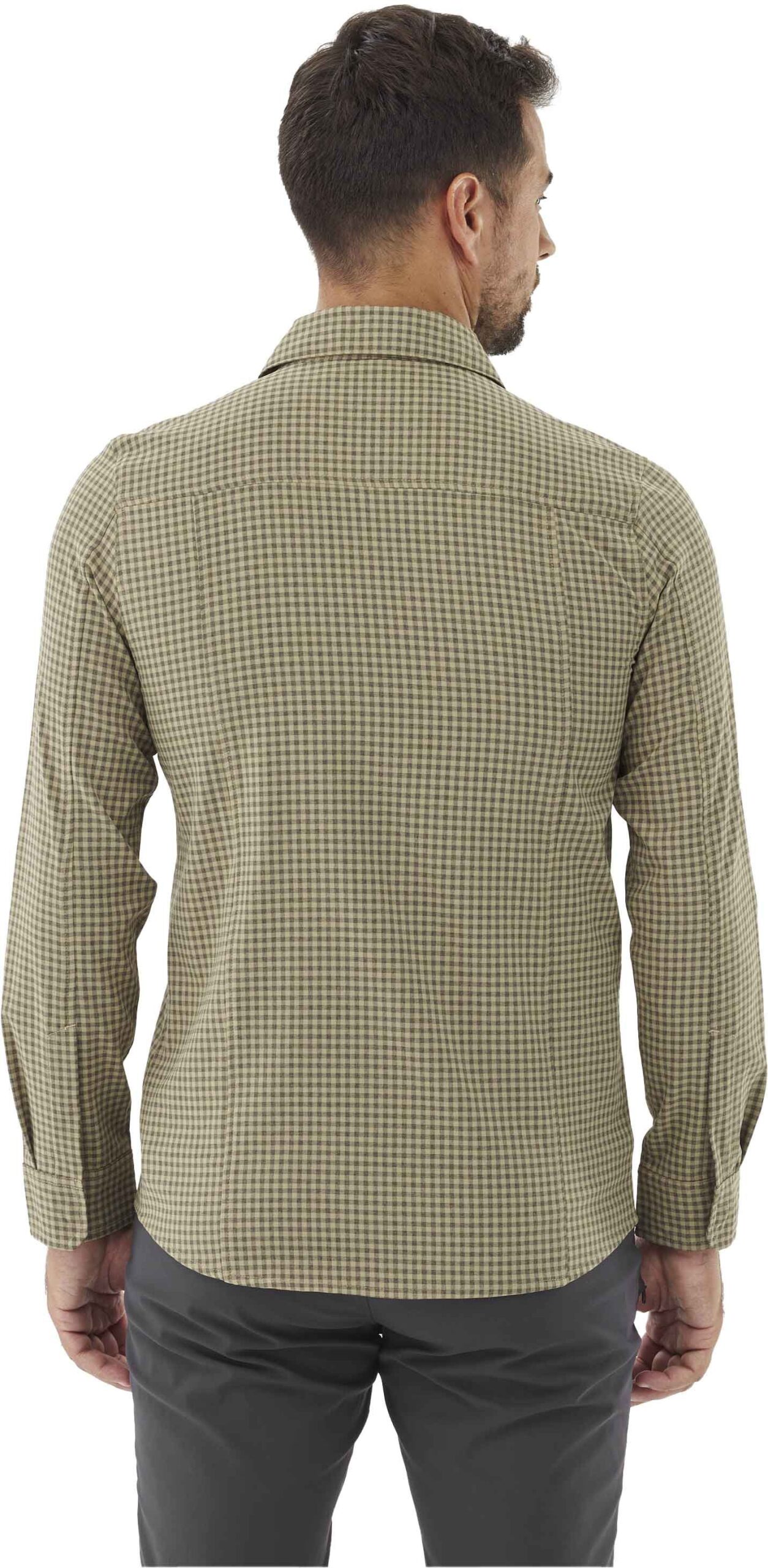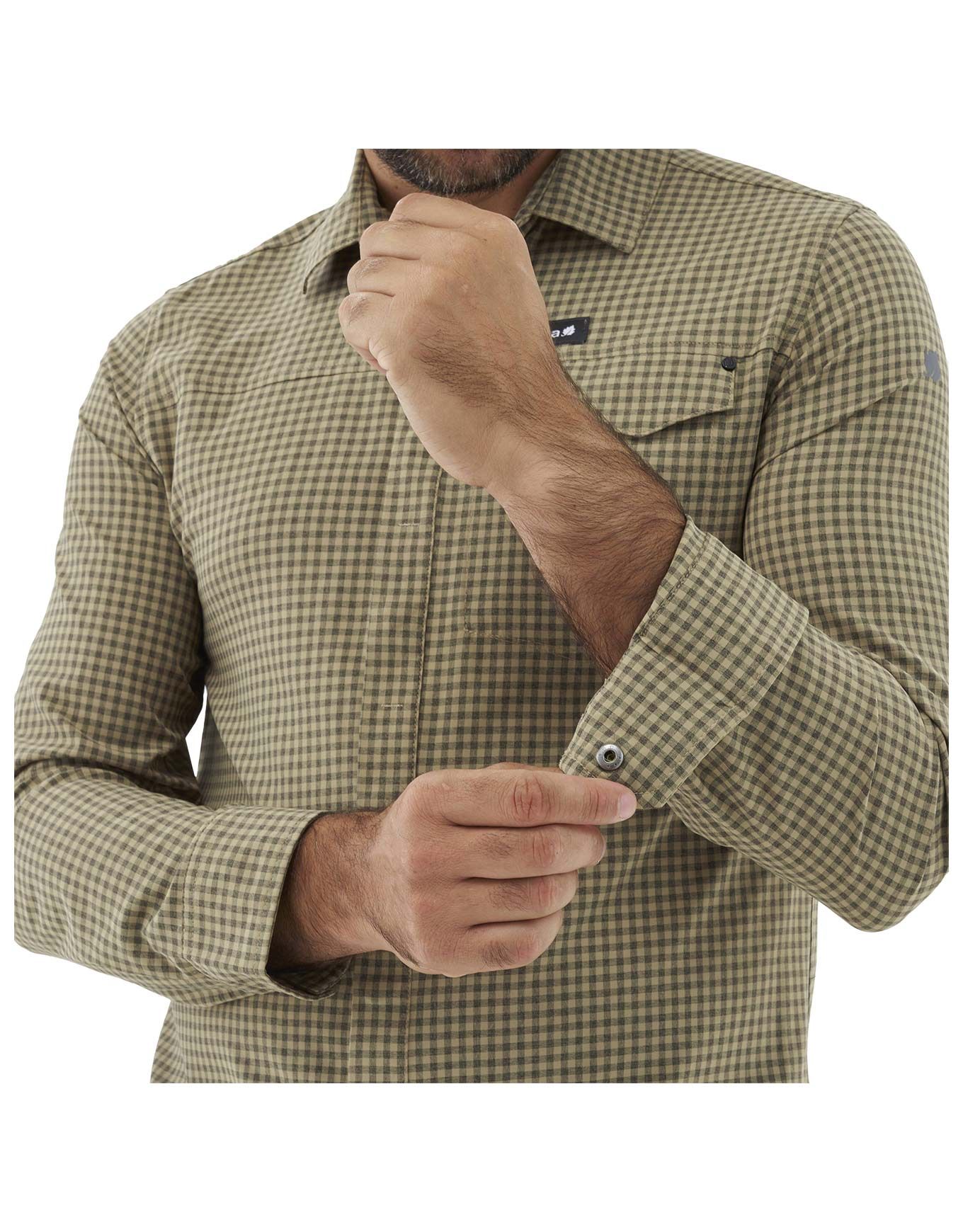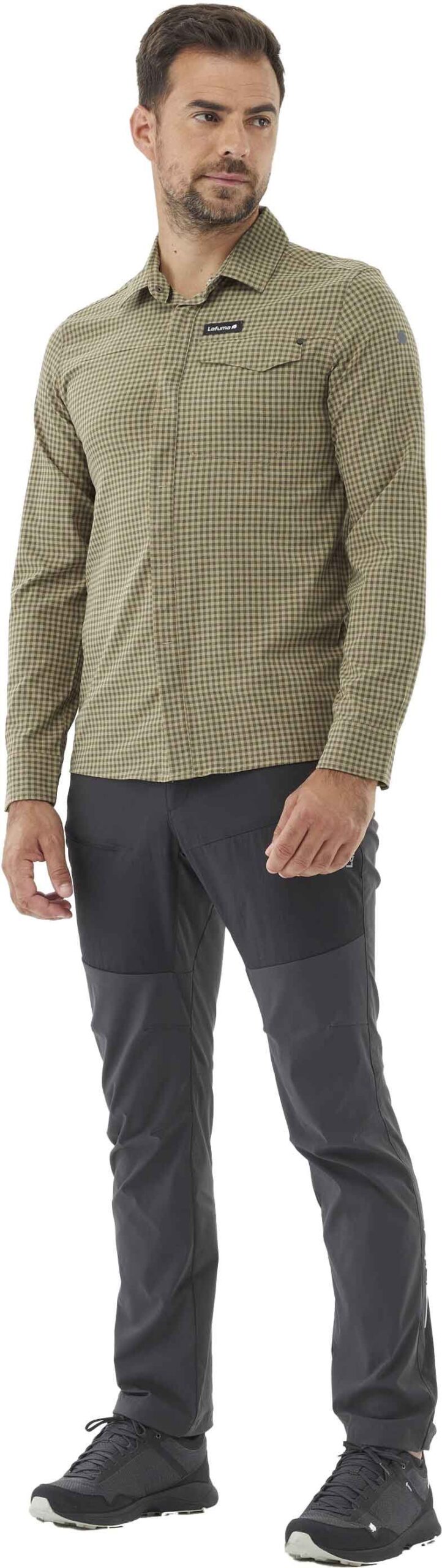 Chemise Lafuma Skim Shield LS Castor Grey à carreaux pour homme, conçue en stretch DryWay pour la randonnée : respirante, sèche vite, anti-moustiques géraniol, poche poitrine.