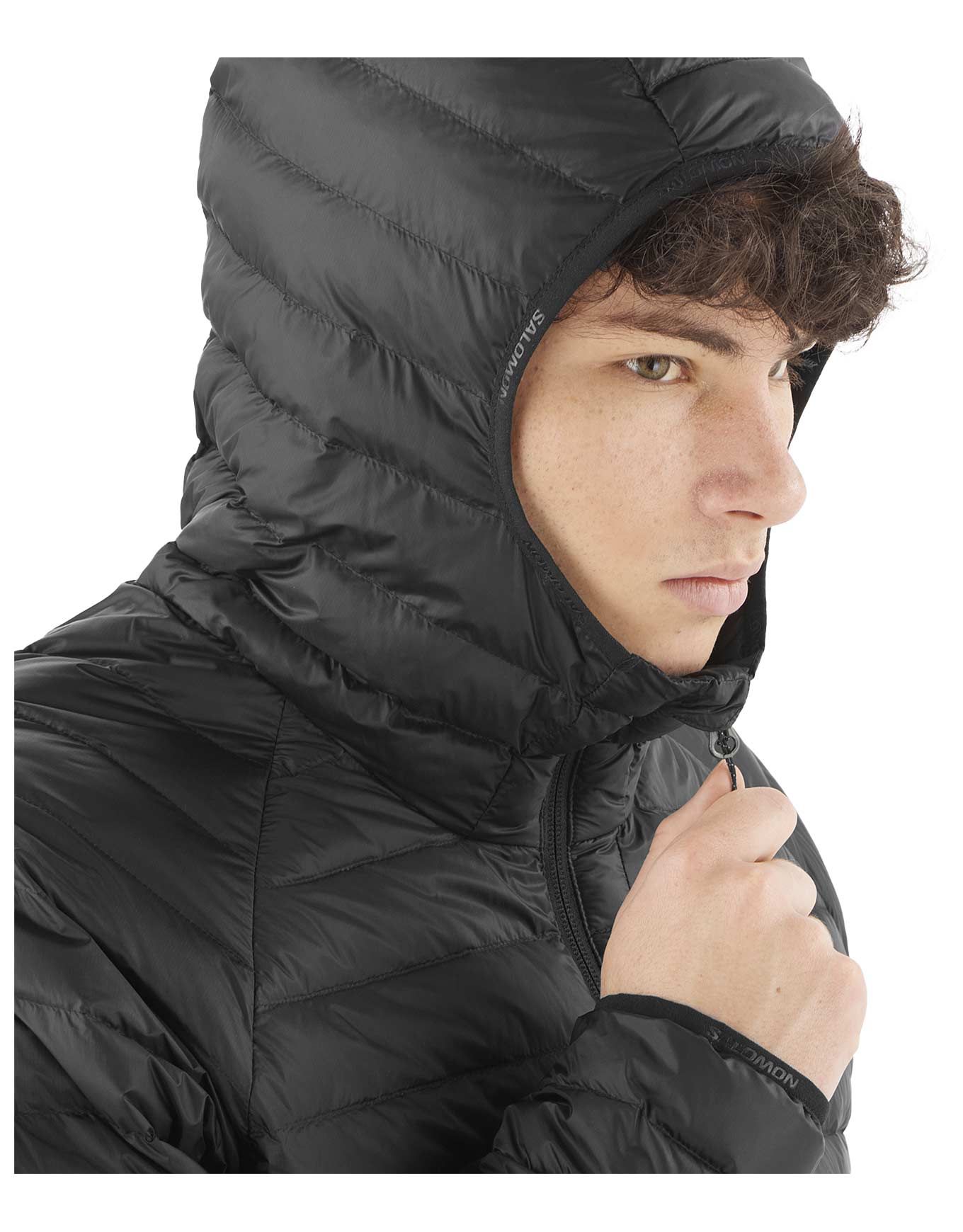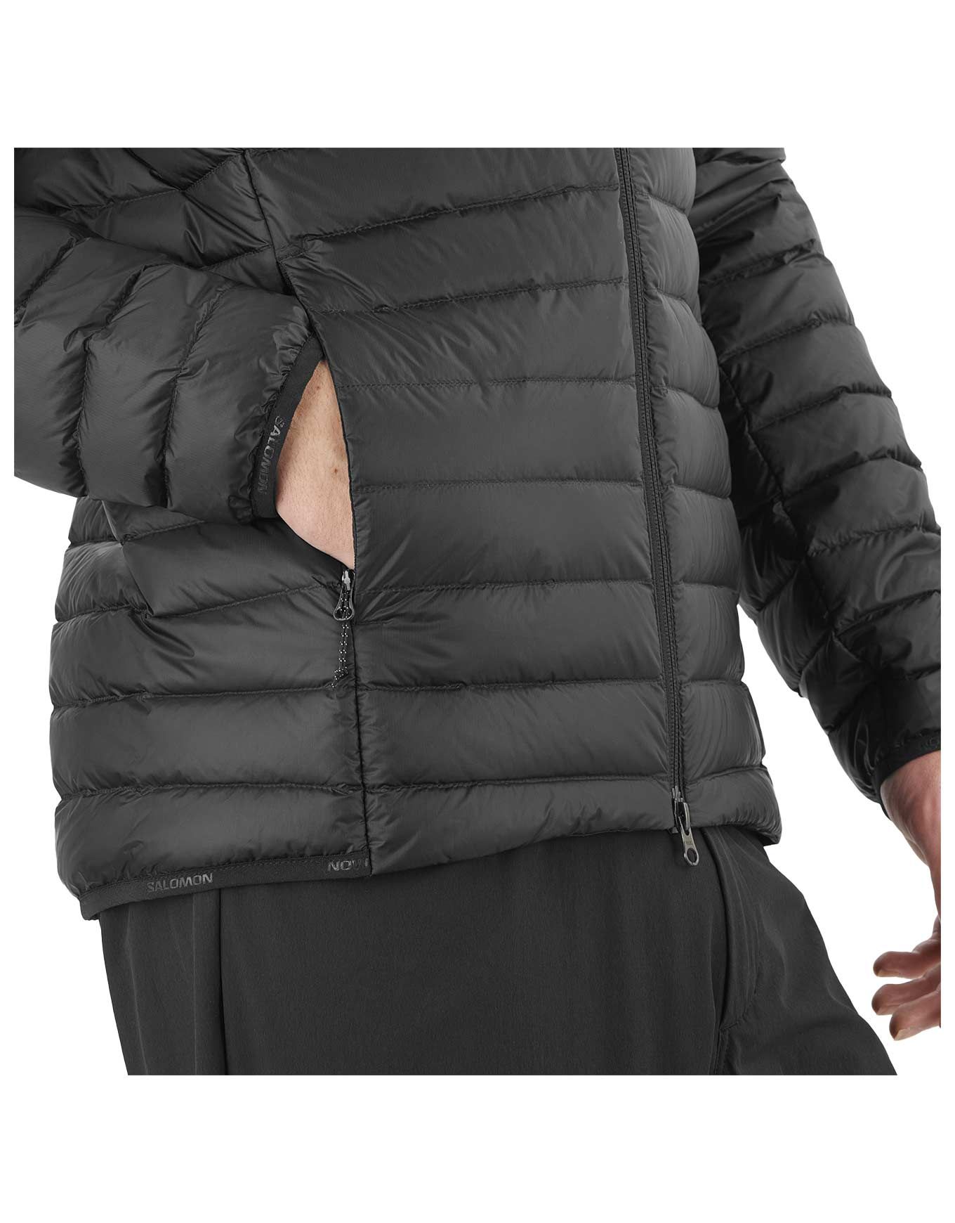 Doudoune Salomon Elixir Micro Down Jacket Deep Black pour homme, isolante en duvet d’oie 800 CUIN et technologie Advanced HeiQ XReflex™, légère et compressible pour ski ou randonnée hivernale. Capuche isolante, fermeture intégrale, poches zippées.