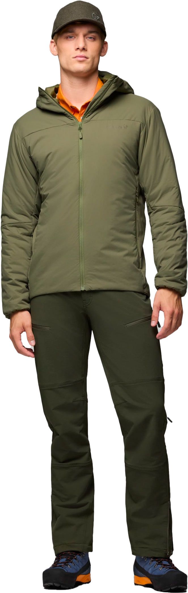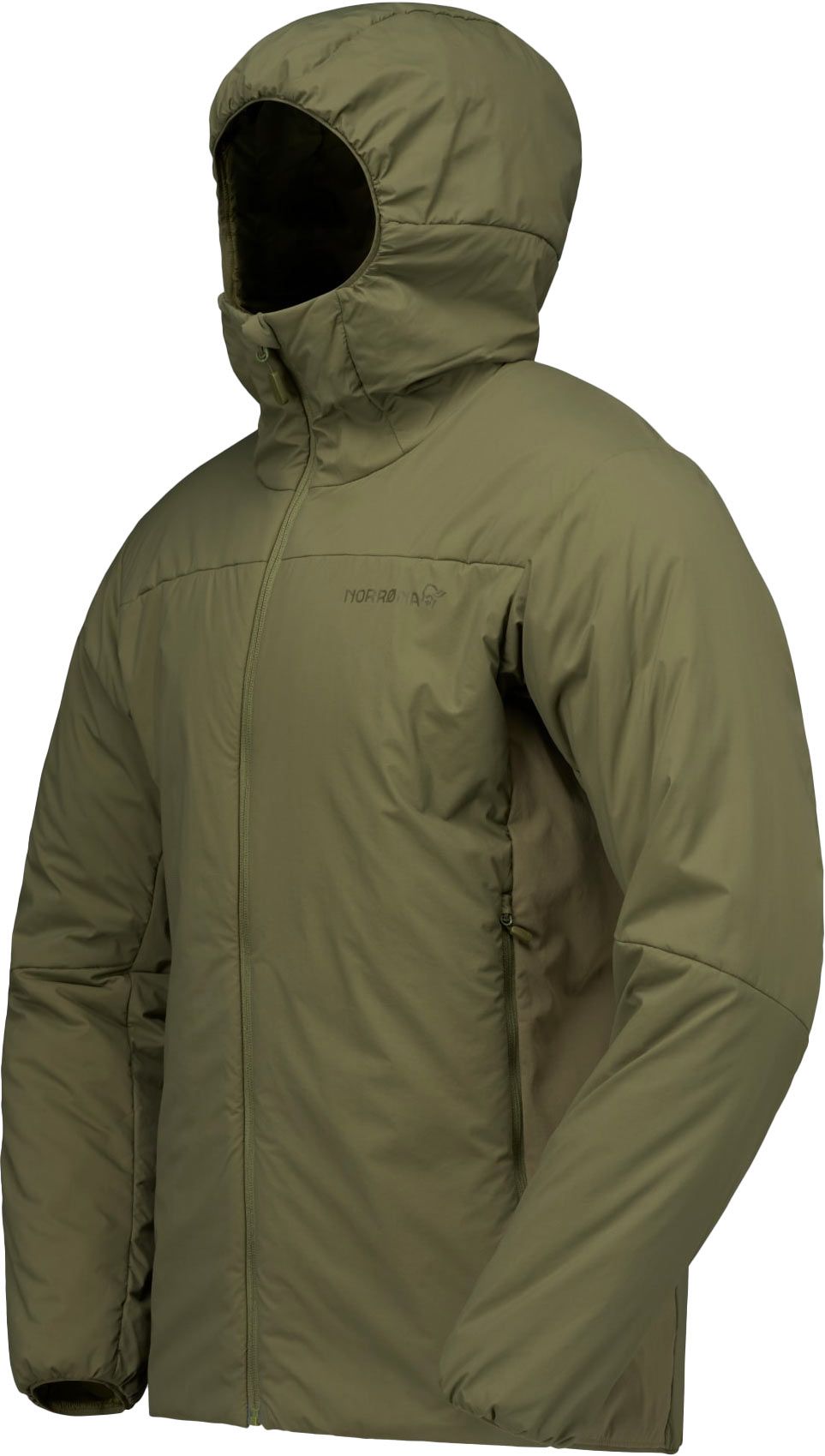 Doudoune à capuche Norrona Femund Thermo60 Zip Hood Olive Night pour homme, conçue pour la randonnée toutes saisons. Isolation synthétique Thermo60 60 g, tissu aeroDownproof coupe-vent et extensibilité HiLoflex latérale pour respirabilité et liberté de mouvement.