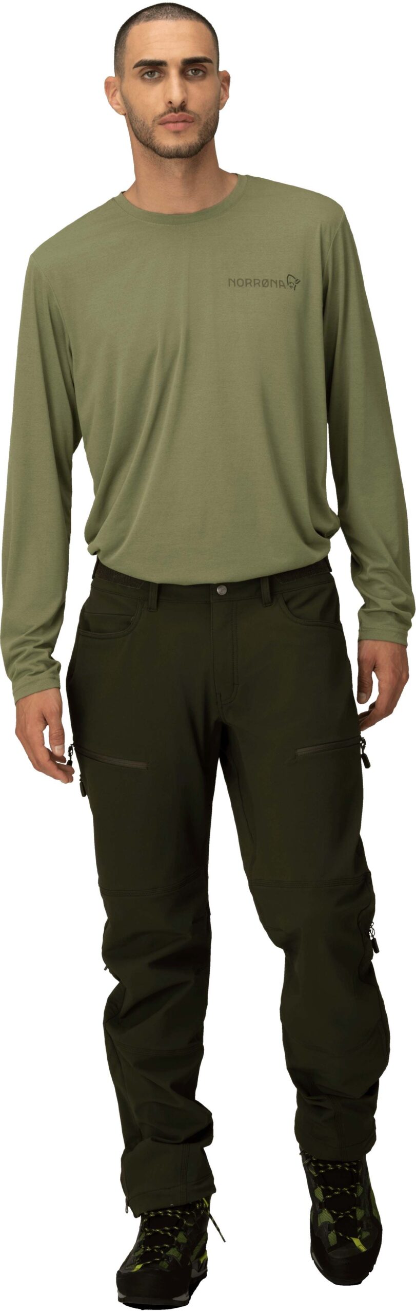 Pantalon softshell Norrona Femund Flex1 Rosin pour homme, conçu pour la randonnée et l’outdoor. Tissu flex1 déperlant, coupe-vent, respirant et 4 directions pour liberté de mouvement, taille Custom-fit™, poches zippées et ventilations latérales.