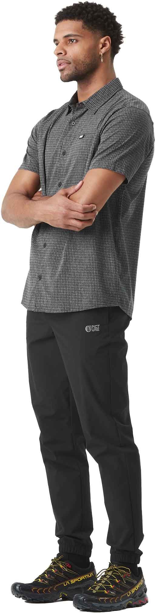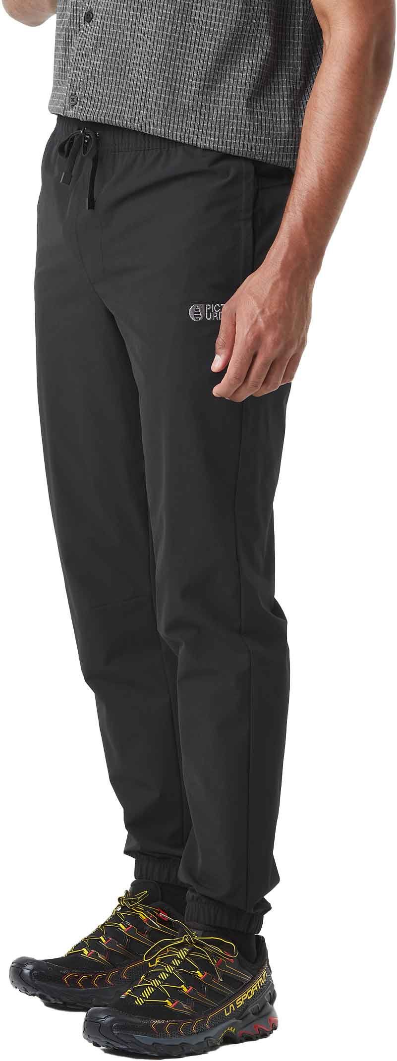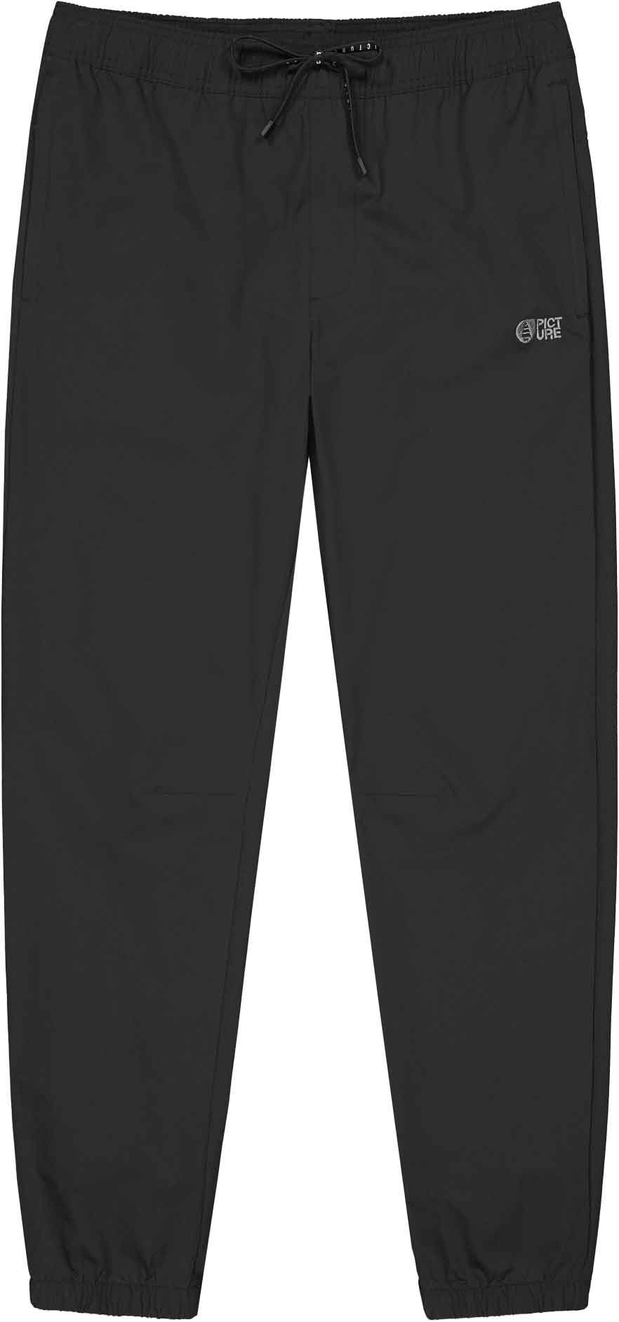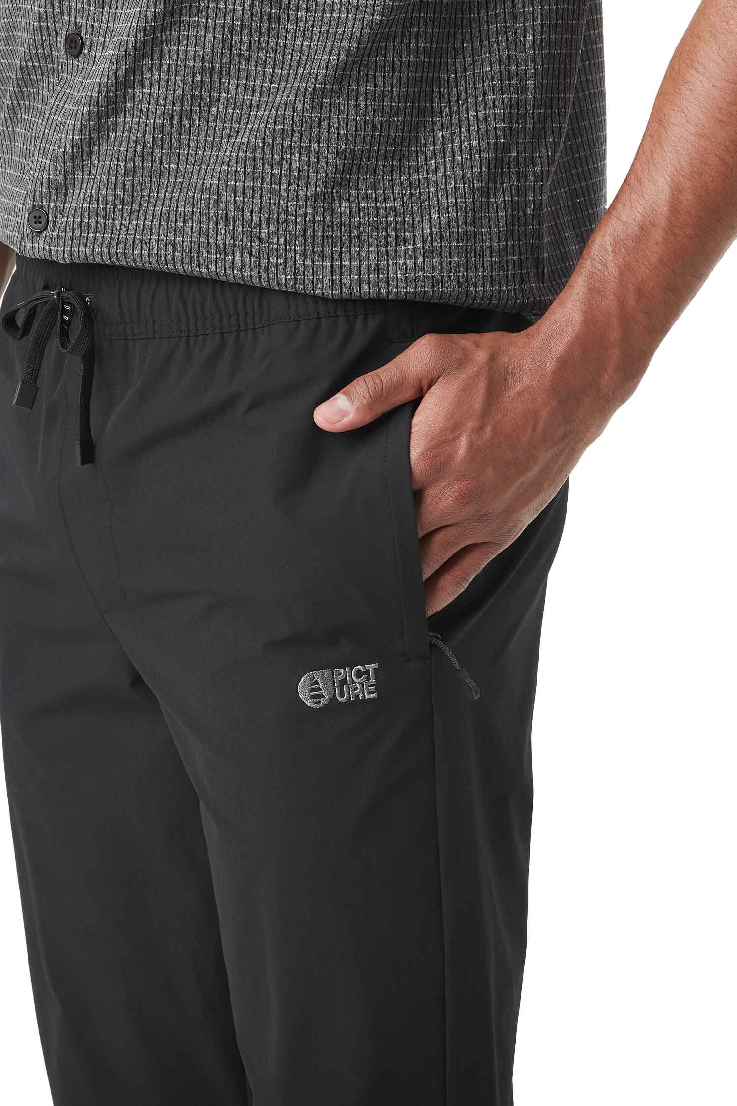 Le pantalon Lenu Black homme de Picture Organic Clothing allie stretch et technologie Dry Now avec traitement DWR pour évacuer l’humidité, taille extensible réglable, poches zippées et bas élastique.