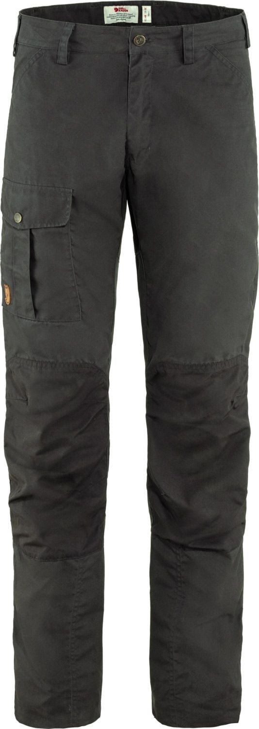 Pantalon Fjällräven Nils Trousers Dark Grey homme en G-1000® Silent Eco brossé, renforts G-1000® Eco aux genoux et à l’arrière pour robustesse et durabilité, idéal vie quotidienne, randonnée et cueillette.