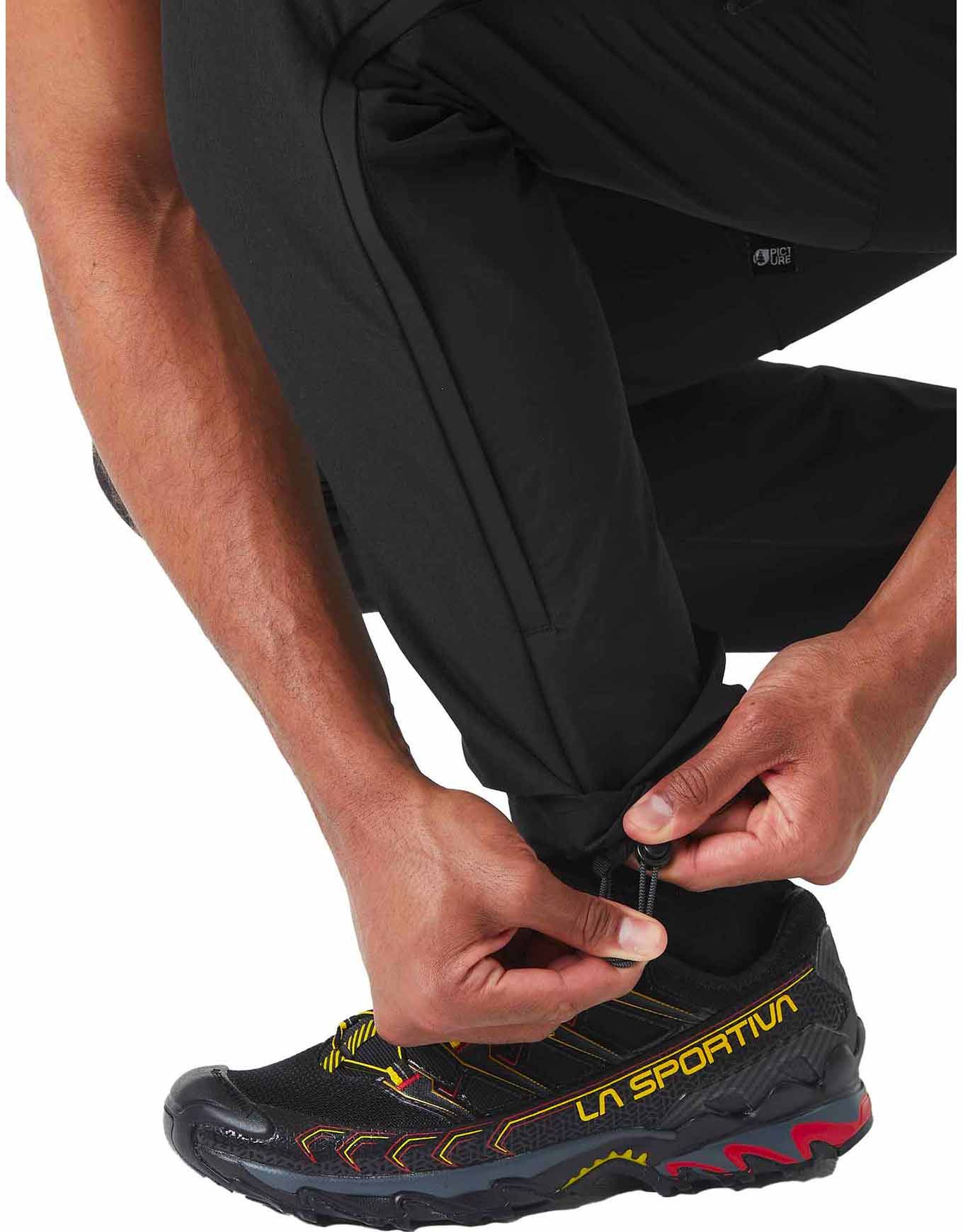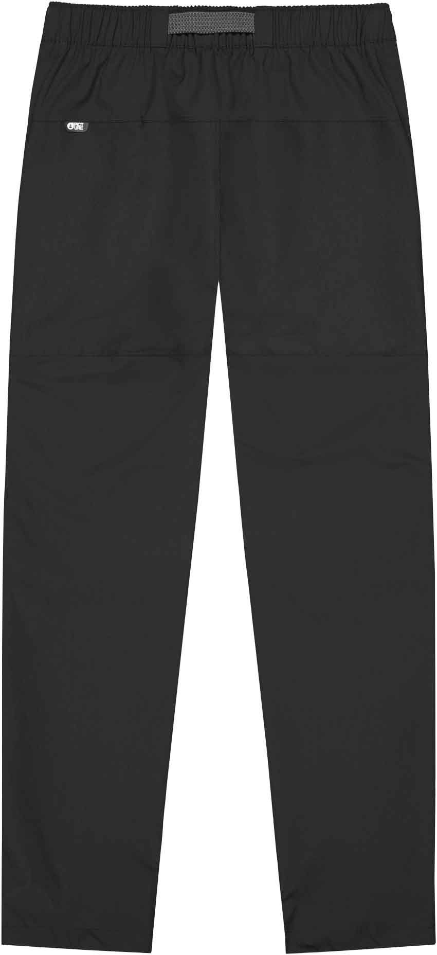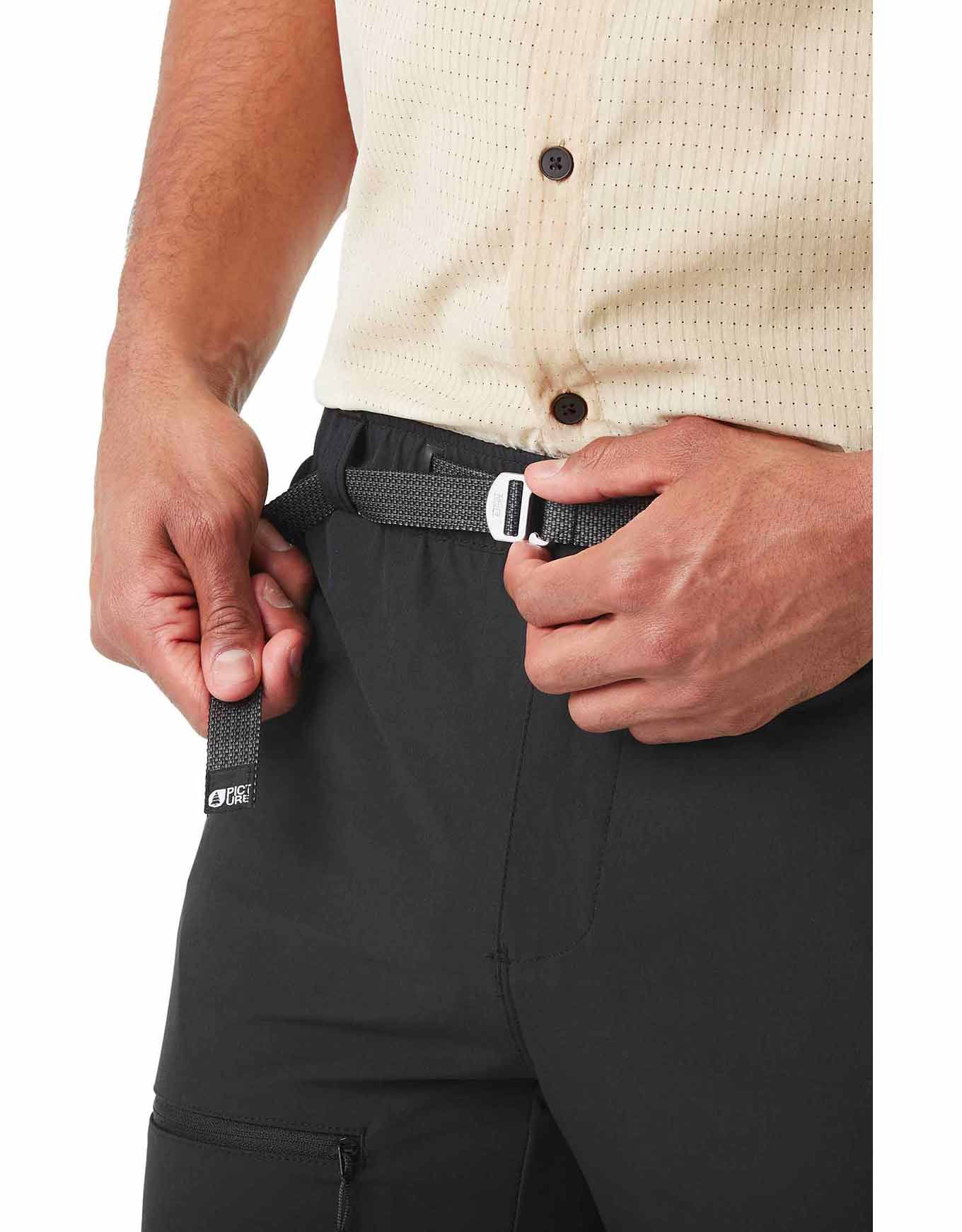 Le pantalon technique Shooner Black pour homme de Picture Organic Clothing allie nylon recyclé extensible et technologie Dry Now pour la randonnée : liberté de mouvement, séchage rapide, taille élastique et poches latérales zippées.